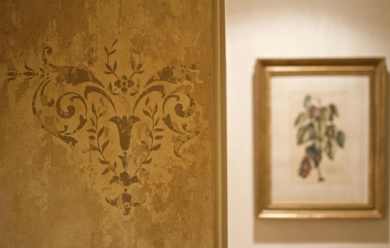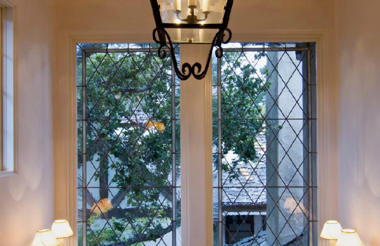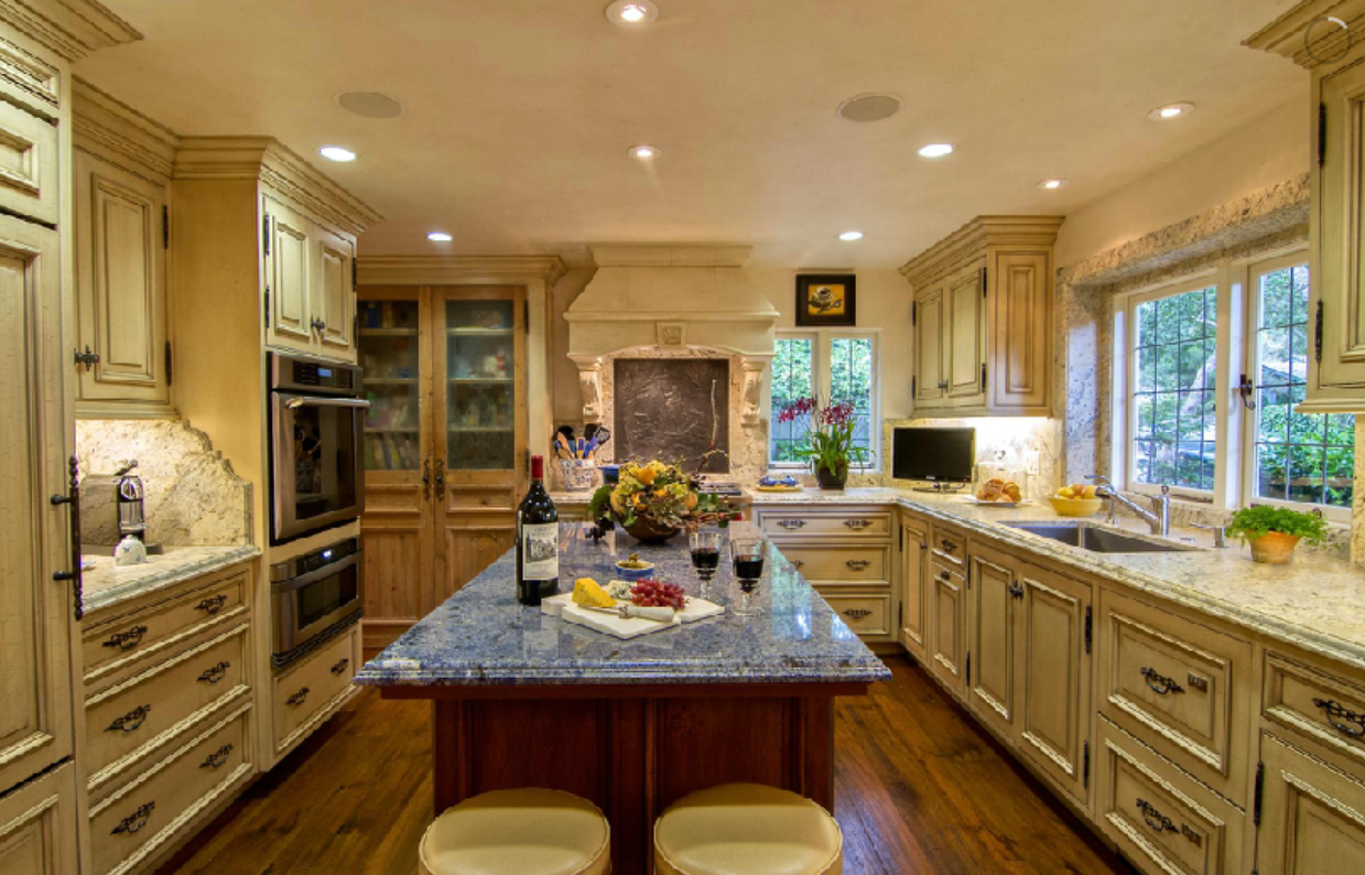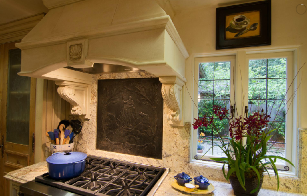 The kitchen has a European flair with its custom 19th century antique cabinets.