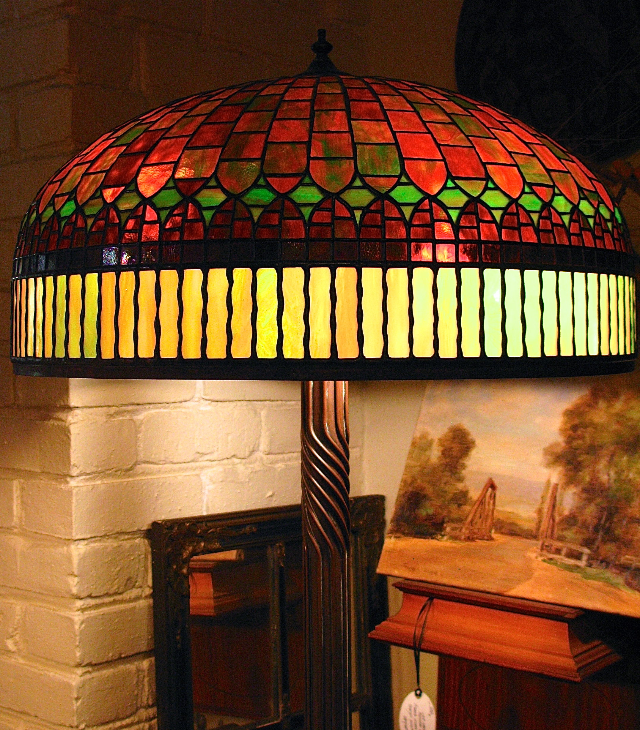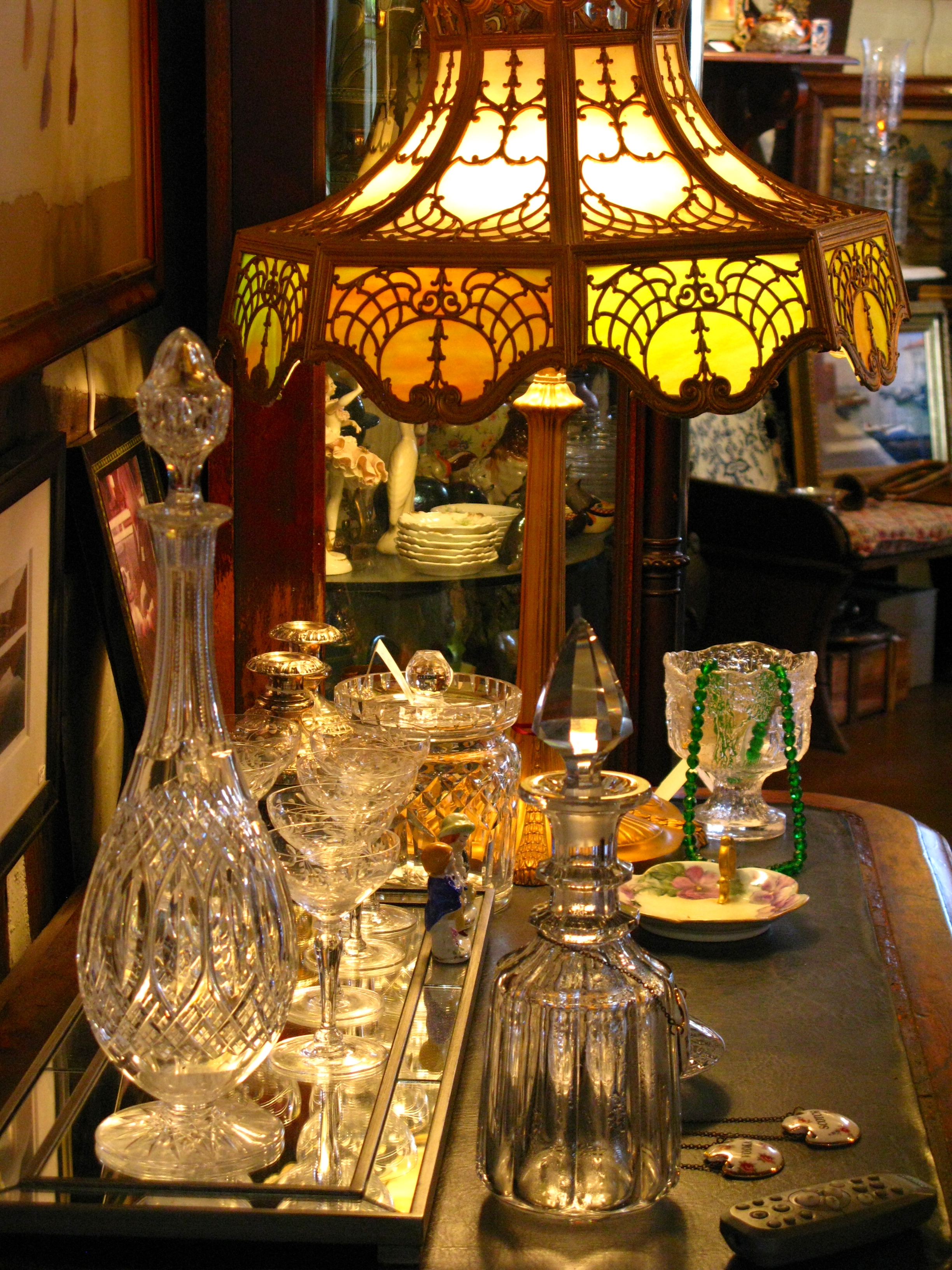 I ask about this stunning lamp with its 8 curved slag glass panels and extensive filigree and find out that it is a signed Miller. An American, Miller was first noted for his oil lamps but progressed with the times. This electric lamp dates around 1925-1935.