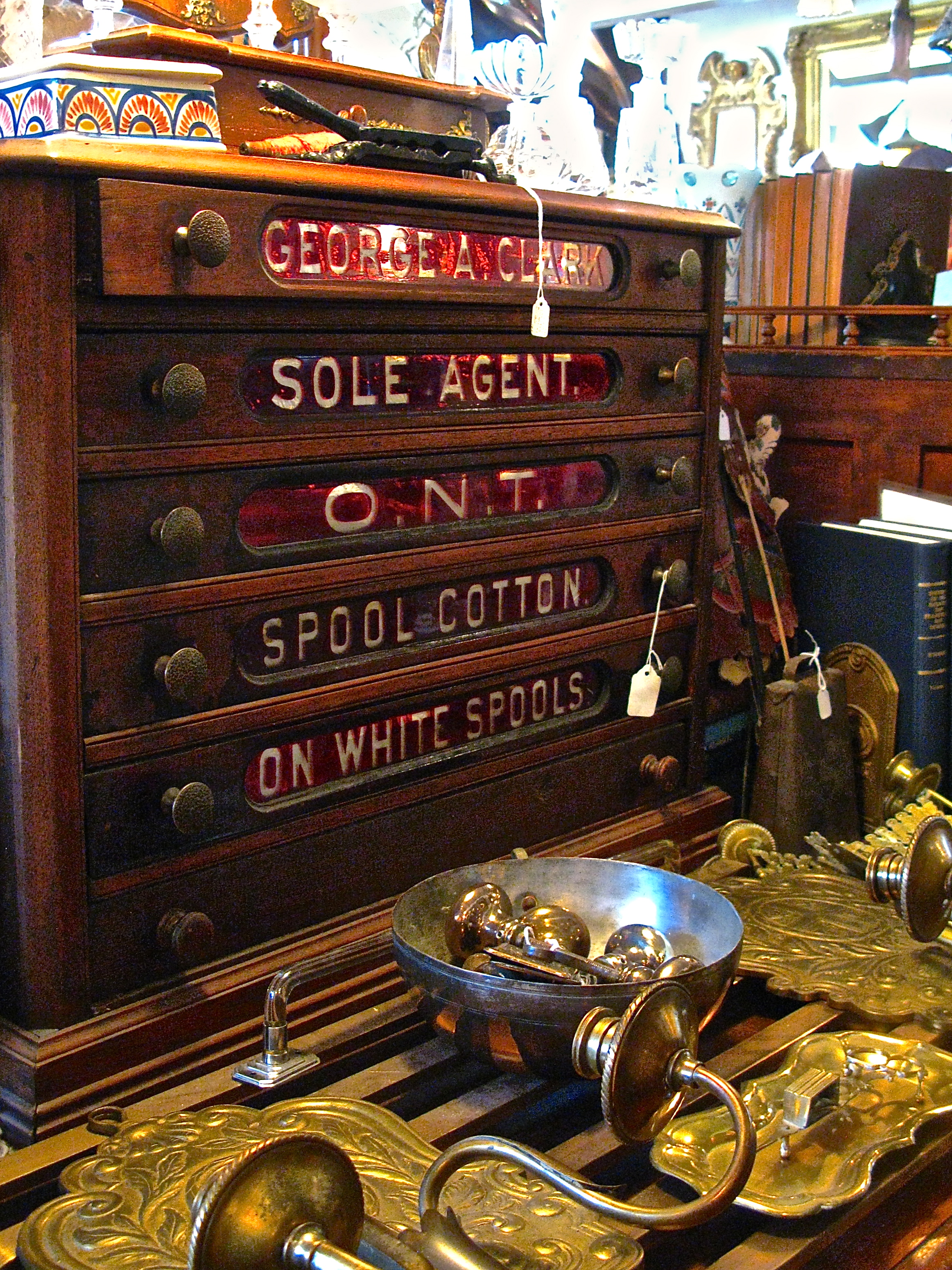 I believe my favorite piece is the George Clark spool cabinet C. 1880-1910. These cabinets were mainly found in general stores. The O.N.T., third drawer down, stands for Only New Thread. The customers would come in to the store and look in this drawer to see what new colors were available that month. These cabinets are now used for side tables, coffee tables and the drawers used for scrapbookers, seamstress, Jewelry, etc.