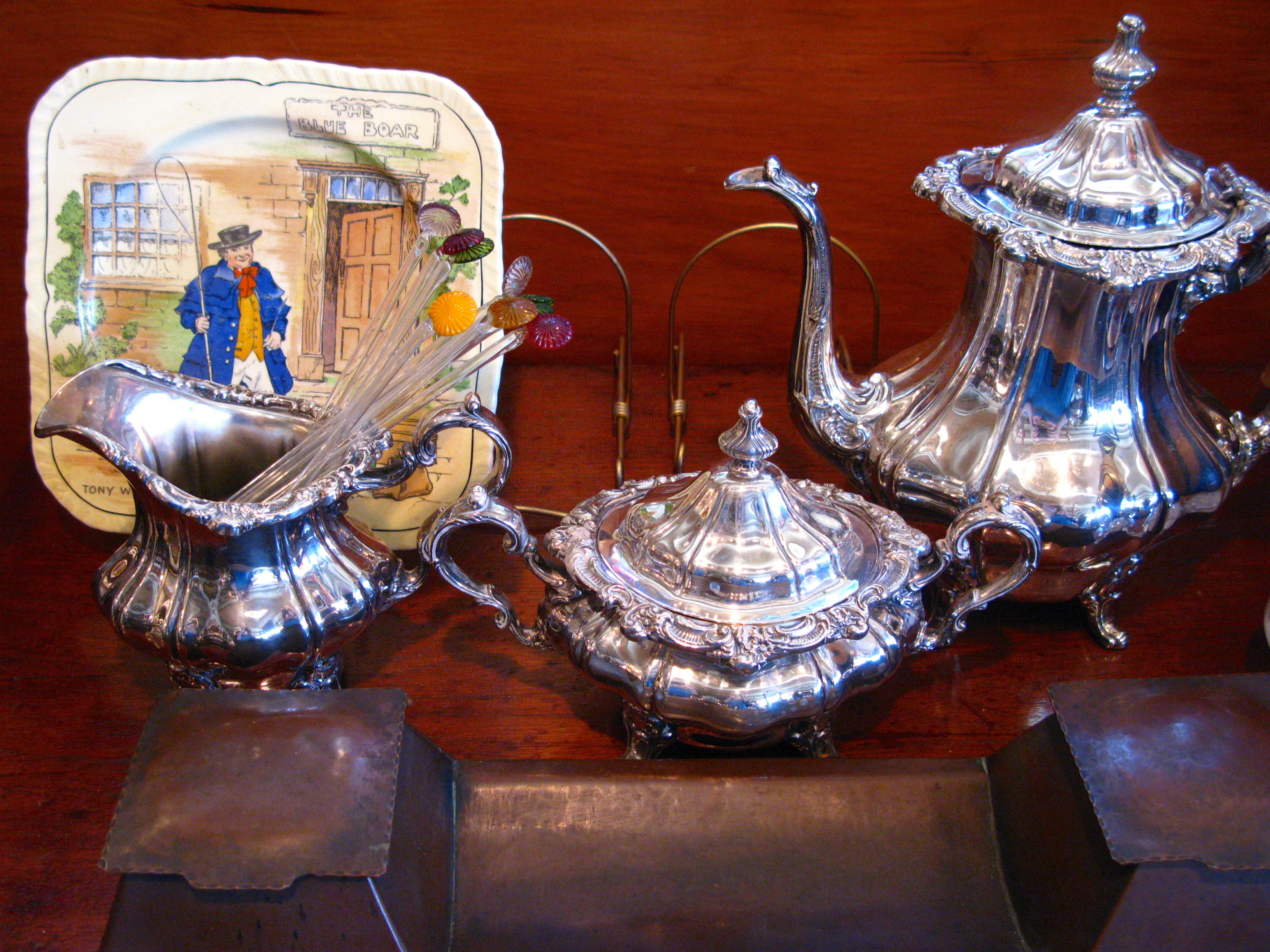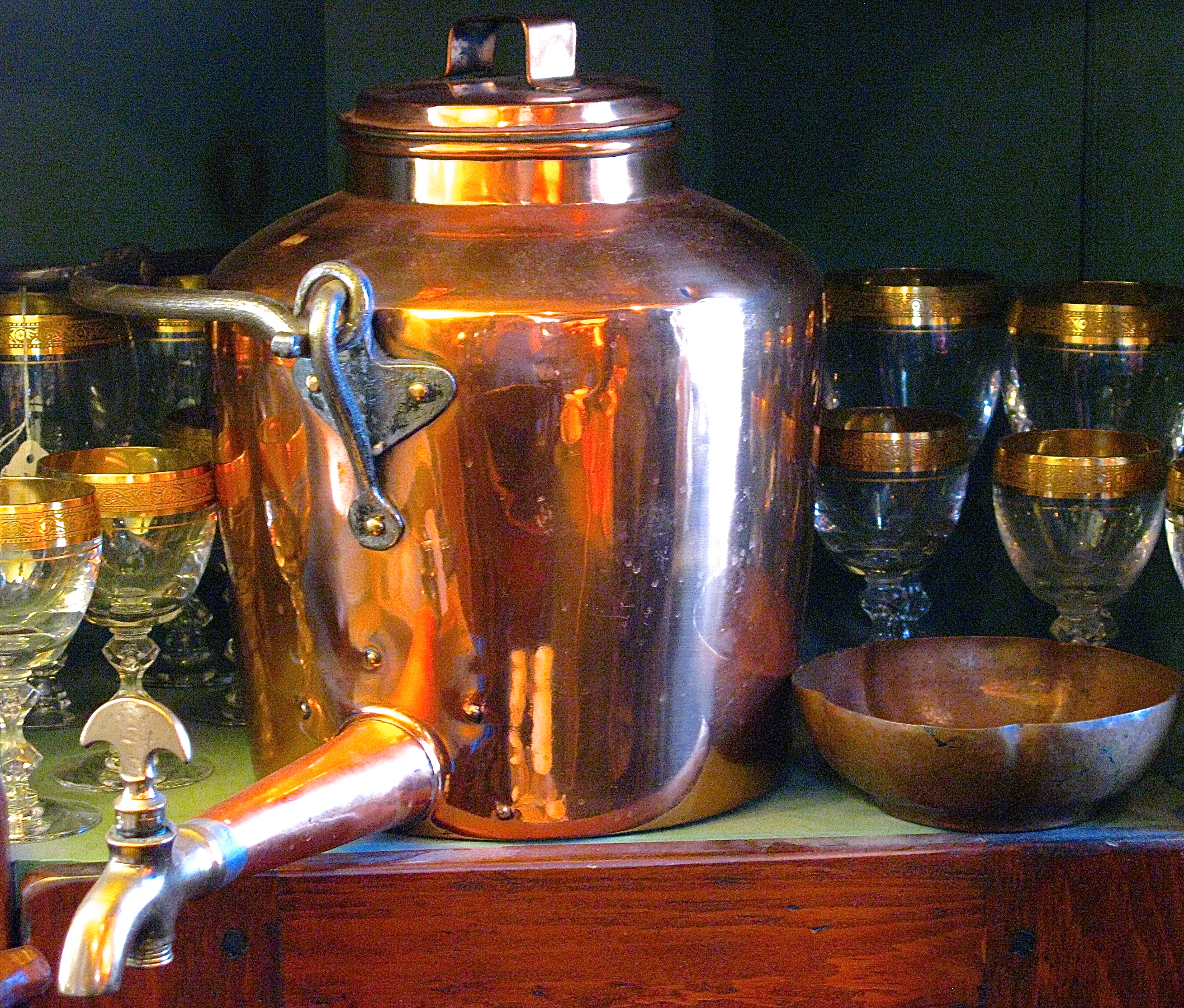 Copper such as this English kettle with spout that would have been used to heat water either over an open fire or in a fireplace.