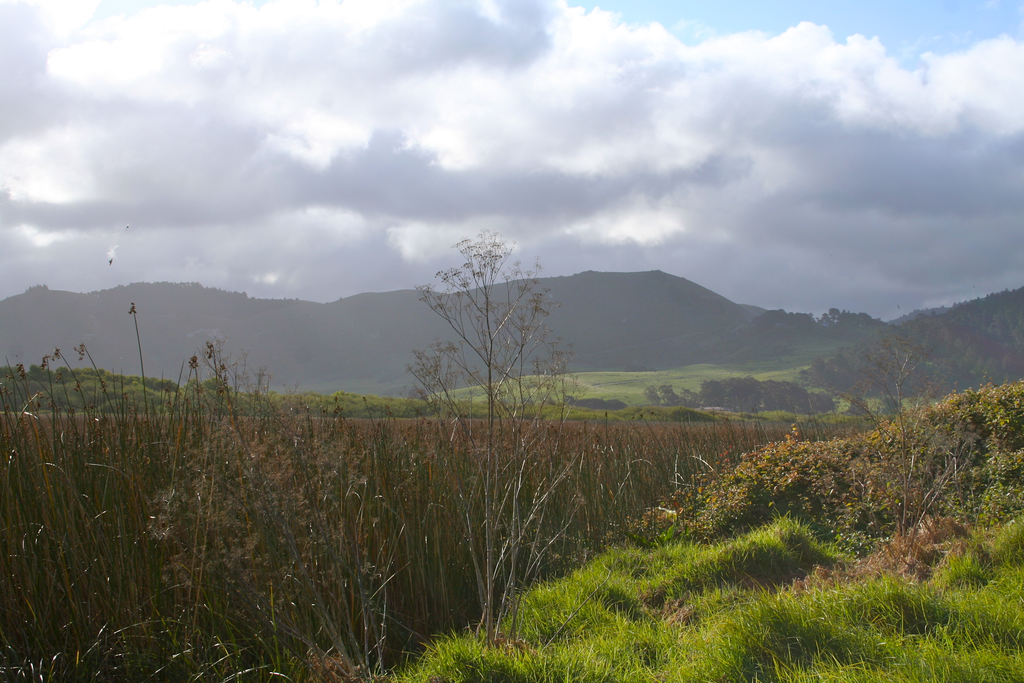 Inland, the reeds are backed by soft green hill and dramatic skys.
