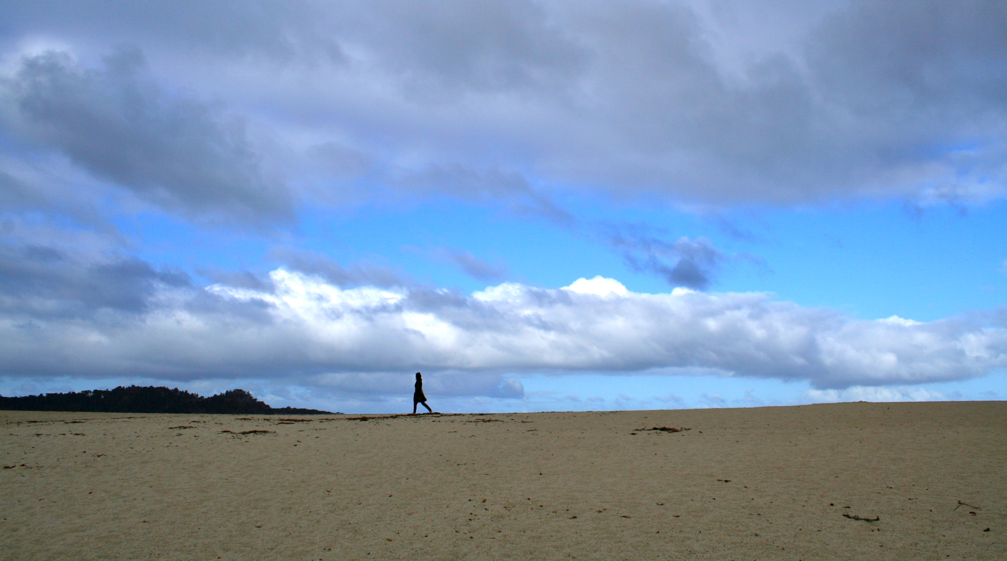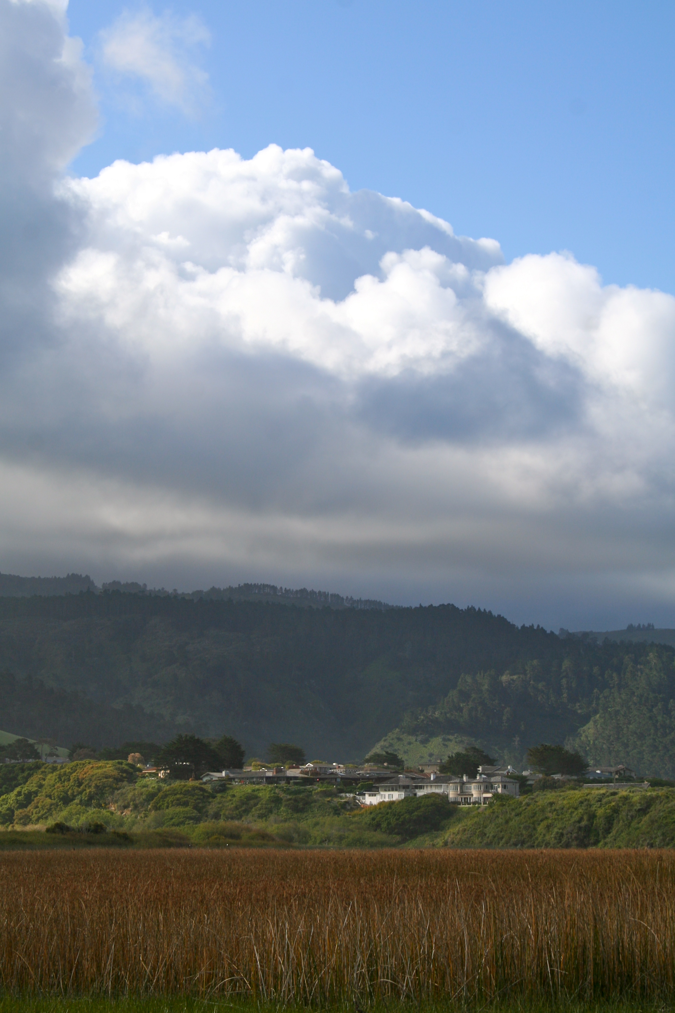 We have a completely different experience when we approach the beach from the opposite direction. At first we just notice tall reeds, green hills and clouds.