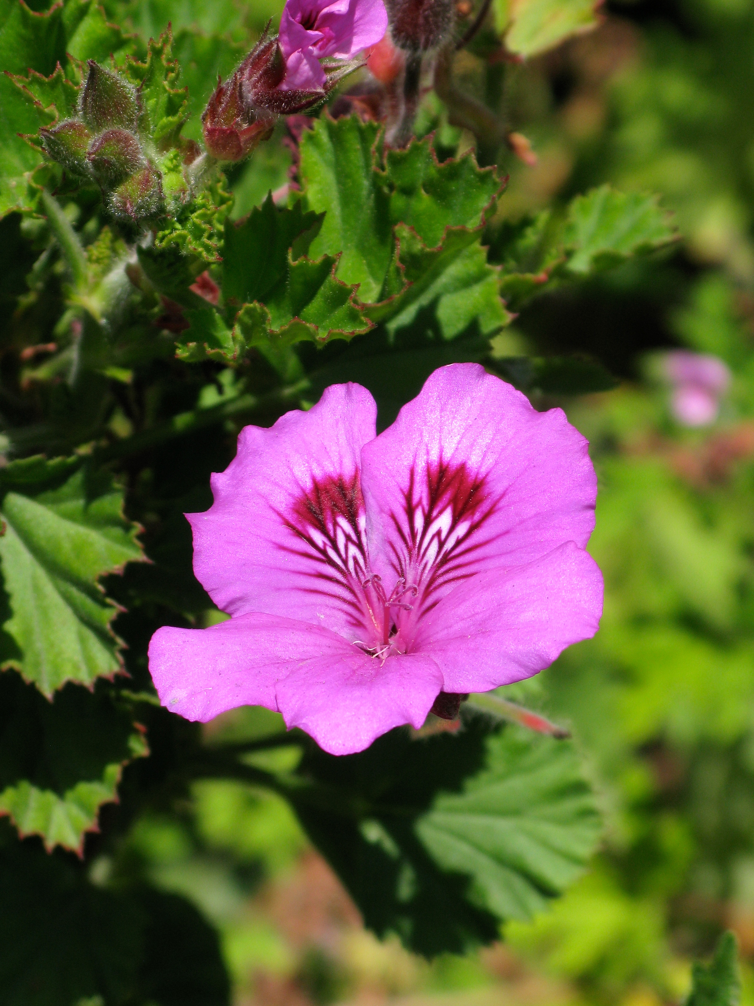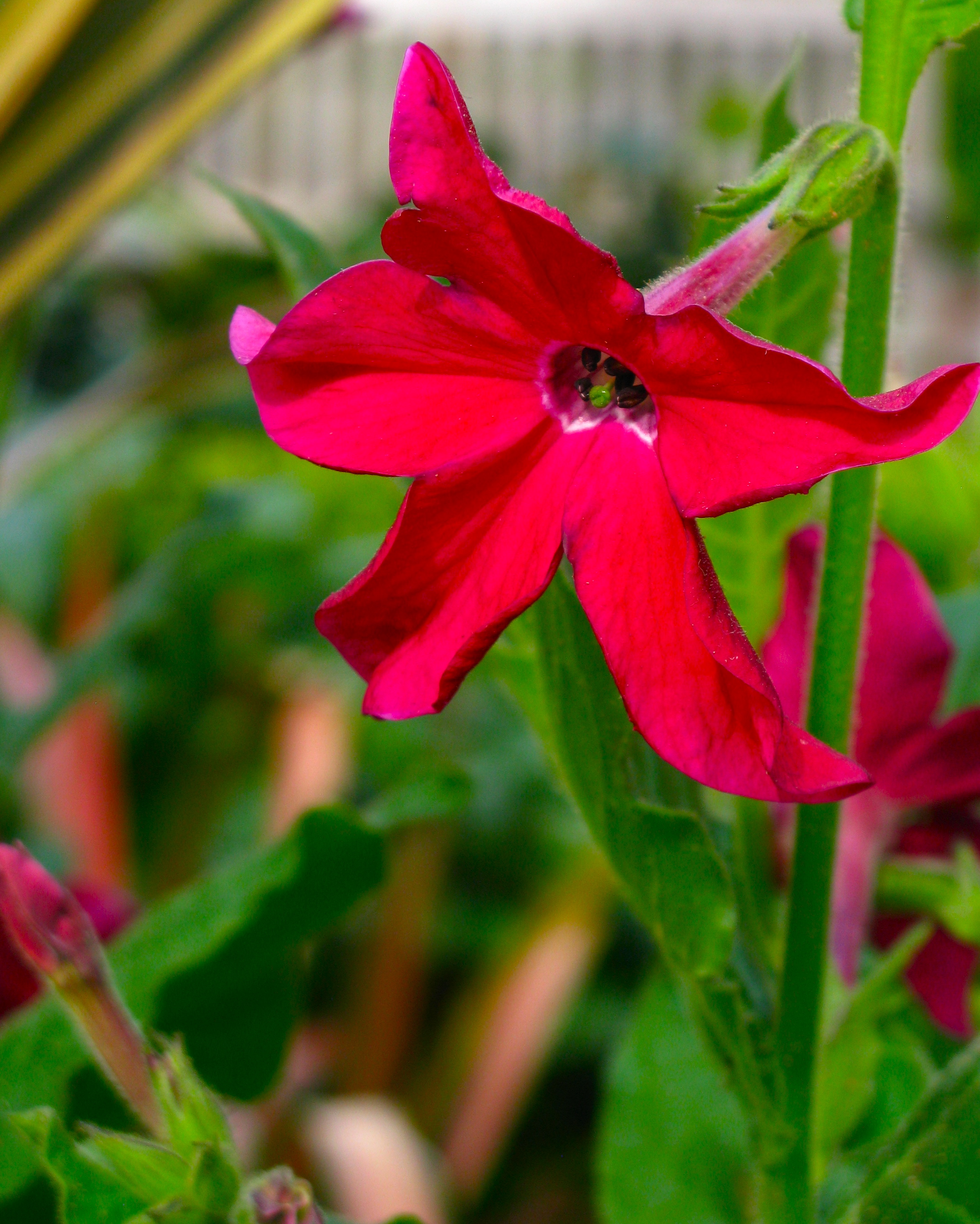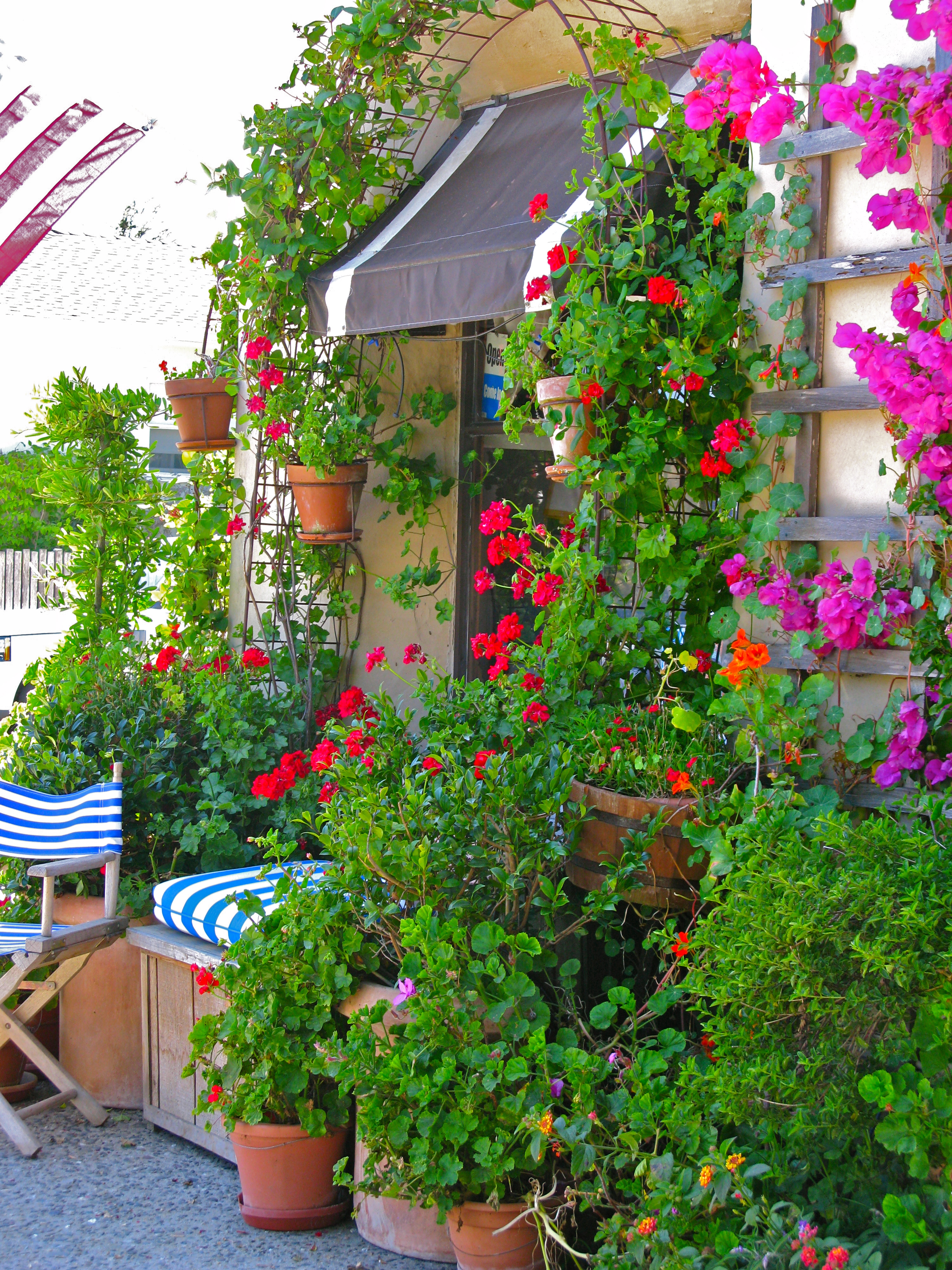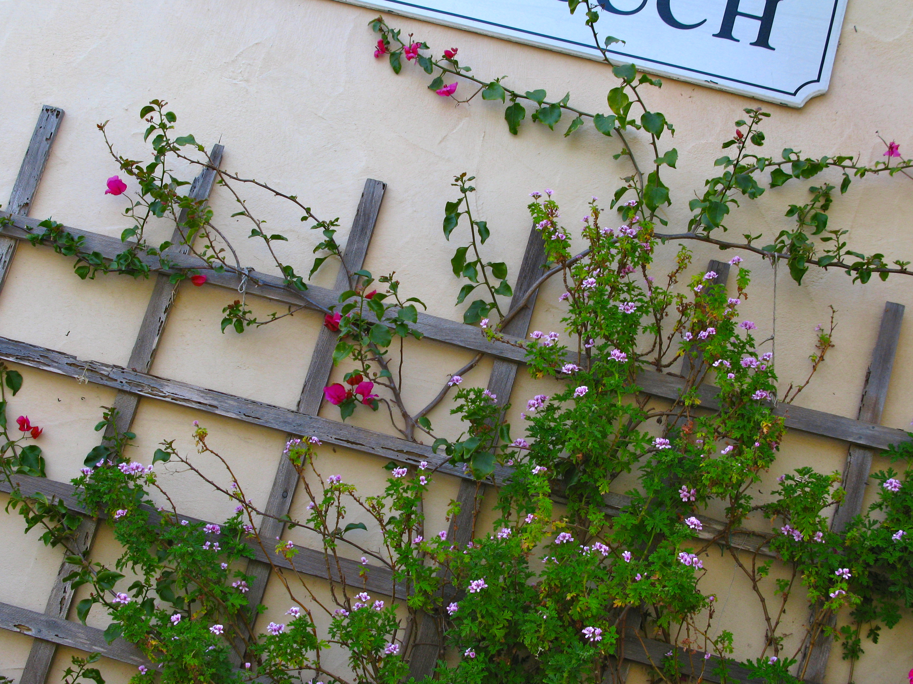 I am intrigued by the garden that is being created on this corner. I admire the owner’s attempts to “bloom where she is planted”. Pots of geraniums appear and trellis placed over the window. A small wooden bench tucks into the plantings.
