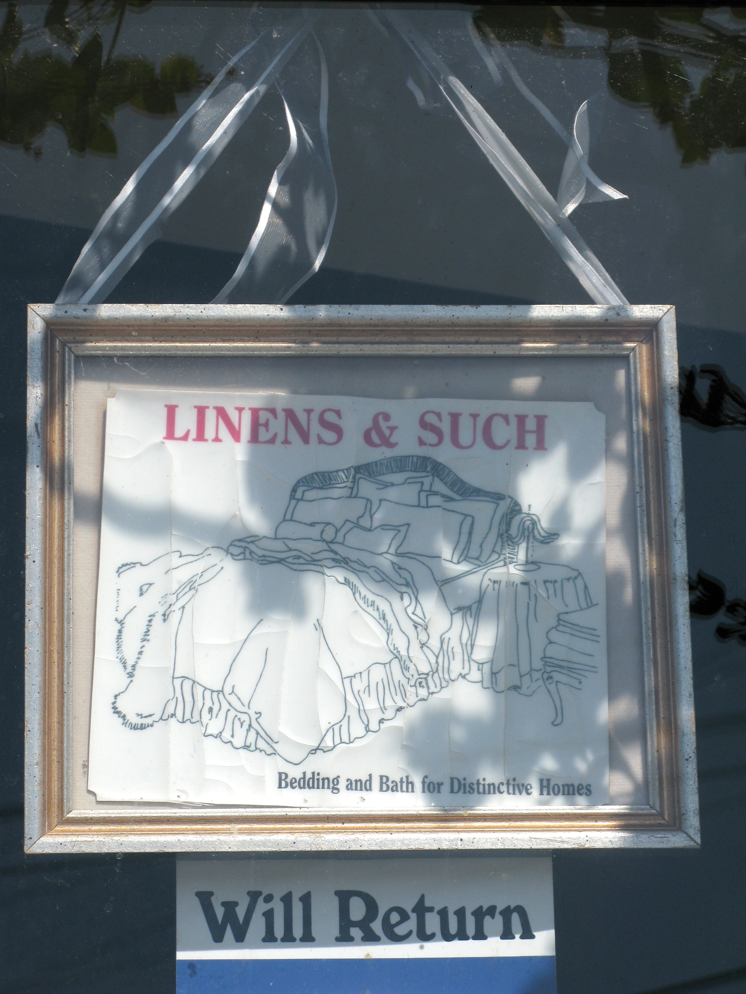 Dear Linda, Thank you so much for the delightful photos and honest comments about Linens & Such. It has been my pleasure to decorate the outside of my business for the eye-candy you captured. I love reading the comments to your blog by those near and far from Carmel-by-the-Sea. In August 2012 I added sewing notions captured from a wonderful store “FINDINGS” which sadly closed due to an auto accident. So now, besides ordering custom and bespoke, I can aid the thrifty or creatively bent homeowner with embellishments they can tack onto pre-manufactured goods, saving themselves a bit of cash. For instance today 10-17, I suggested how a customer could use the one lace curtain sample on sale to cover two doors. You know often two heads are better than one. Again, thank you so much for the wonderful mention of Linens & Such.