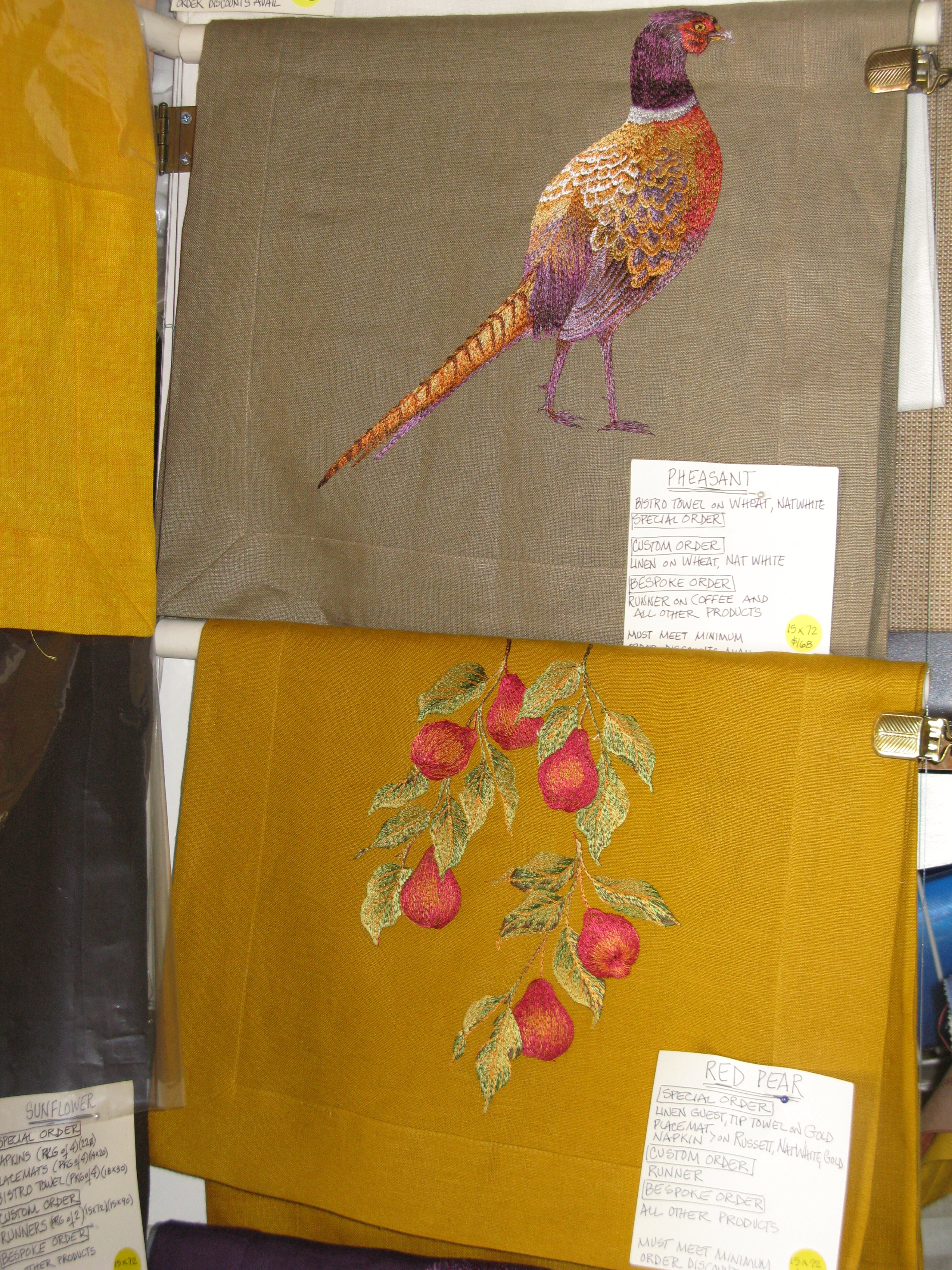 Her forte is helping customers with special orders, custom orders and bespoke orders. I am not familiar with the term bespoke and she explains that this means changing base fabric color of an embroidered pattern which is not shown in the manufacturer’s catalog and /or changing thread colors or scale of a pattern ,even asking the manufacturer to use one’s own design.