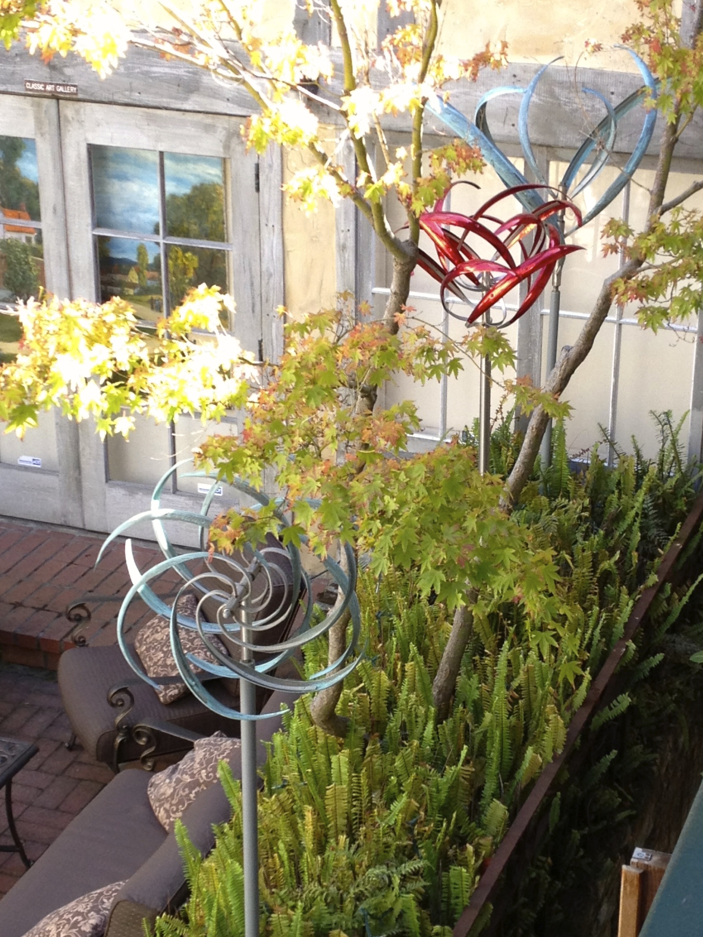 The Classic Art Gallery open to this pleasant space with patio furniture, brick floor, plantings and art.