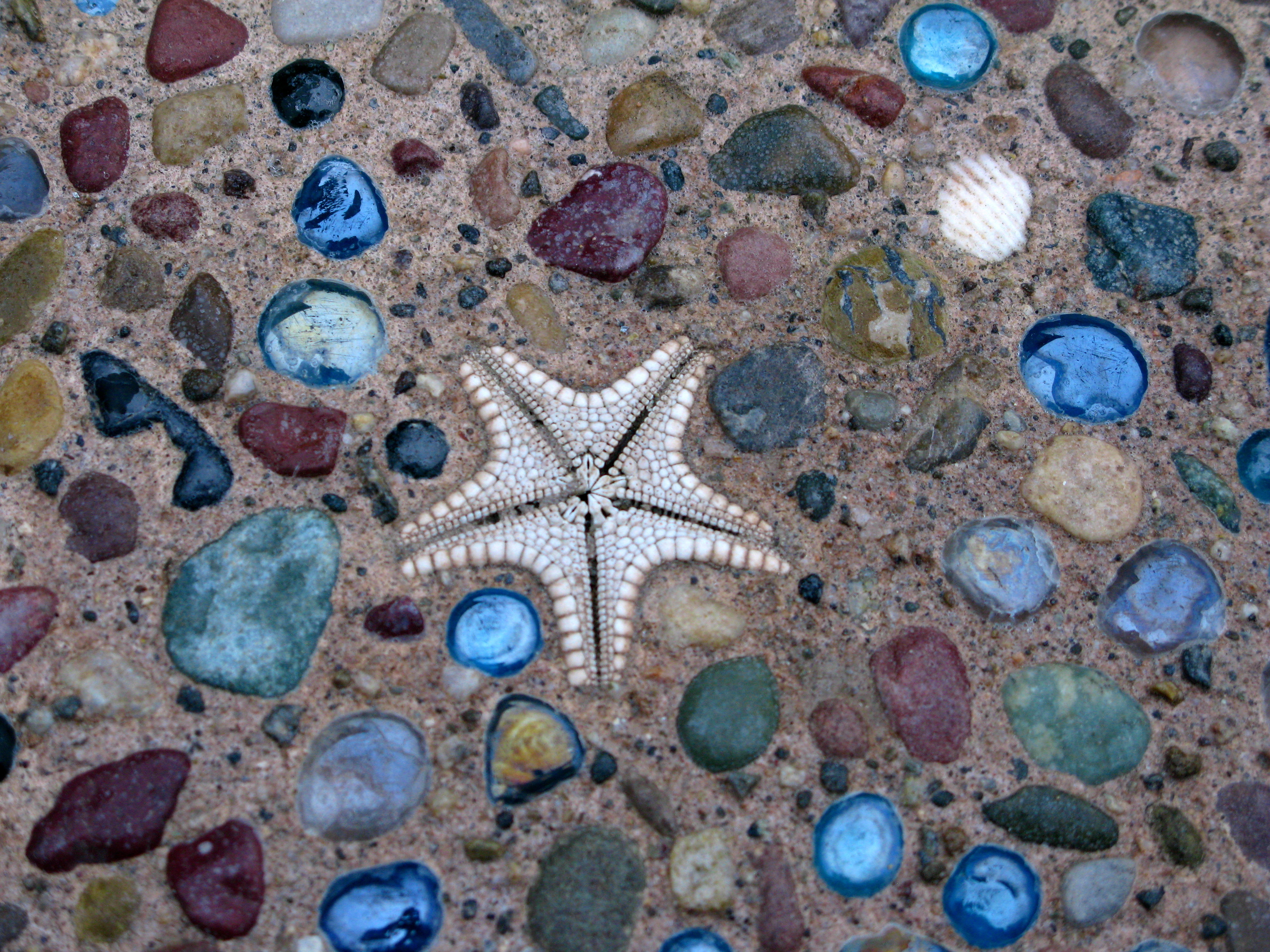 A friend of ours created this smashing concrete path and embedded shells and stones she collected from all over the world. She placed each one individually. A real labor of love.