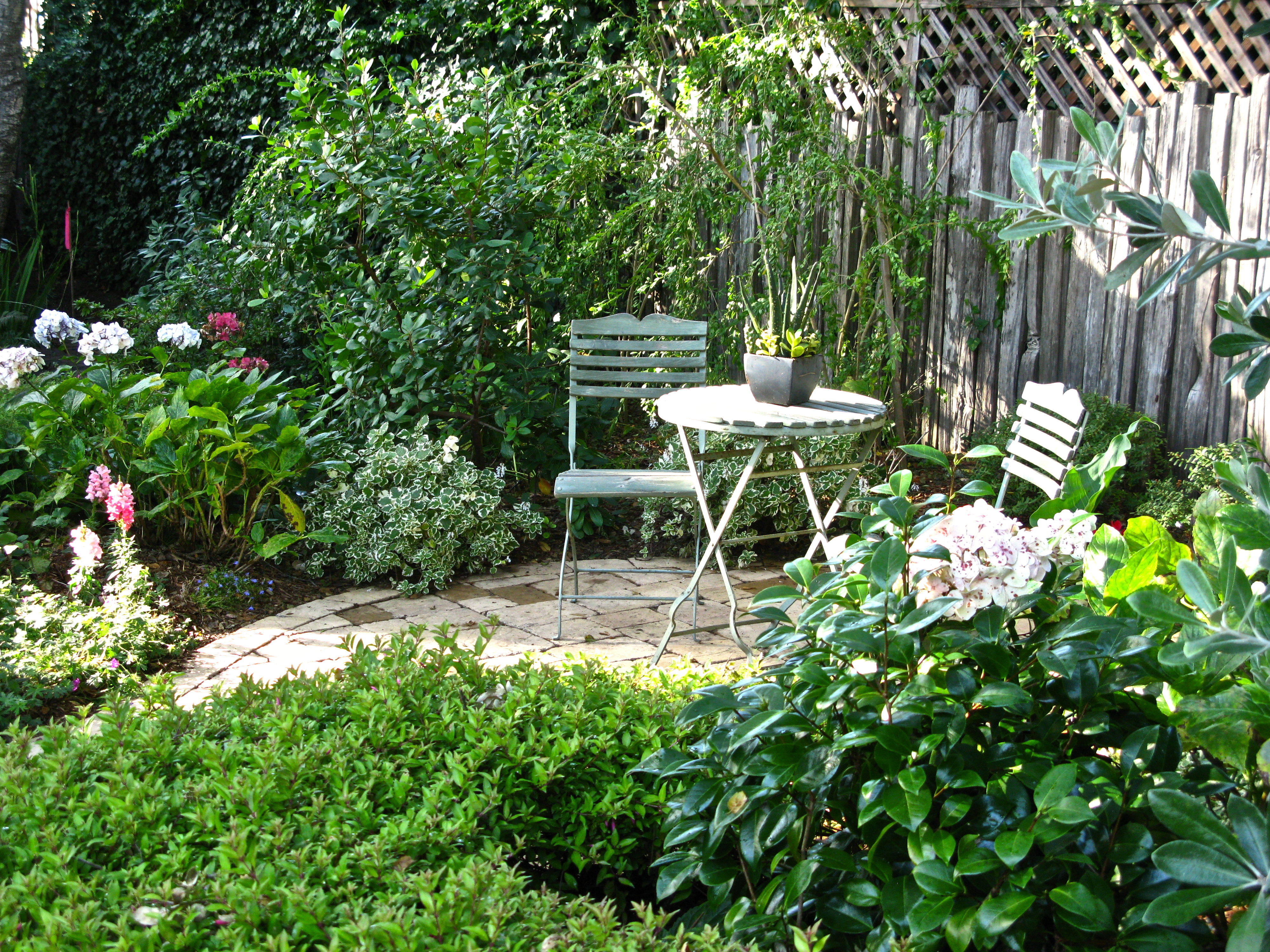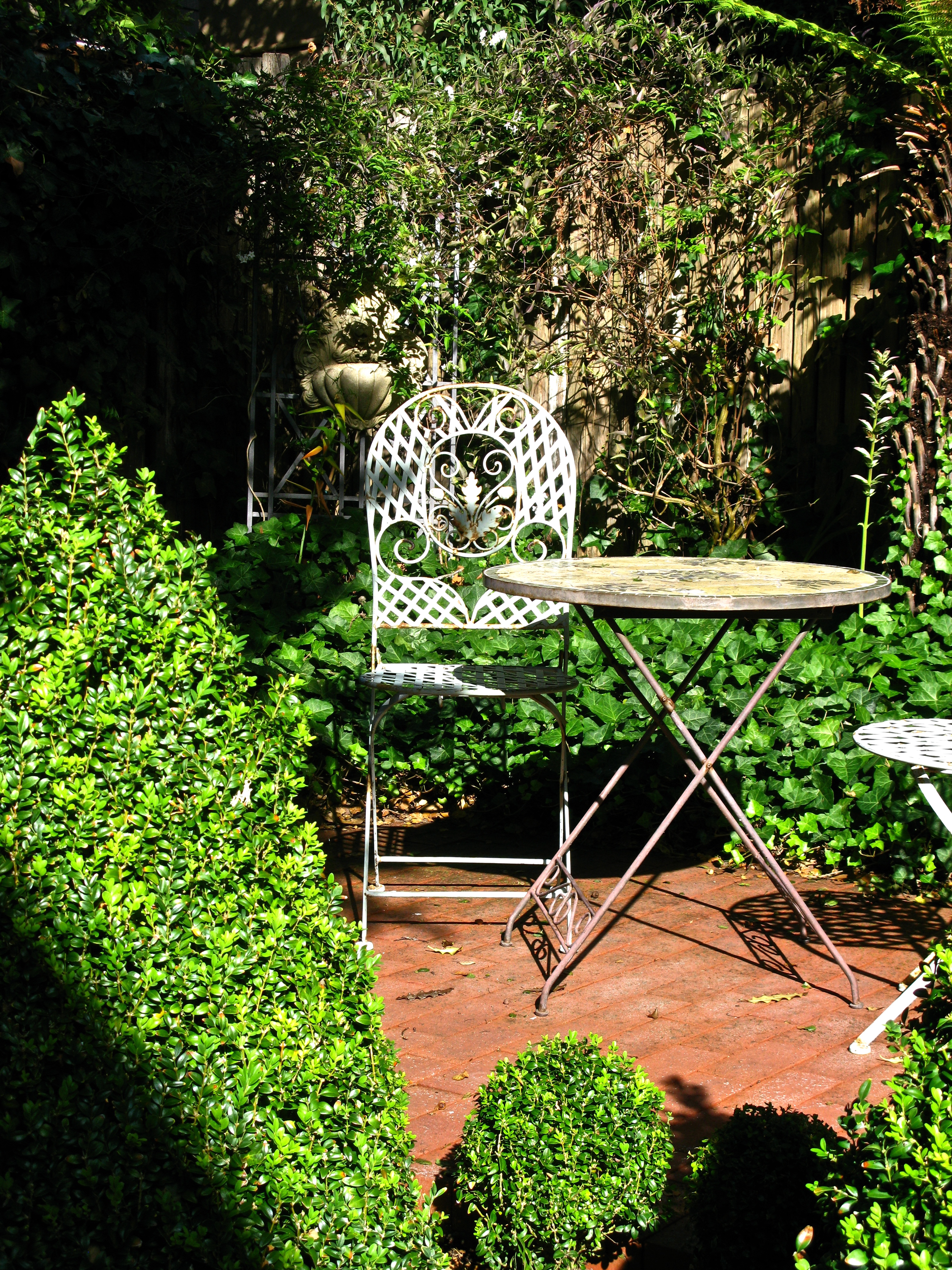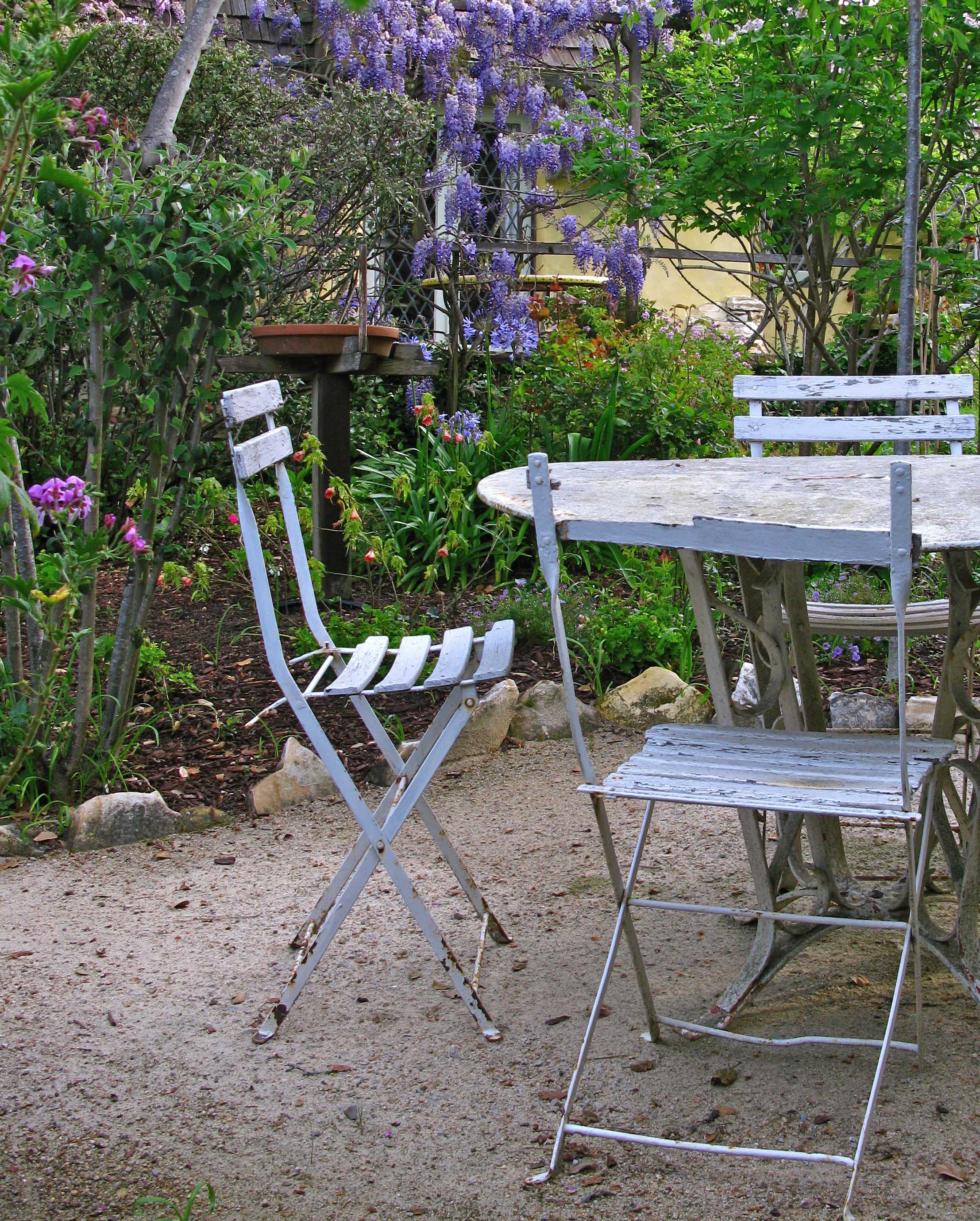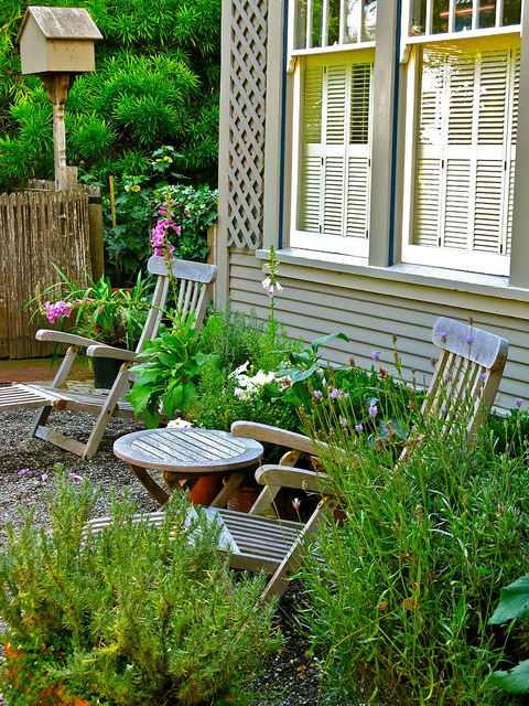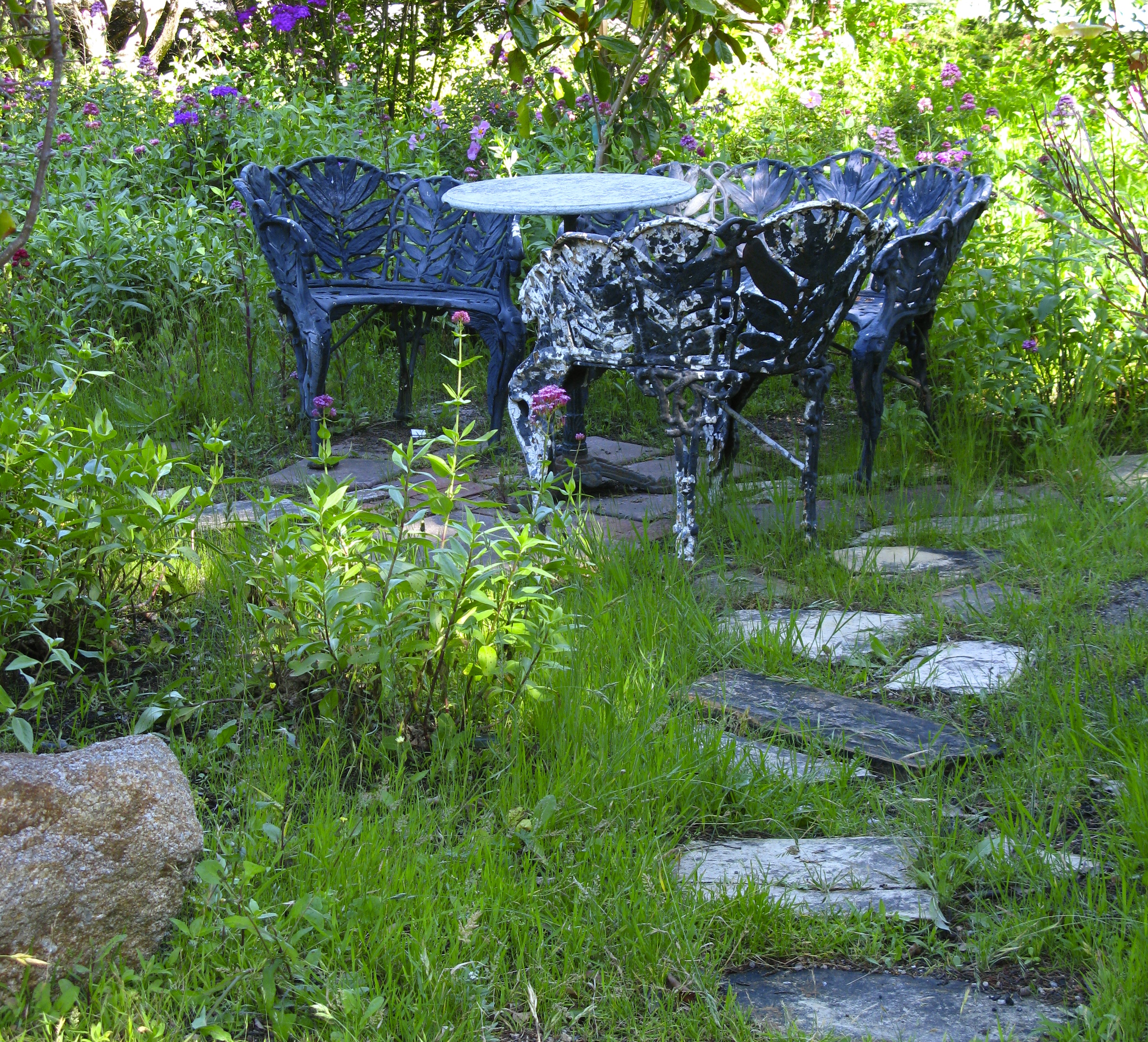 A spot to sit. This spot in front of the cottage window hides the view of the street beyond and creates a charming view from within.