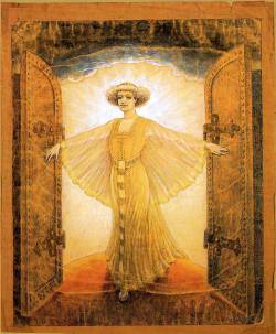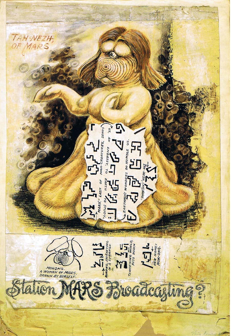 After World War I, Wallace builds the small cabin in the forest near Carmel, California, which he uses as a laboratory for experimenting with telepathy, which he sometimes refers to as “mental radio.” He makes hundreds of drawings, charts, diagrams, and writings, attempting to reveal the patterns of life, including reincarnation, communication with intelligent life on other planets, and with dead spirits.