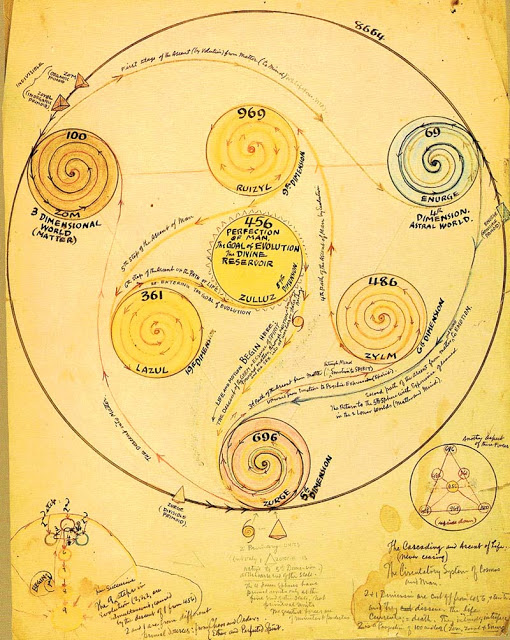 After he dies August 12, 1954, in Berkeley, California, These images, and literally hundreds more, are discovered by a relative of Wallace’s in the abandoned cabin. They are the result of Wallace’s private research (circa 1920s) into the worlds of philosophy, metaphysics and cosmology.