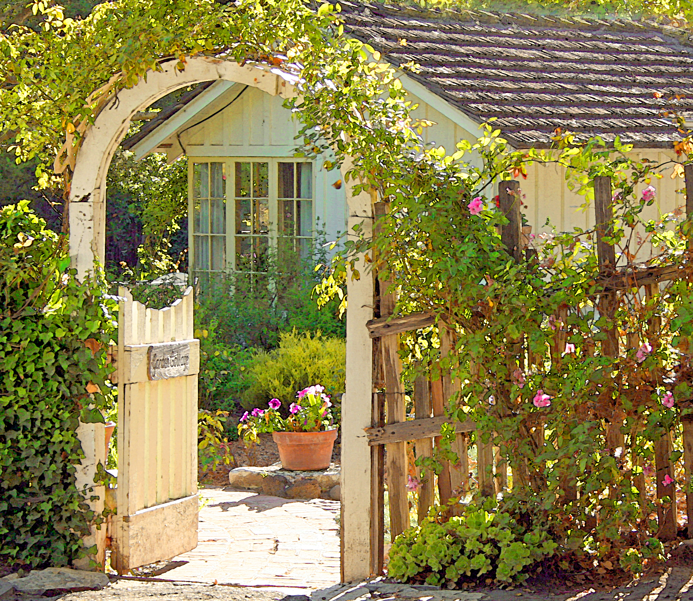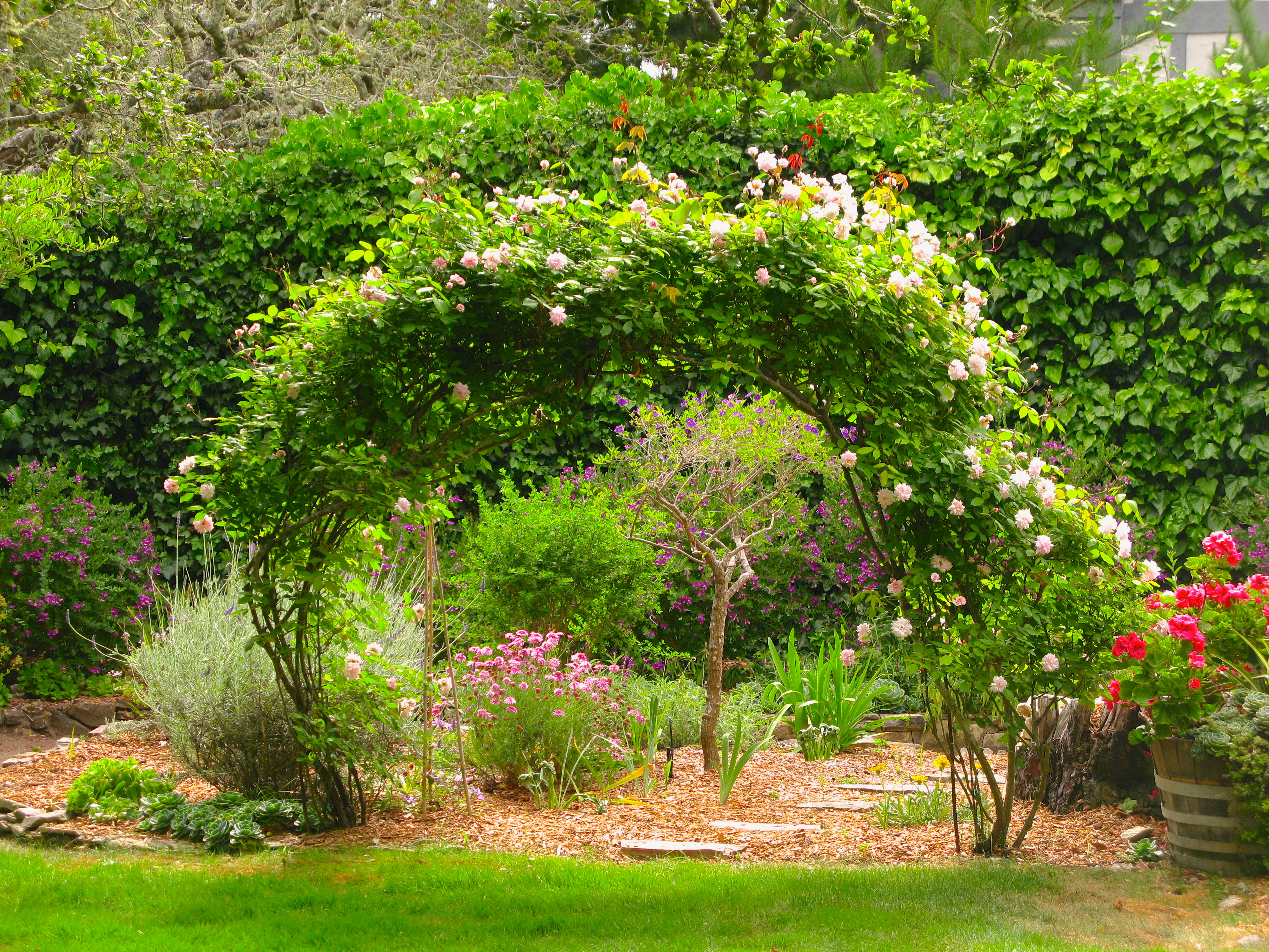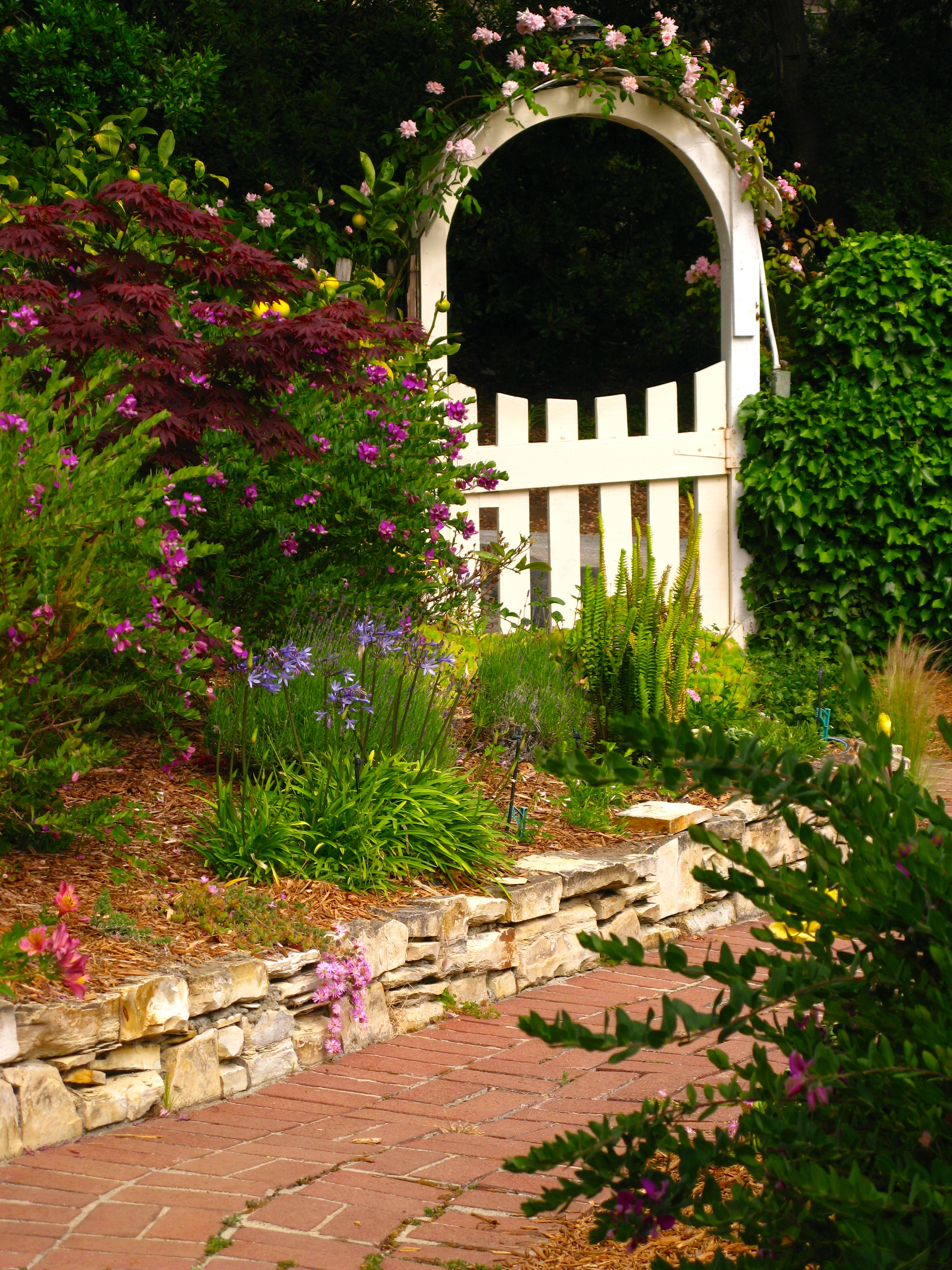 Looking toward the west side of the lot is a rose arch that beckons me.