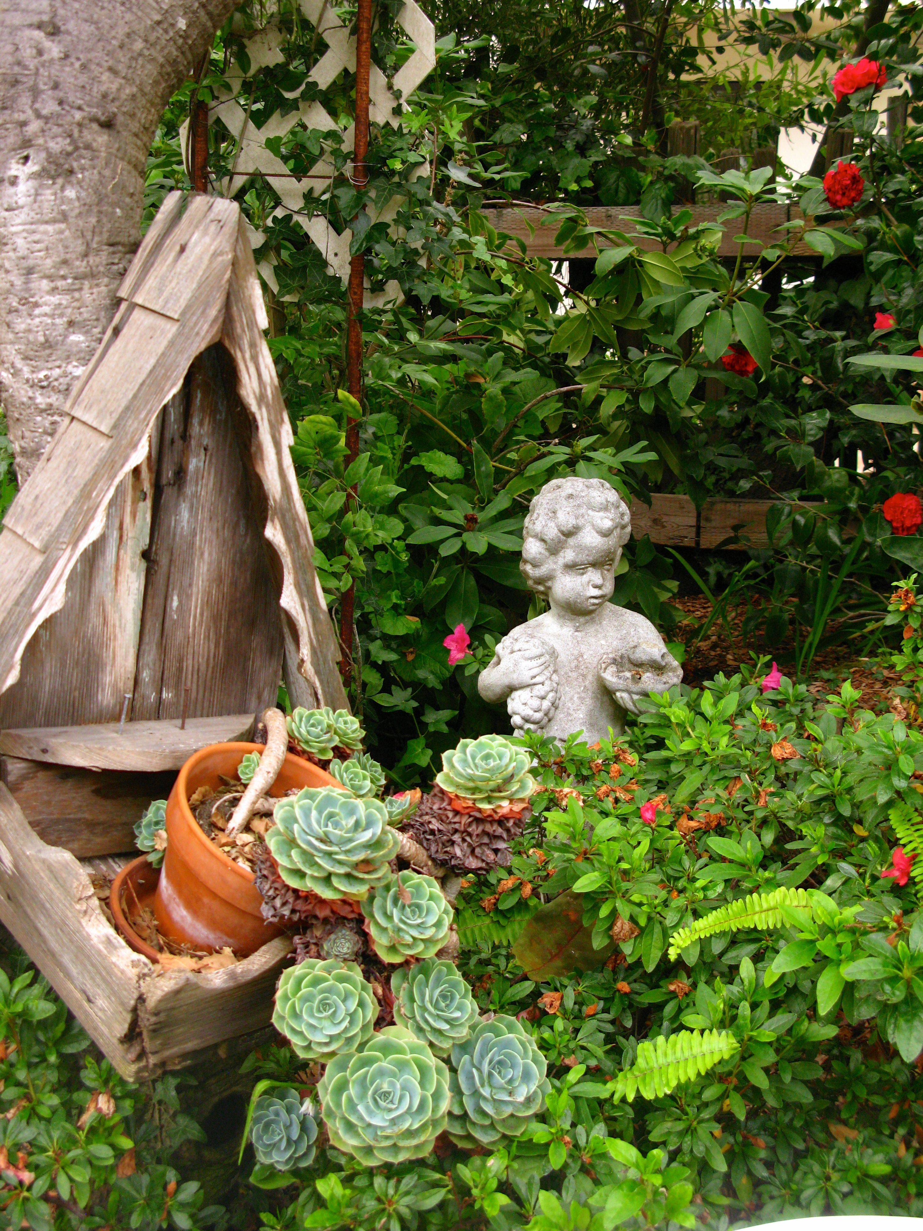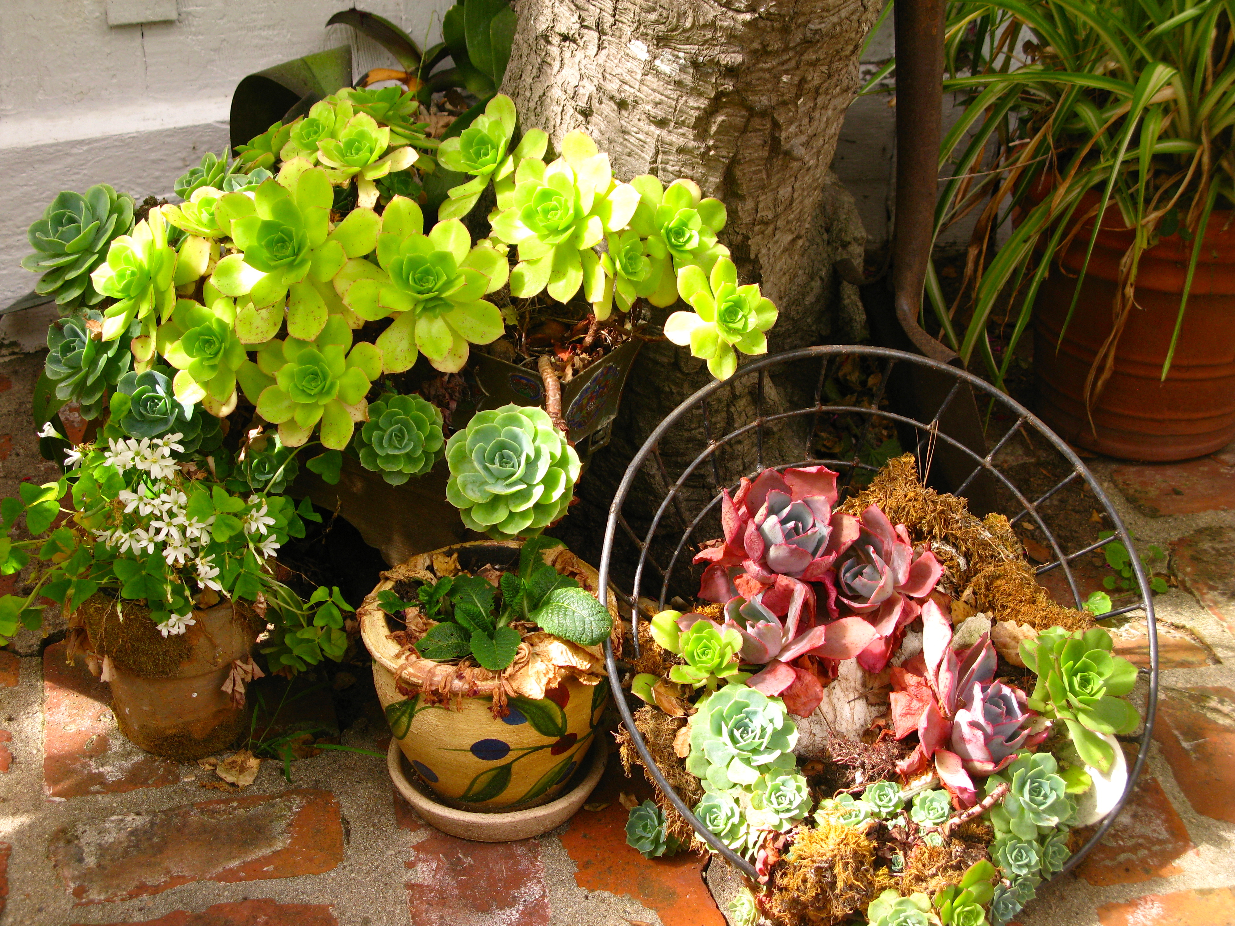 To the east is this tiered planter filled with potted succulents and cyclamen .