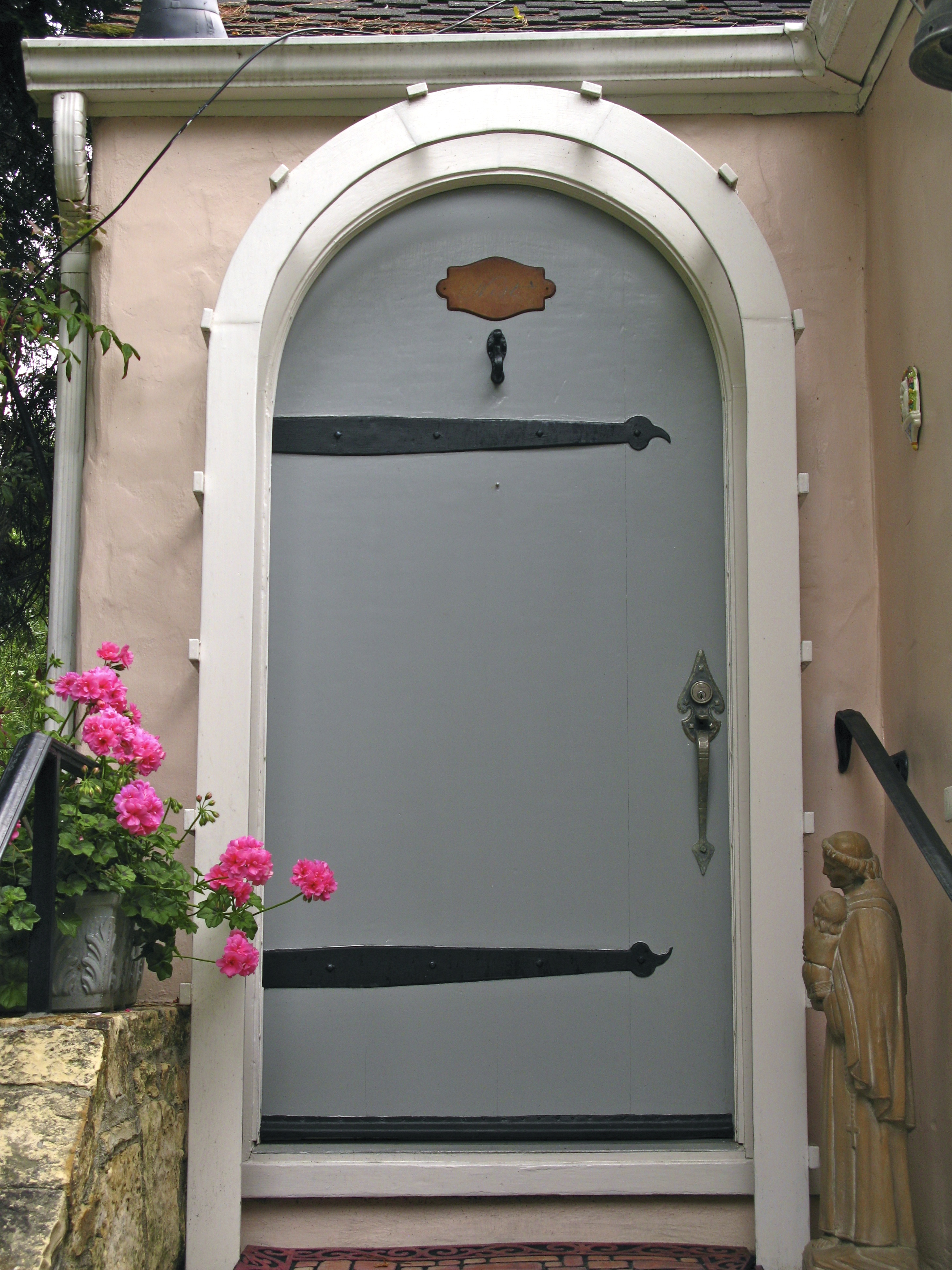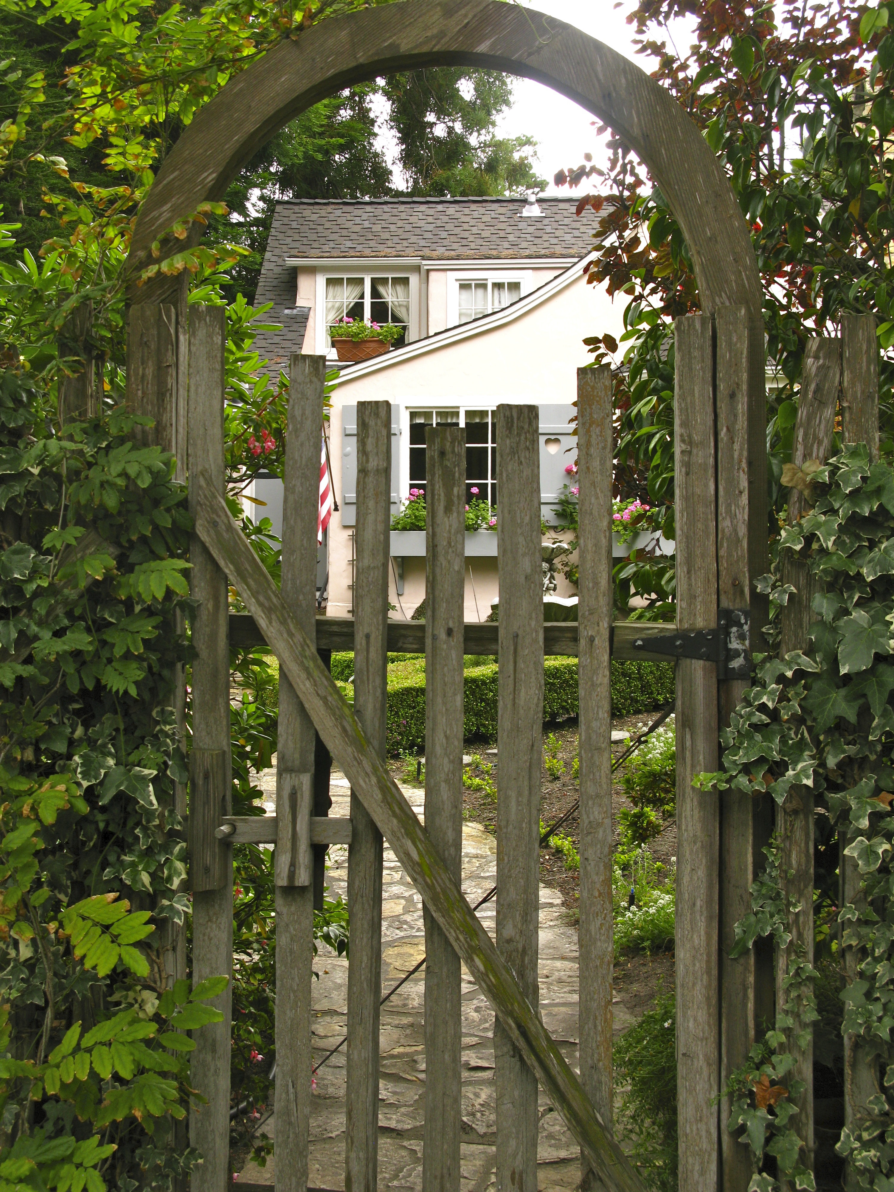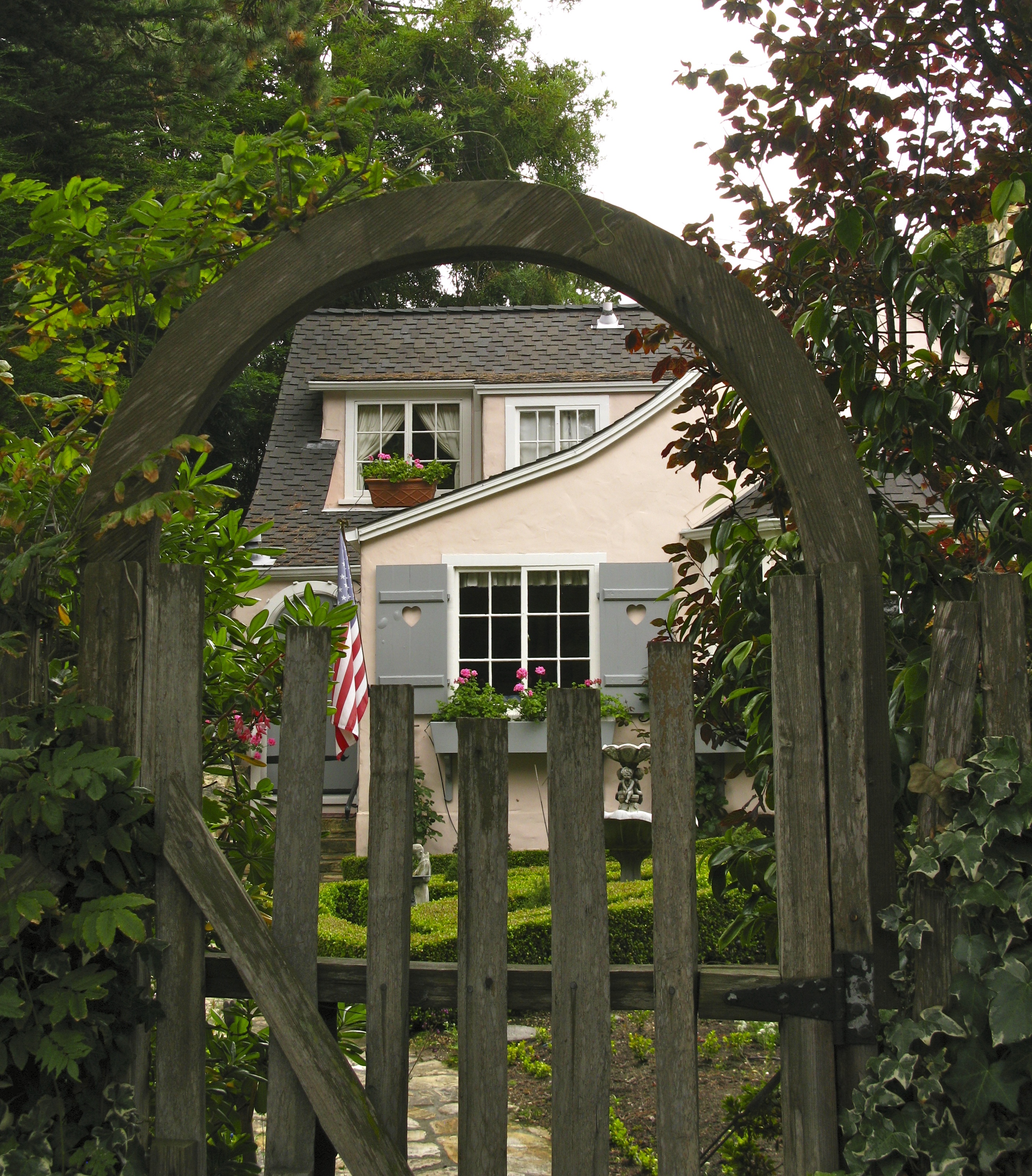Every time we come to Carmel, I wander by and ring the bell but my only greeter is a tiny , barking rat terrier who will guard this home with her life. I slip cards under the door each time to no avail.
