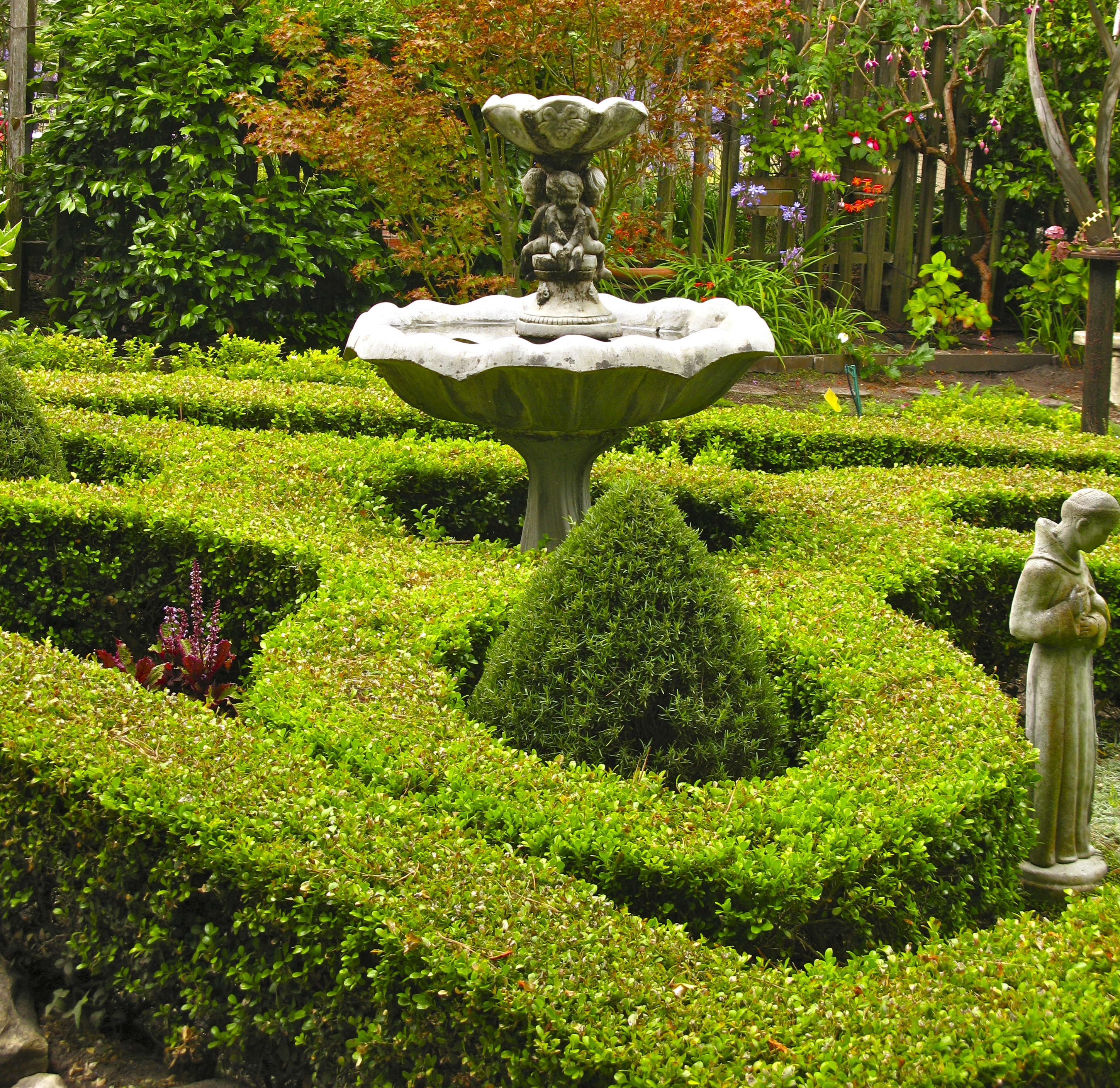 To my right is a formal boxwood garden