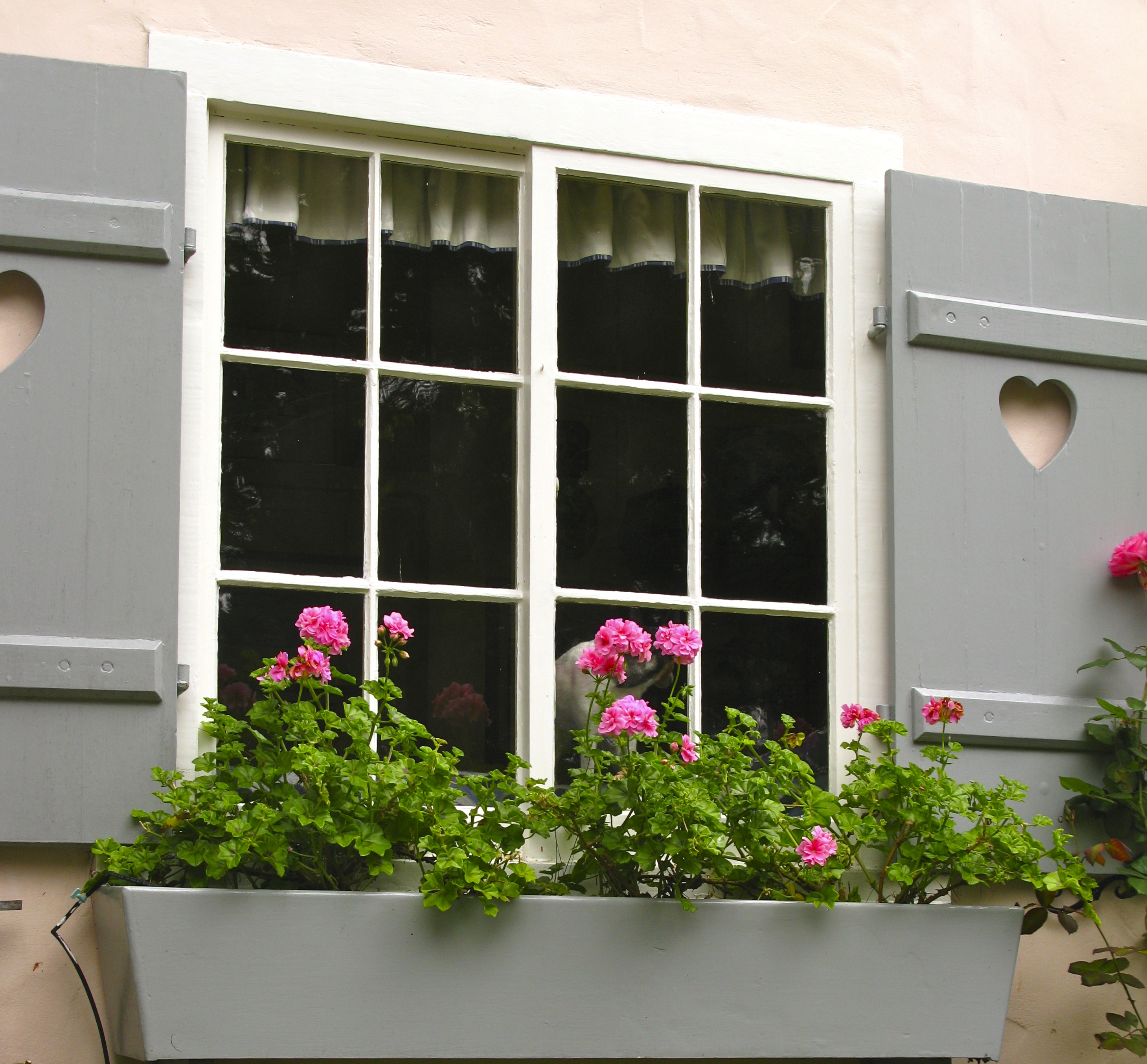I admire the geranium planted window box and shutters.