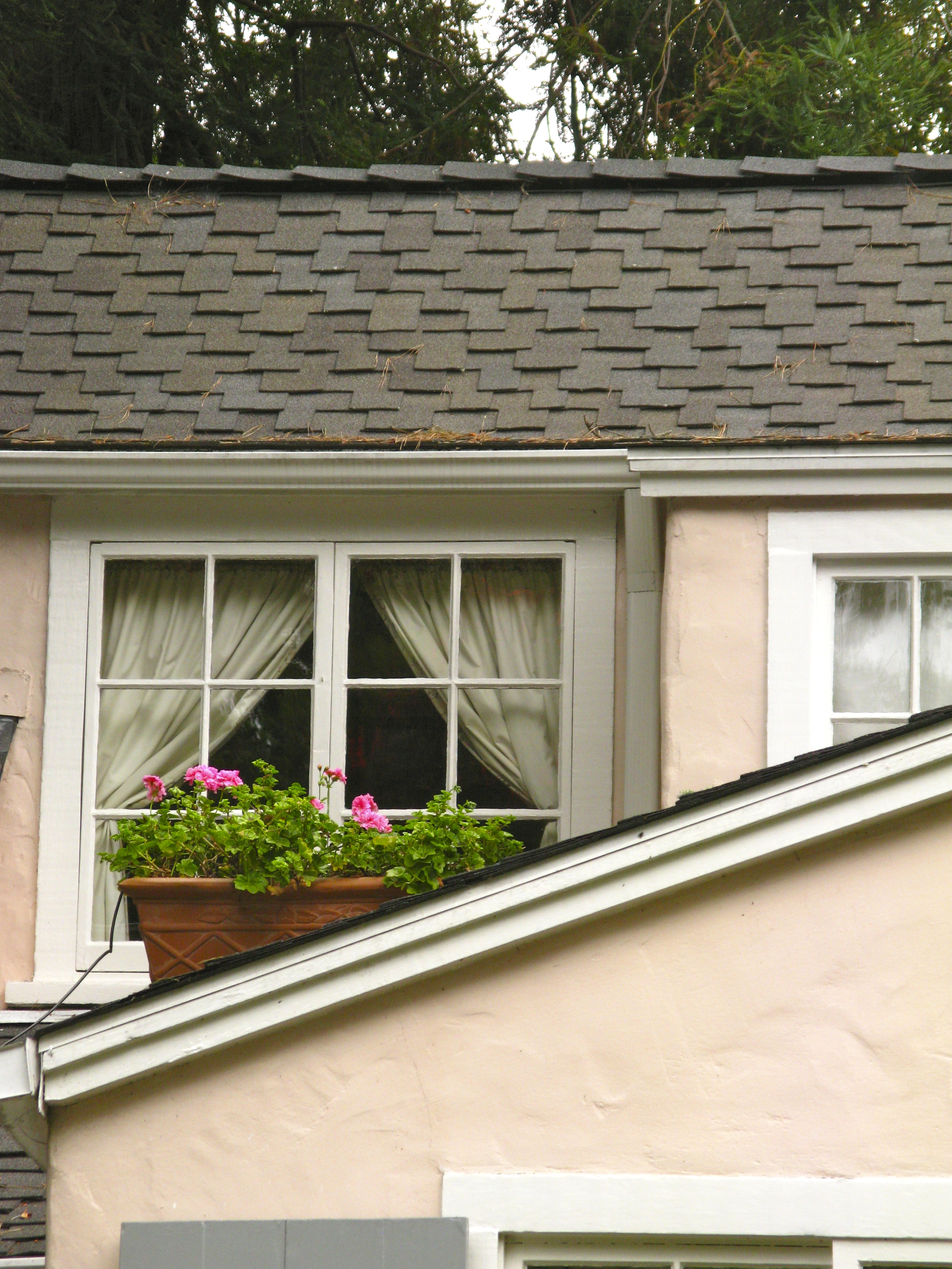 Even a second story window sports pink geraniums.