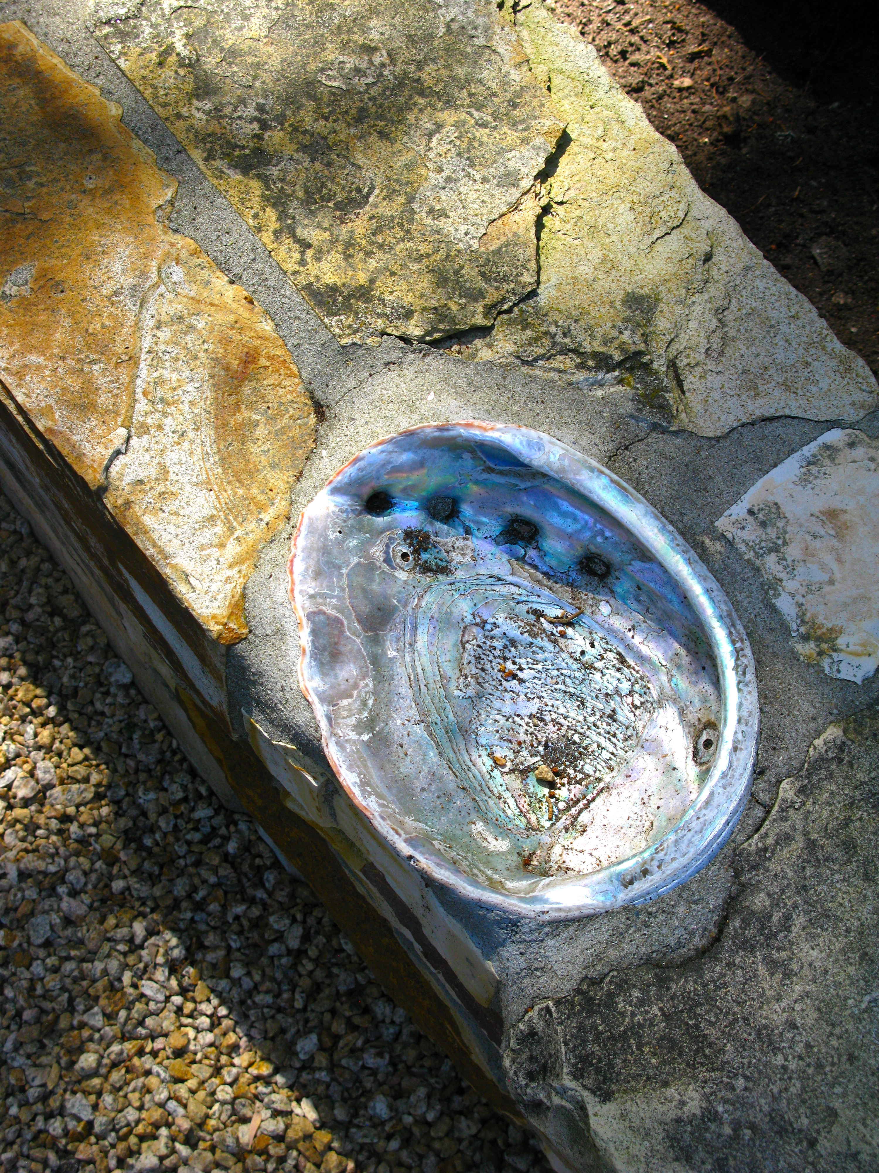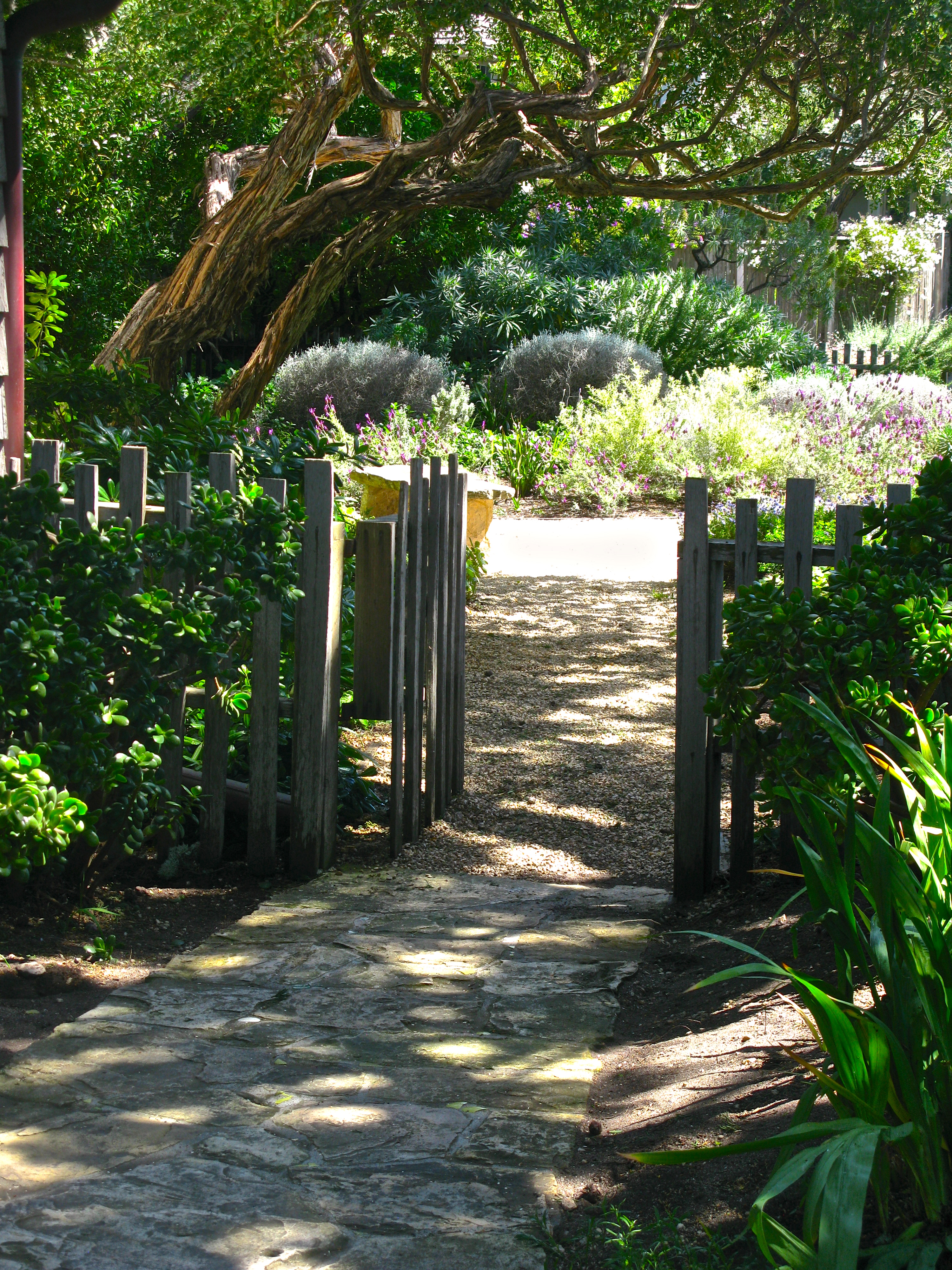 I come in the NE gate and sit on the bench to view the sun-drenched garden.  It has not always been like this. Marcia recalls,” my parents originally owned the property all the way to Rio Road. There were the two huge cypress and lots of wonderful paths and plants. My dad was an avid gardener and he had a green lawn in front but spent hours in the sun and in the garden”.