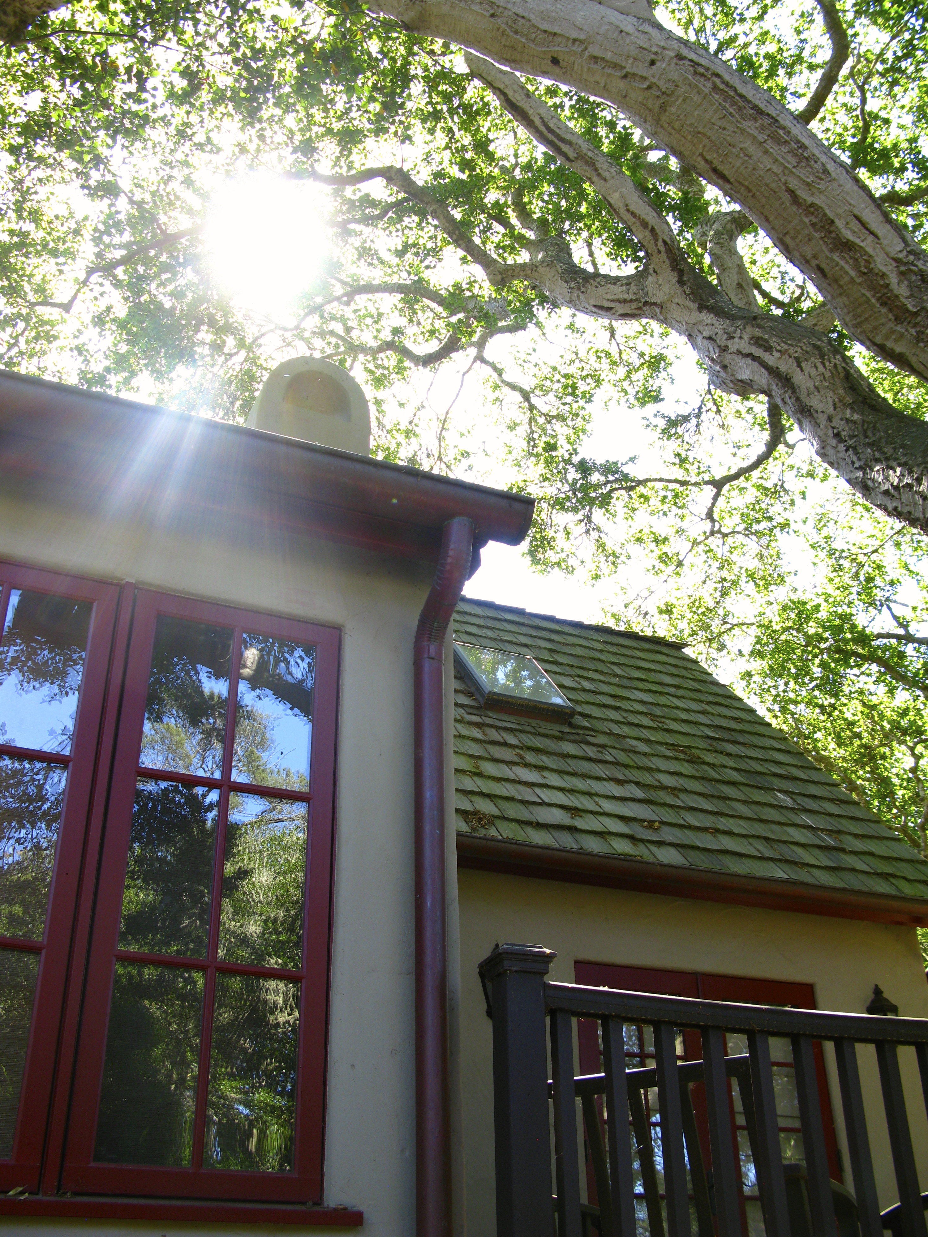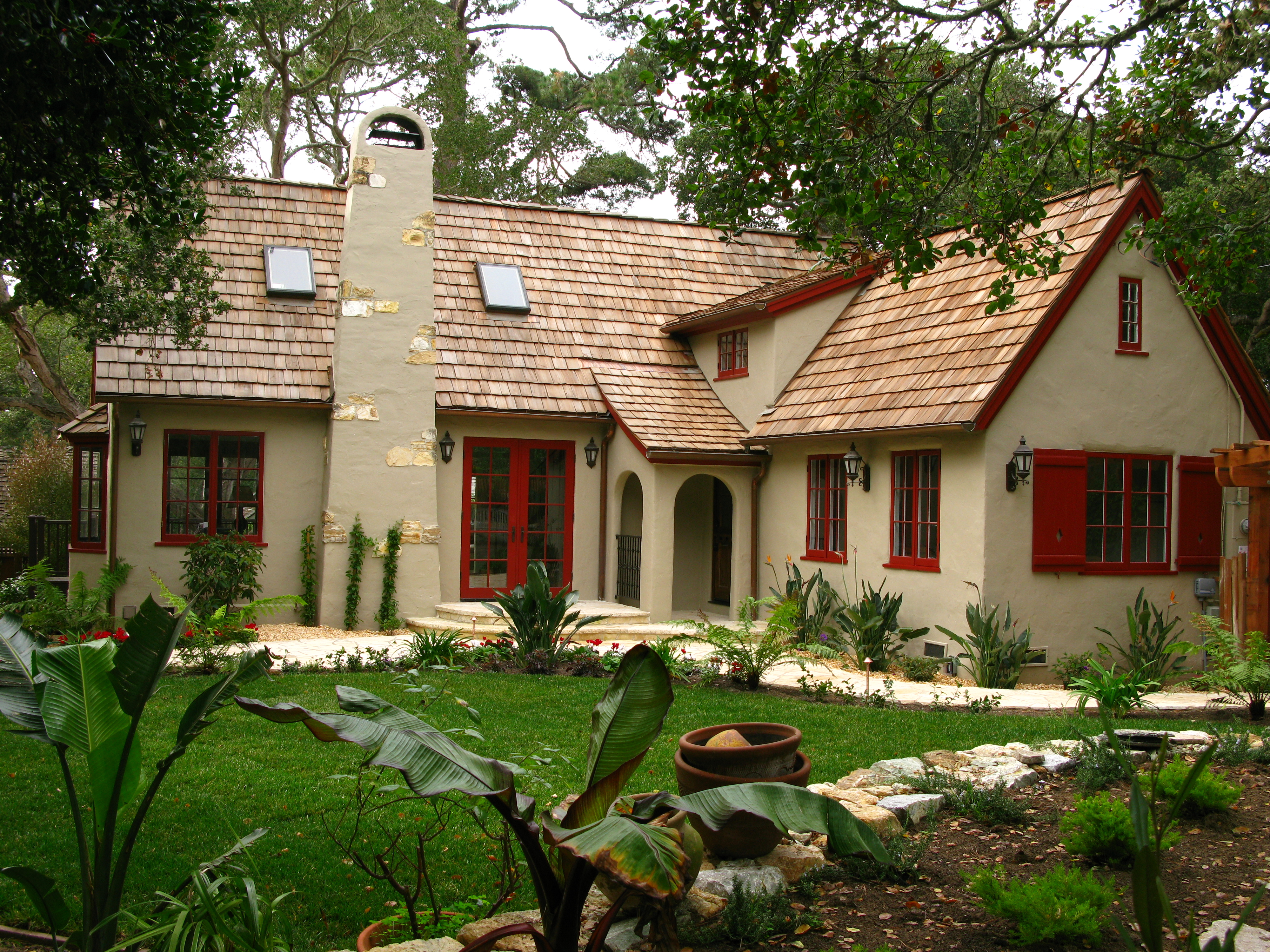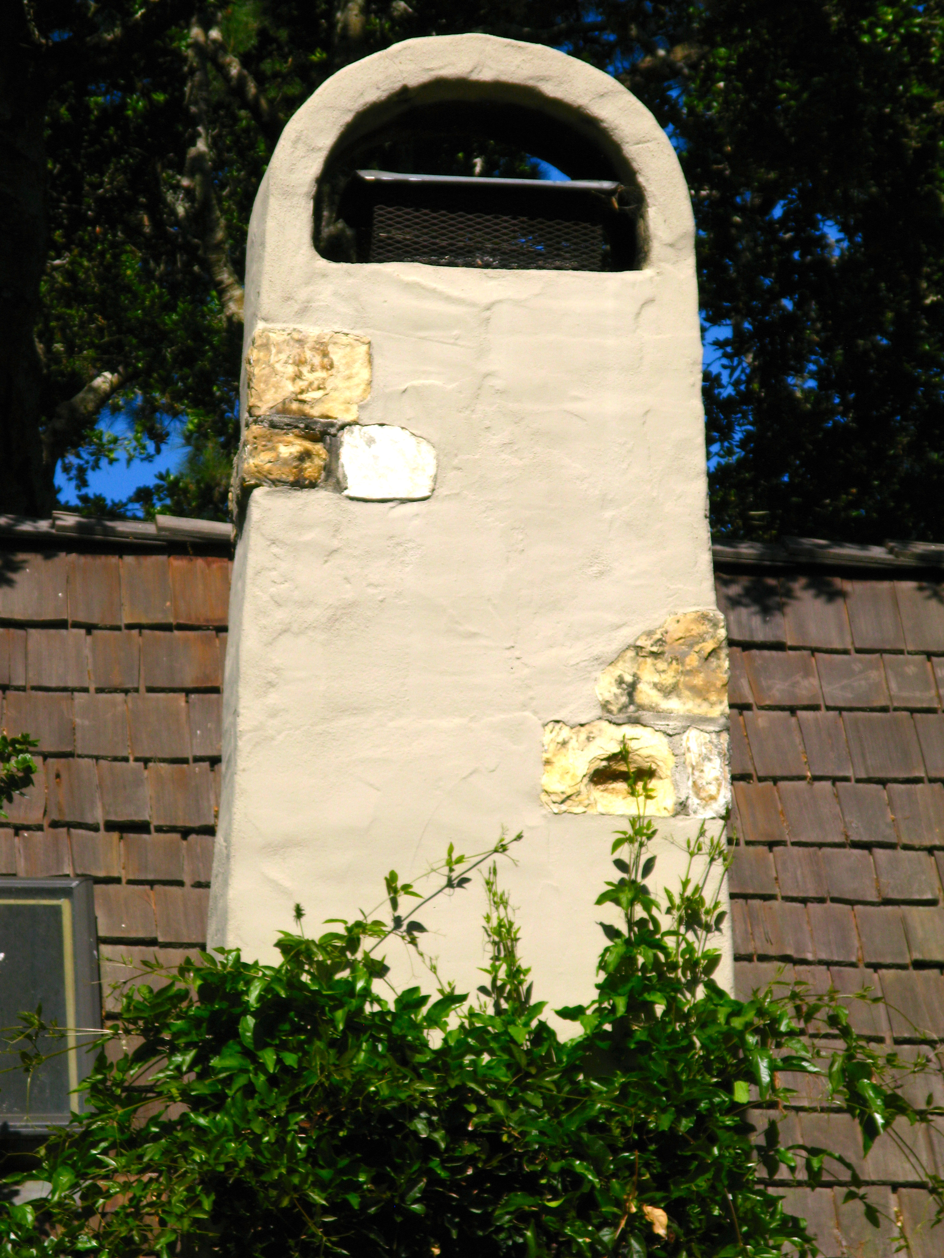 Yes there are those offending skylights on either side of the “stucco-clad… Facade with its patchwork of Carmel stone pieces along its edges” that Kent Seavey describes. Mercy.