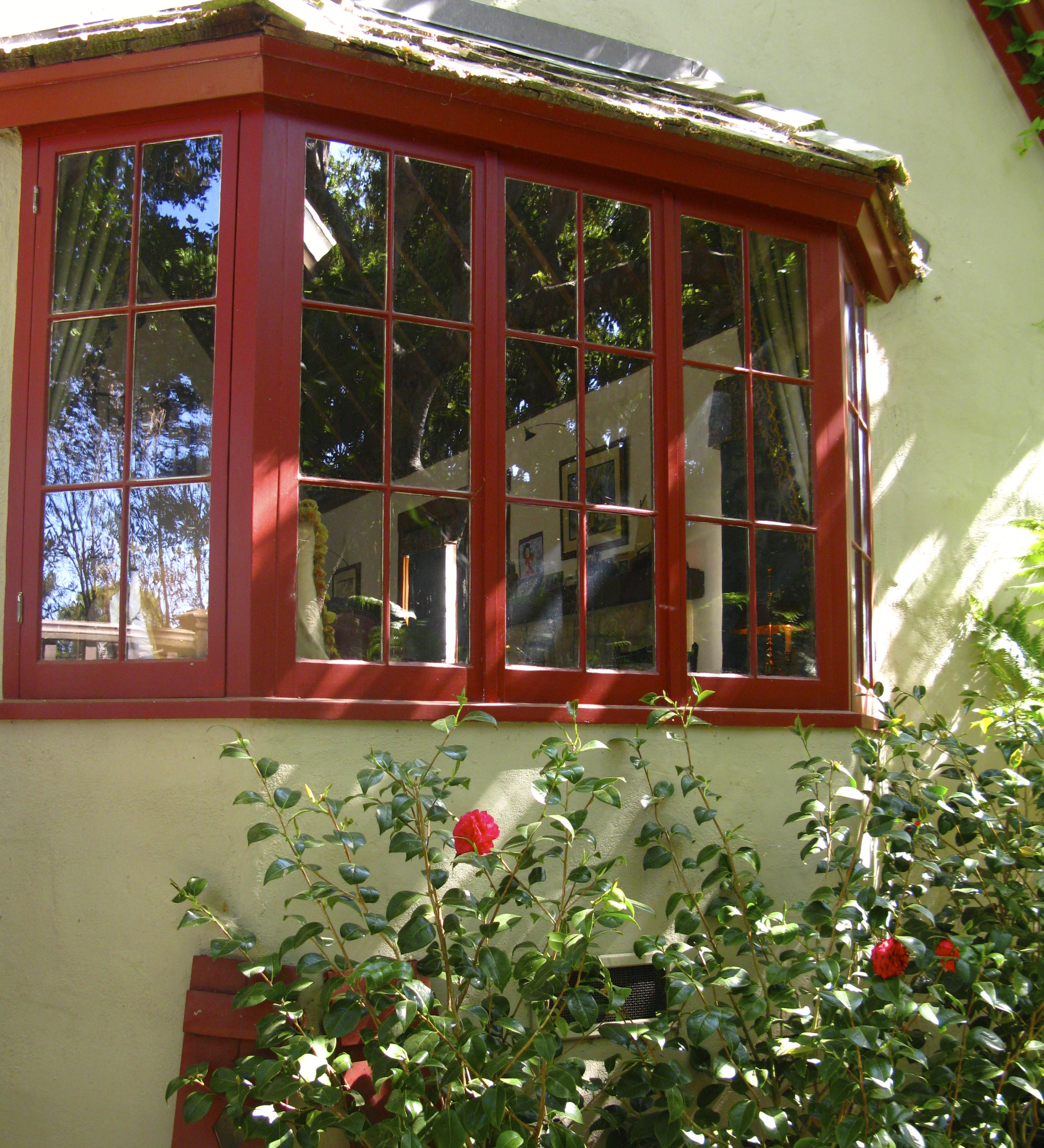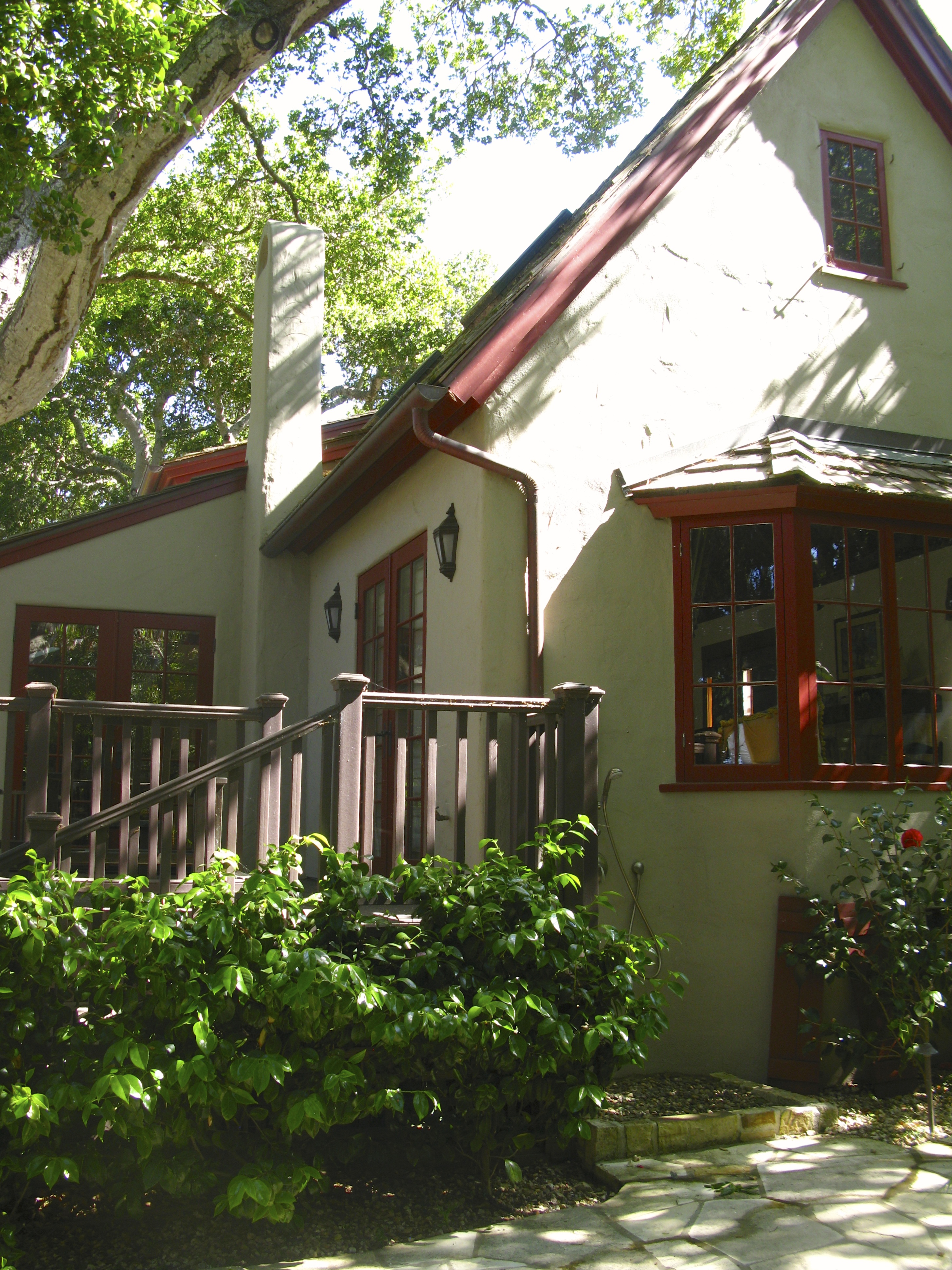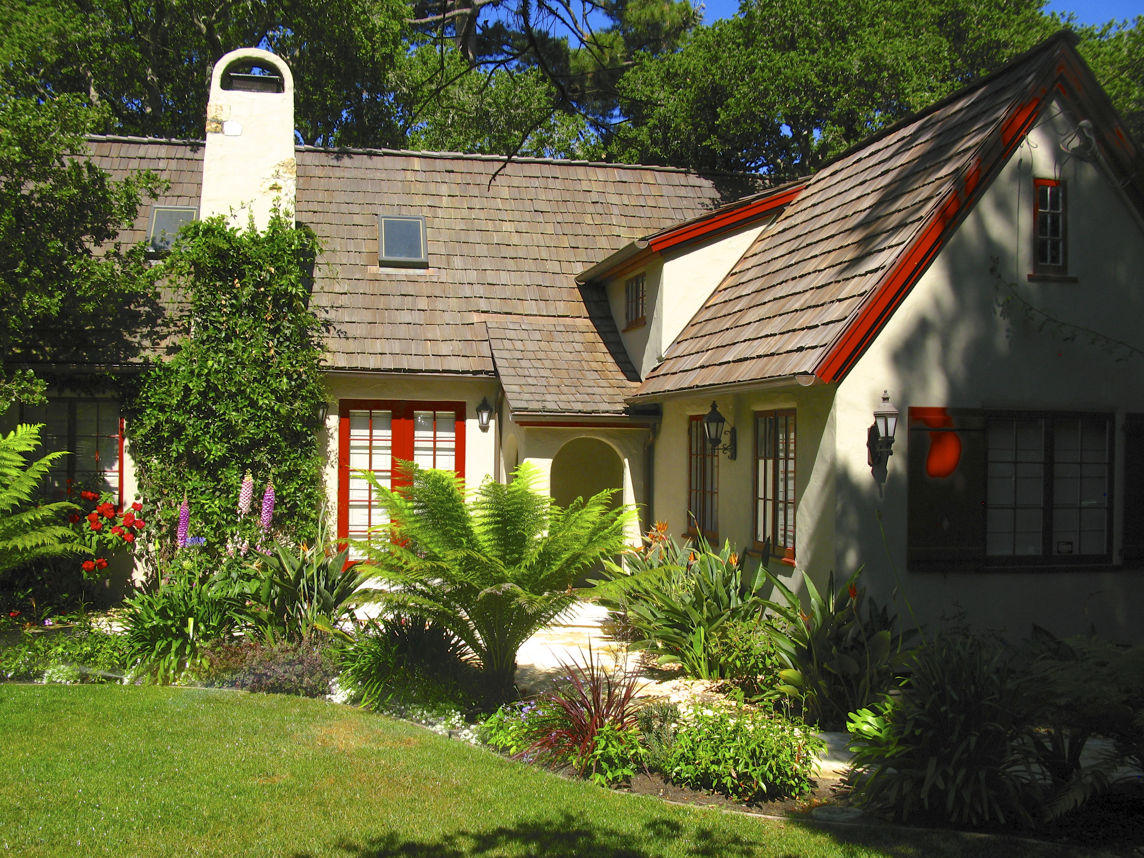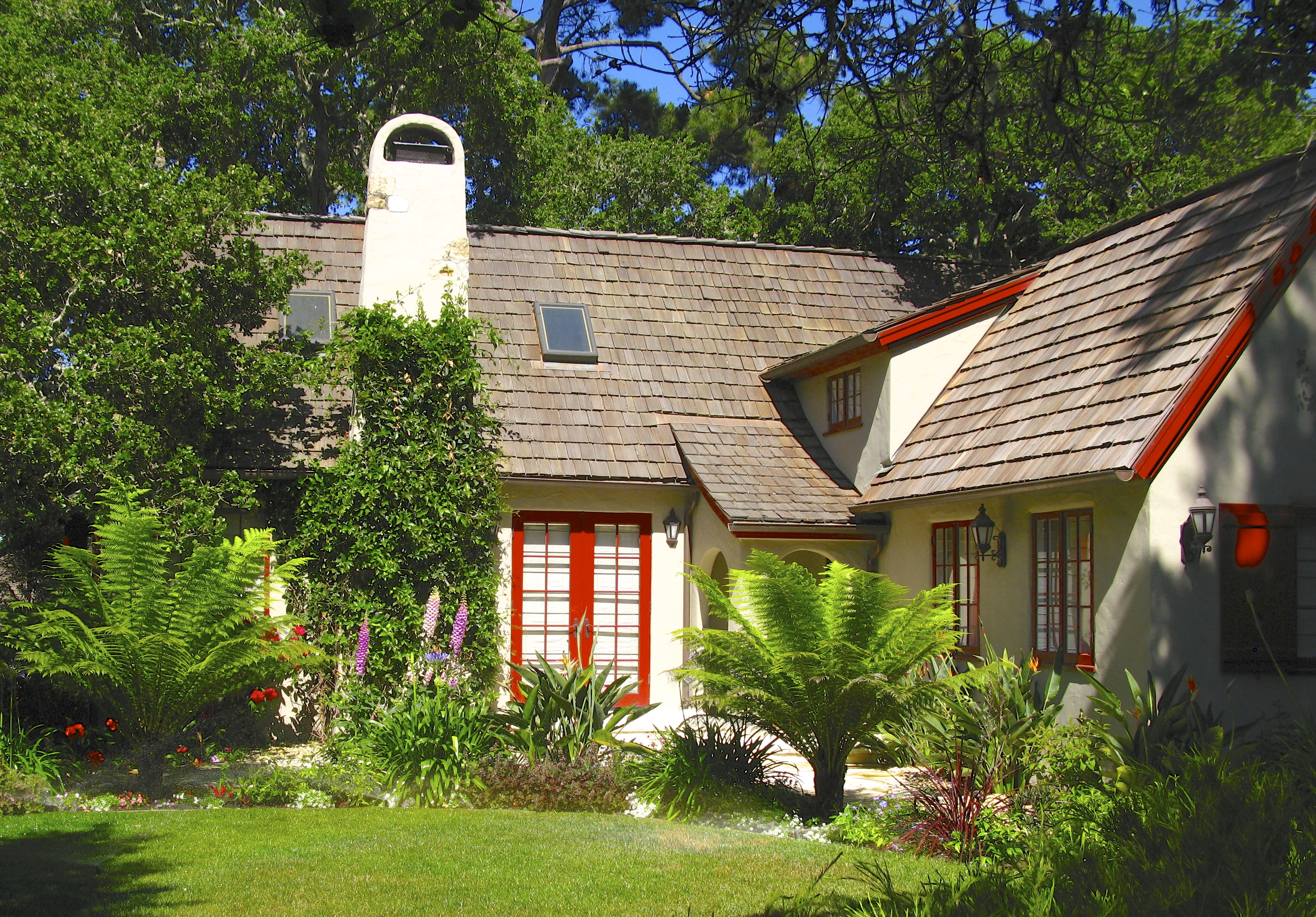Yes there are those offending skylights on either side of the “stucco-clad… Facade with its patchwork of Carmel stone pieces along its edges” that Kent Seavey describes. Mercy.