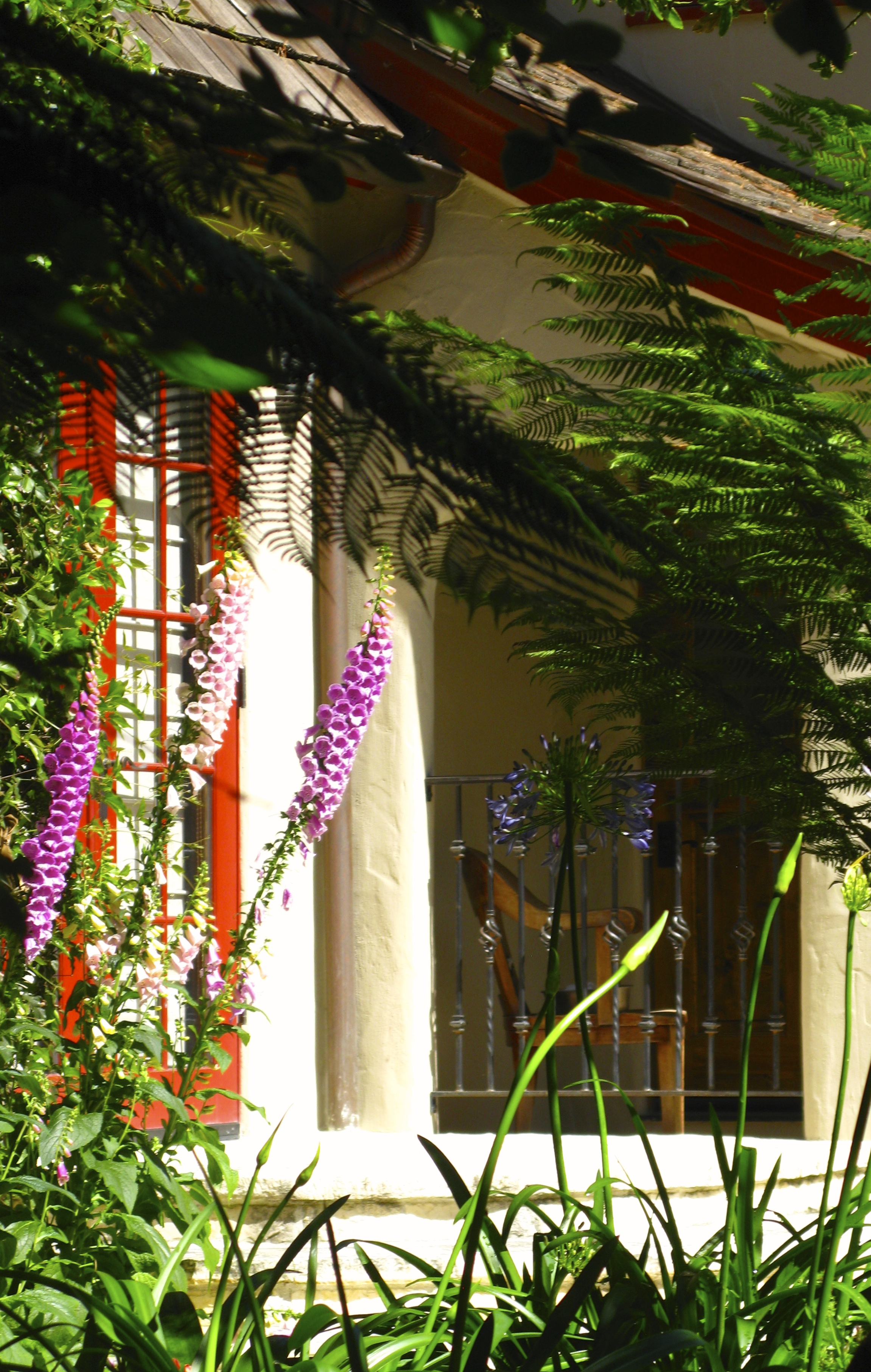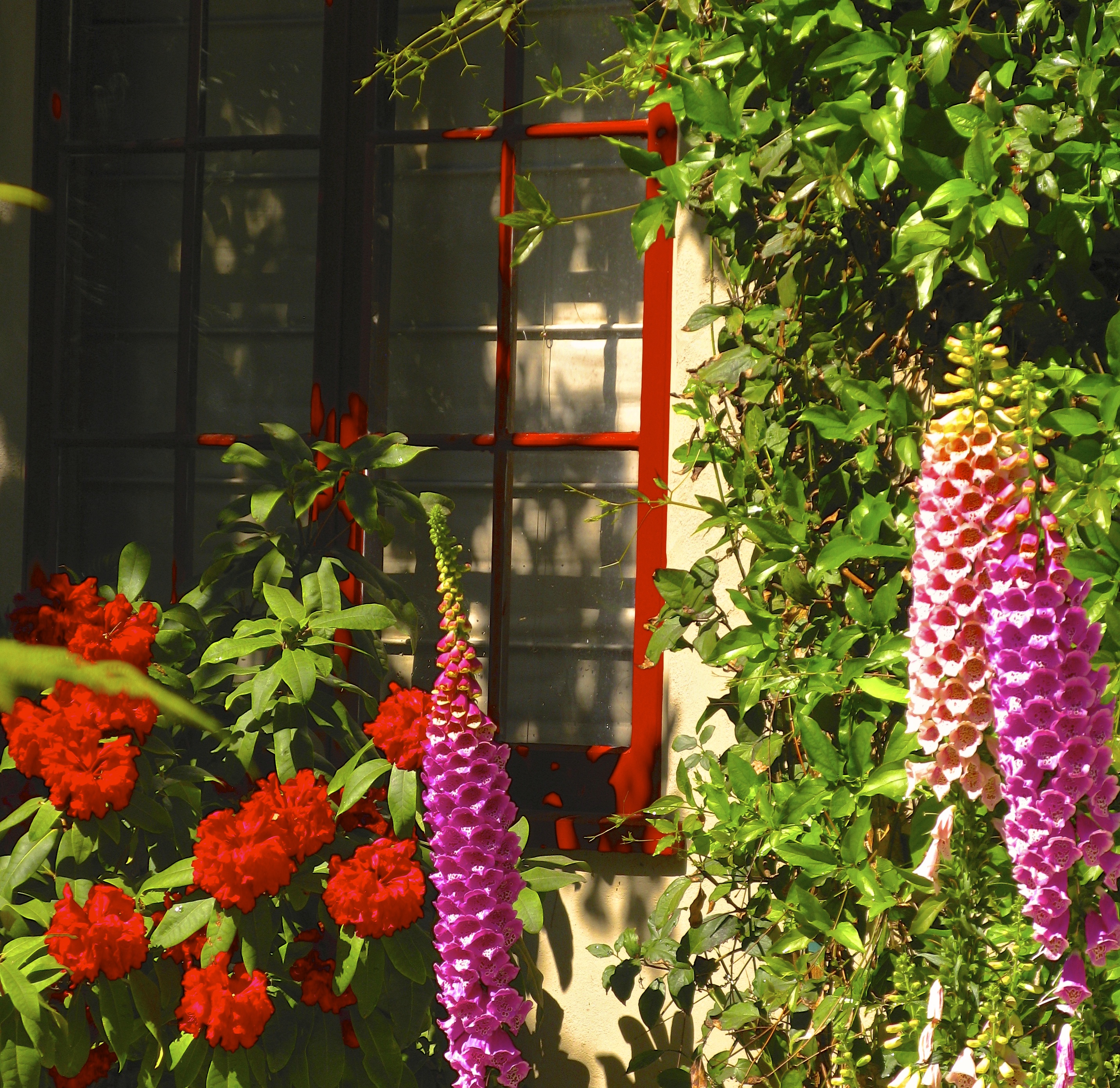 Amazing landscaping and cute cottage. I’m not a red/orange person, so the trim color wouldn’t be my choice, though I suppose it gives it some tropical vibrancy. And I’m not fond of the juxtaposition of pink foxgloves against red rhododendron and window trim. (That’s the reddest rhododendron I have ever seen!) The glimpse through the bay window (which I love) is intriguing: I can see a vaulted ceiling of stained wood (with a skylight), a fireplace, and framed art on the walls. Would love to see views of the interior. But that yard is incredible. Love those huge ferns and all the stonework.