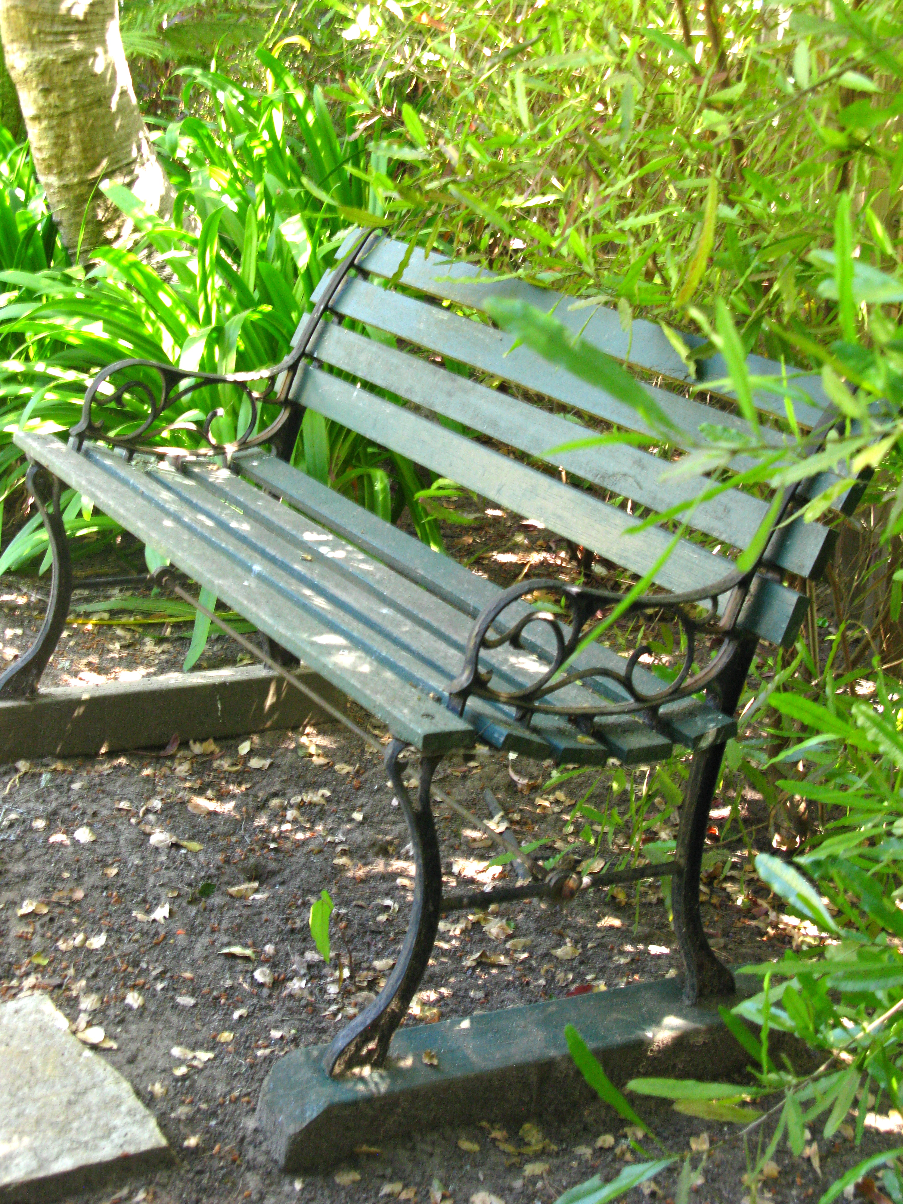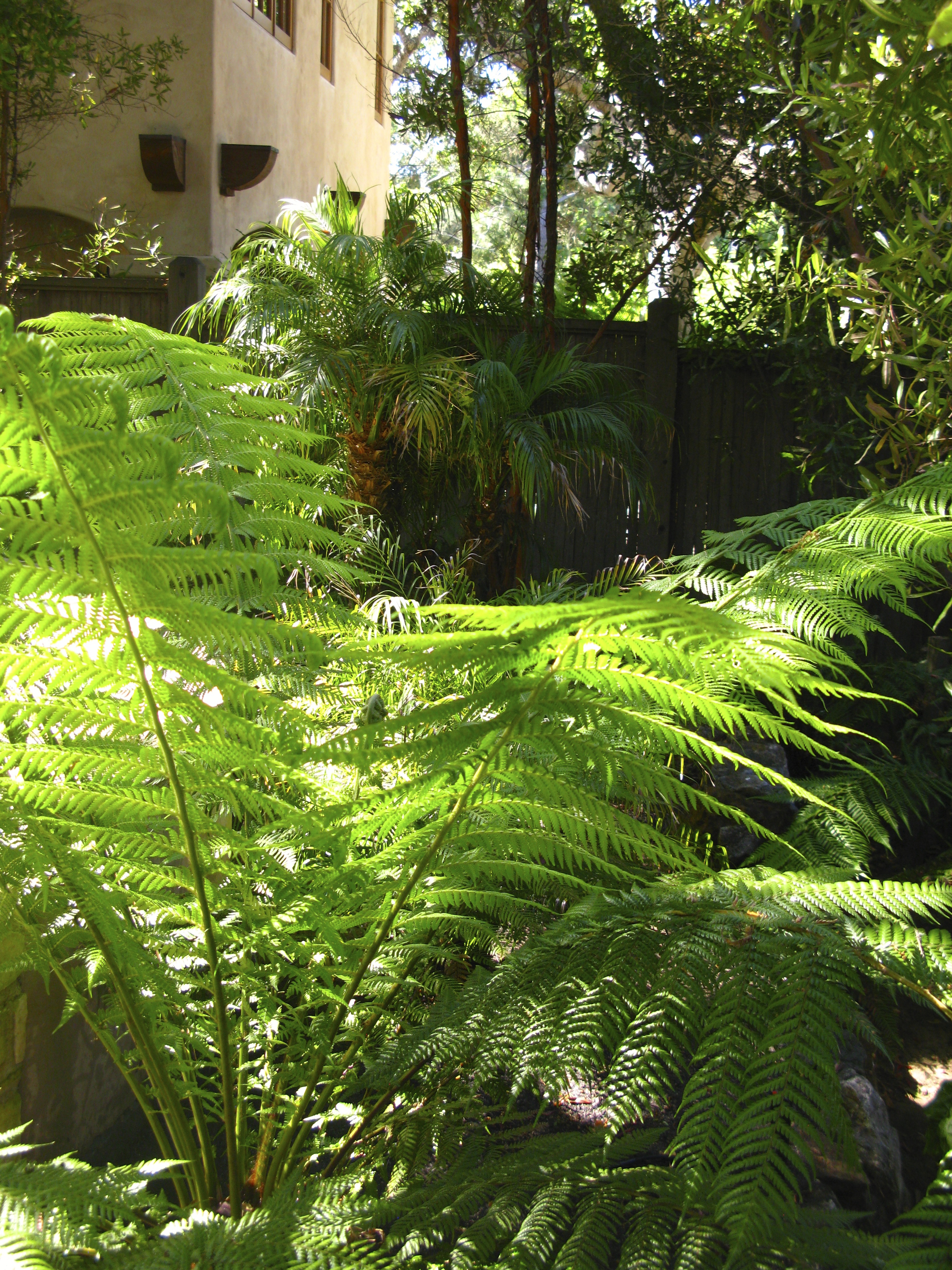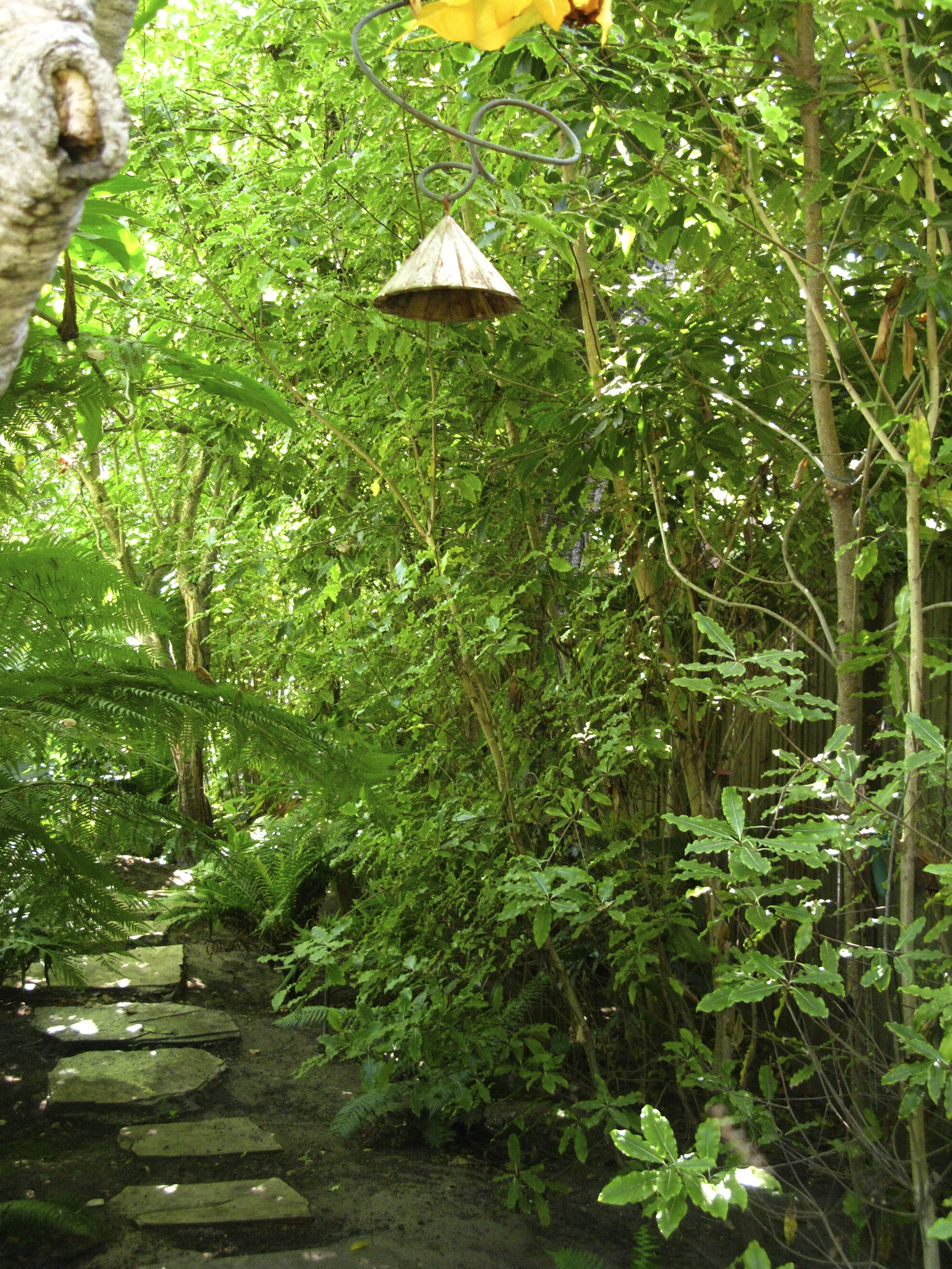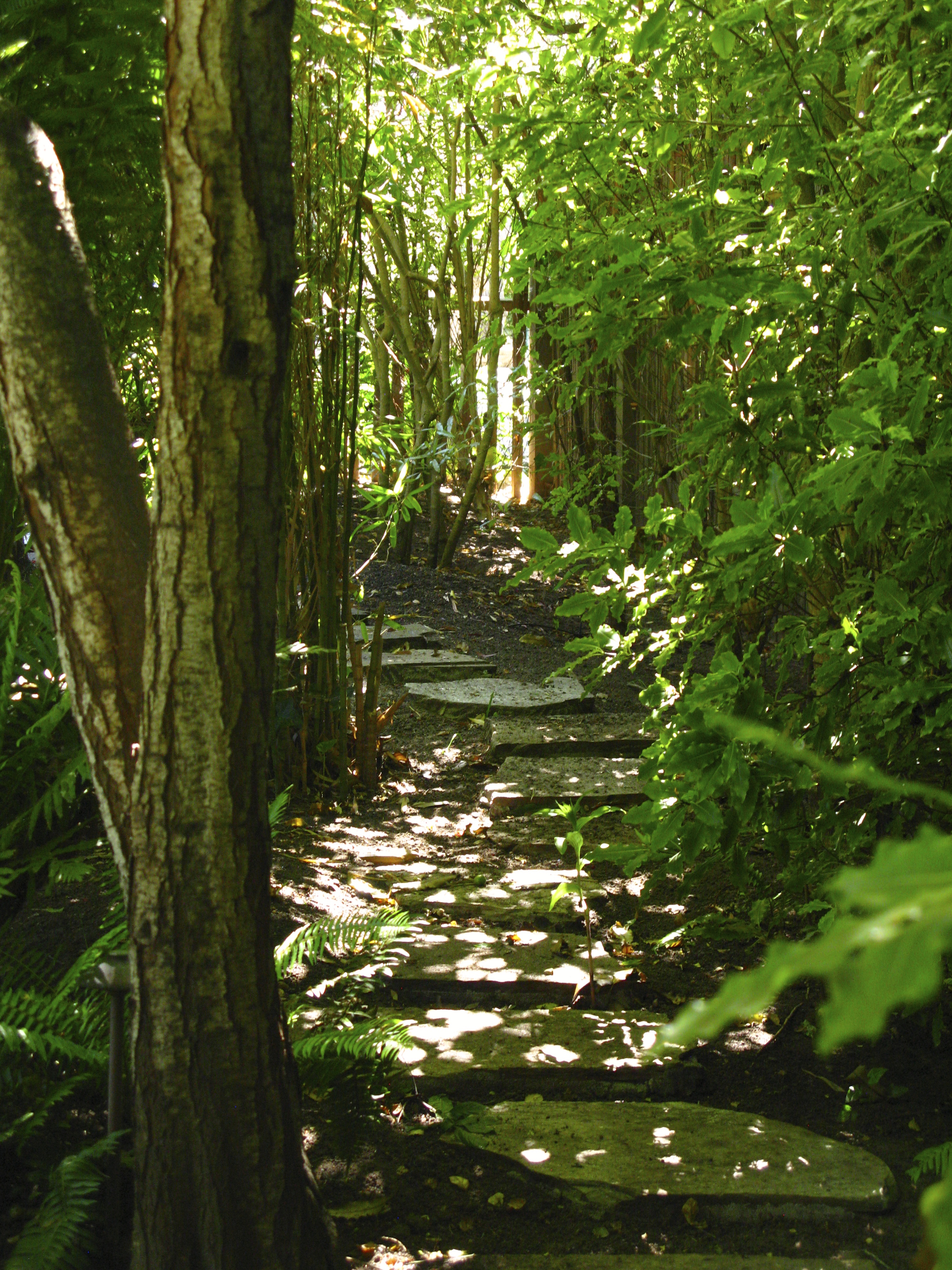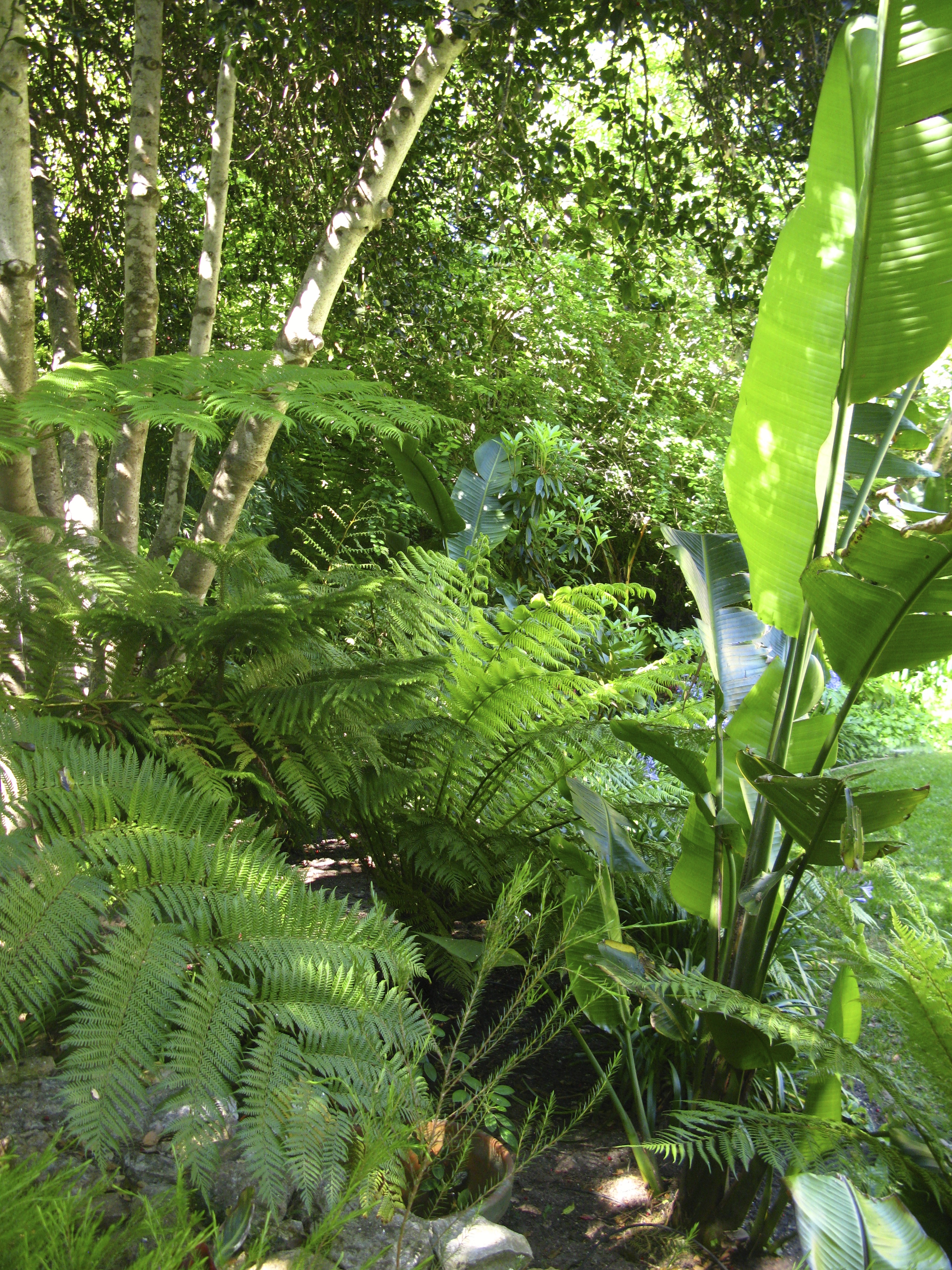 Sound is muffled except for the birdsong. Ferns sway in the breeze. There is even a stand of bamboo.