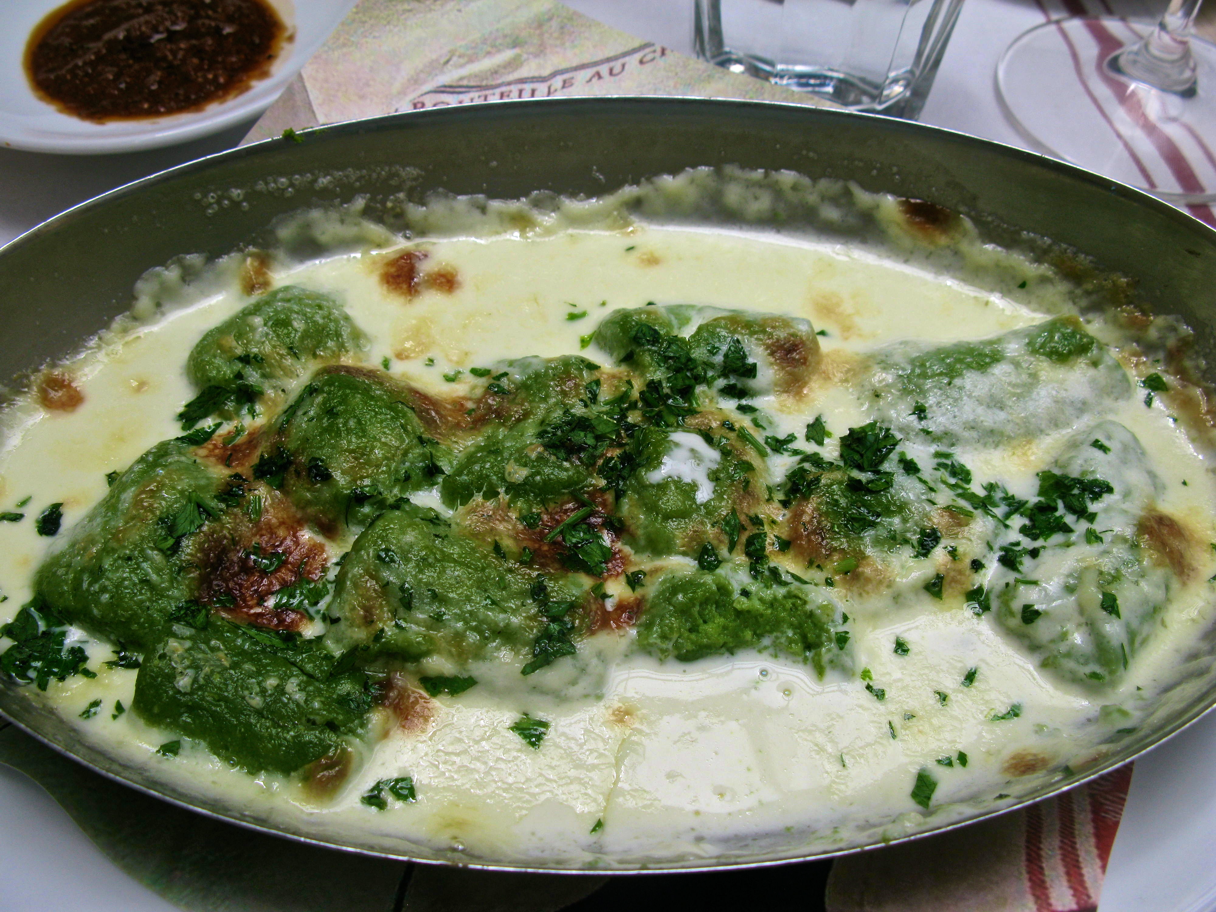 and are seated and treated to a tasting of gnocchi. This is not the heavy dough make from potato but a French pastry dough like a cream puff filled with spinach and cream sauce.  The man across the table from me is amazed that he can like anything that contains spinach. By now personalities are emerging. One woman assumes the role of hostess, pouring water, passing food and making sure everyone gets their share. I bet she is a wonderful Mom.