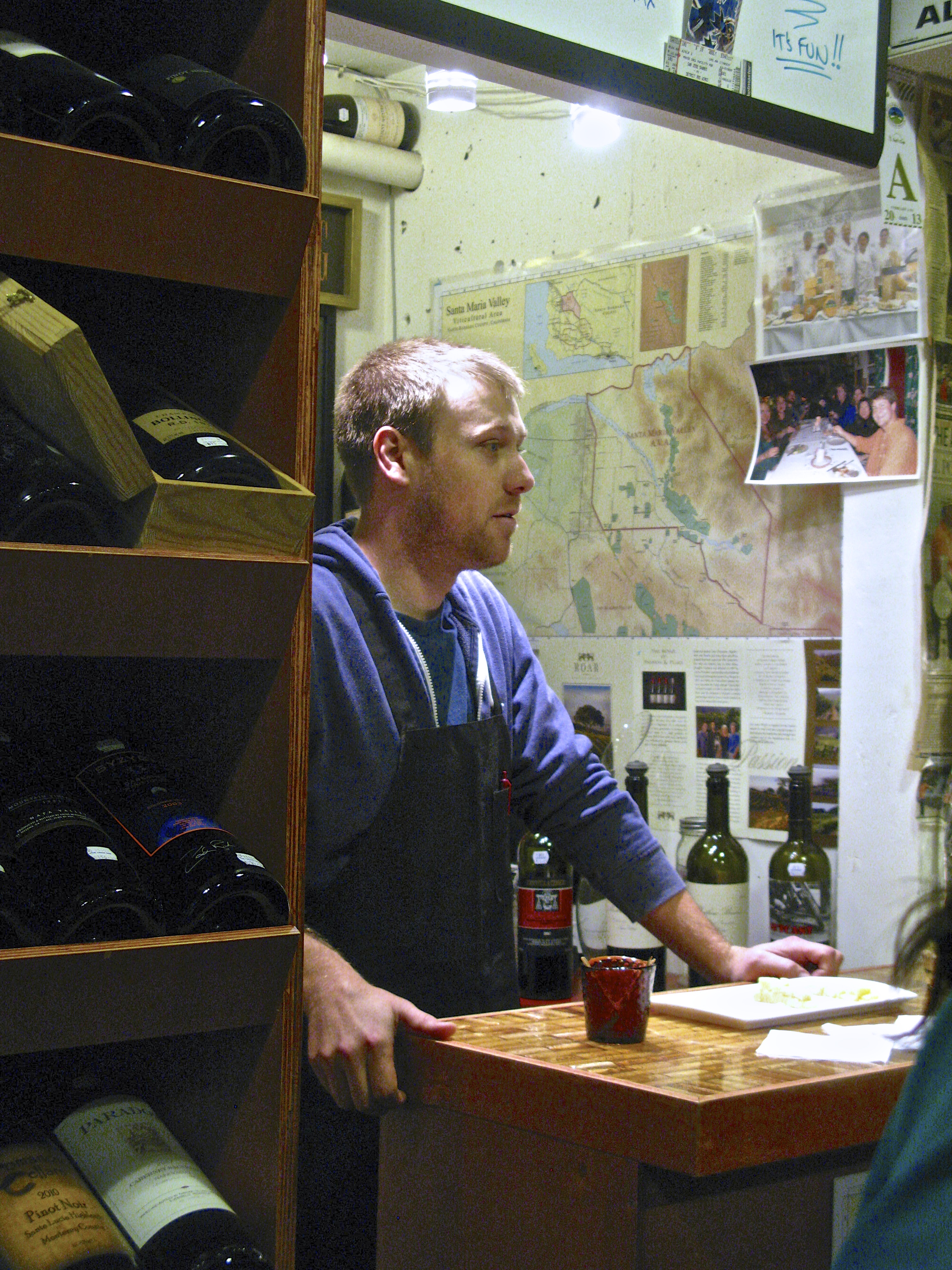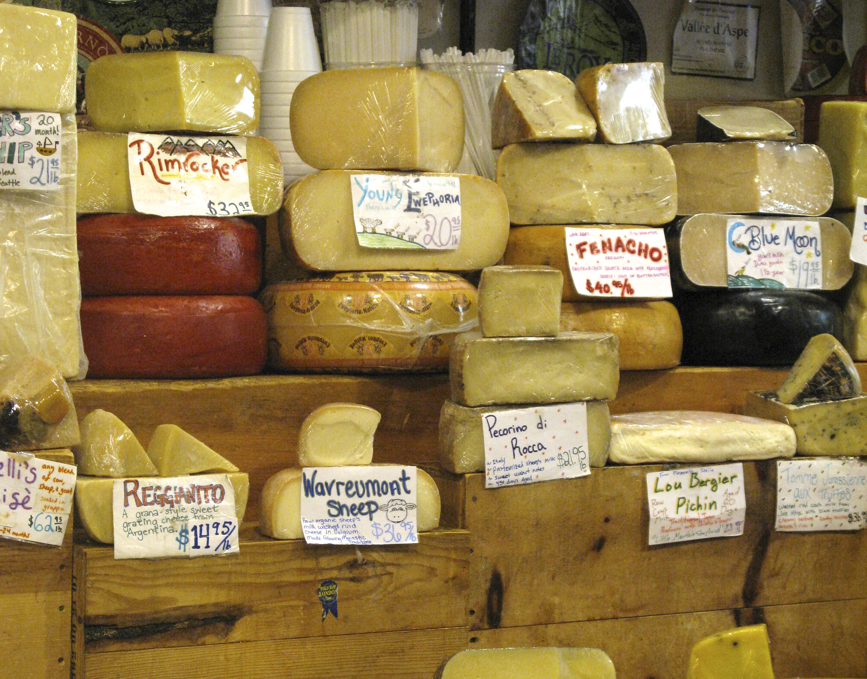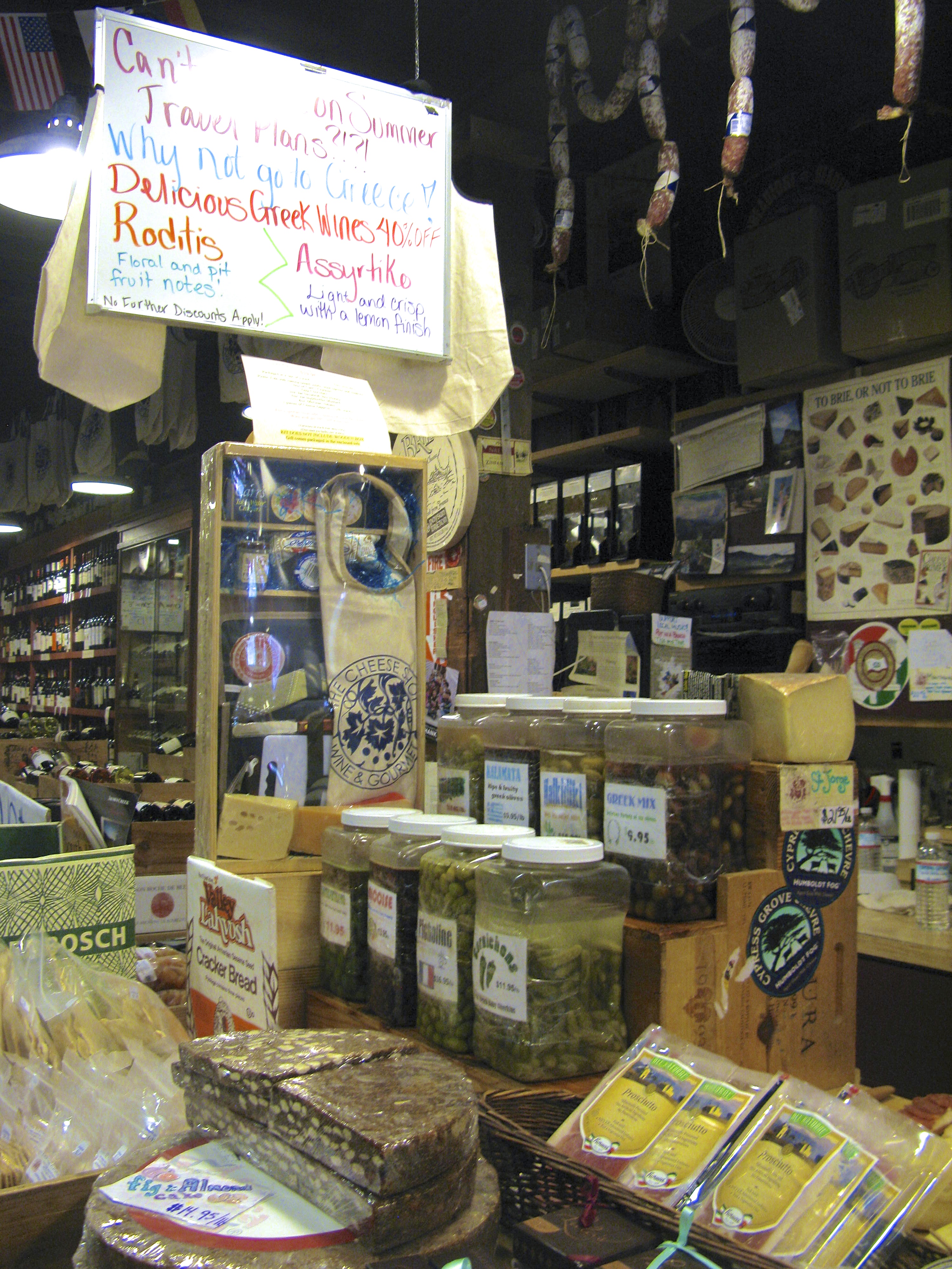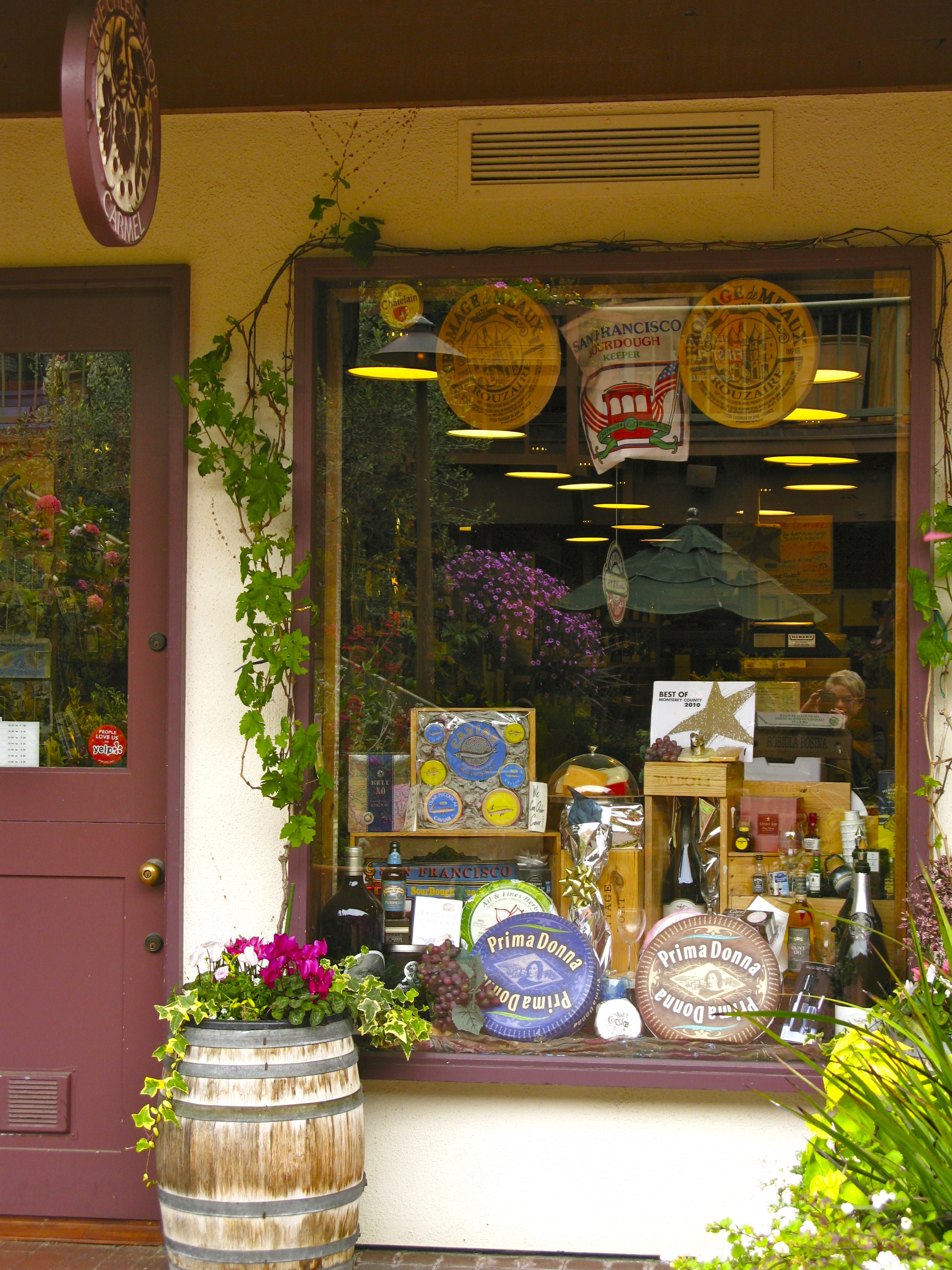 At the cheese shop we taste cheese from Italy, England, and good old Monterey.