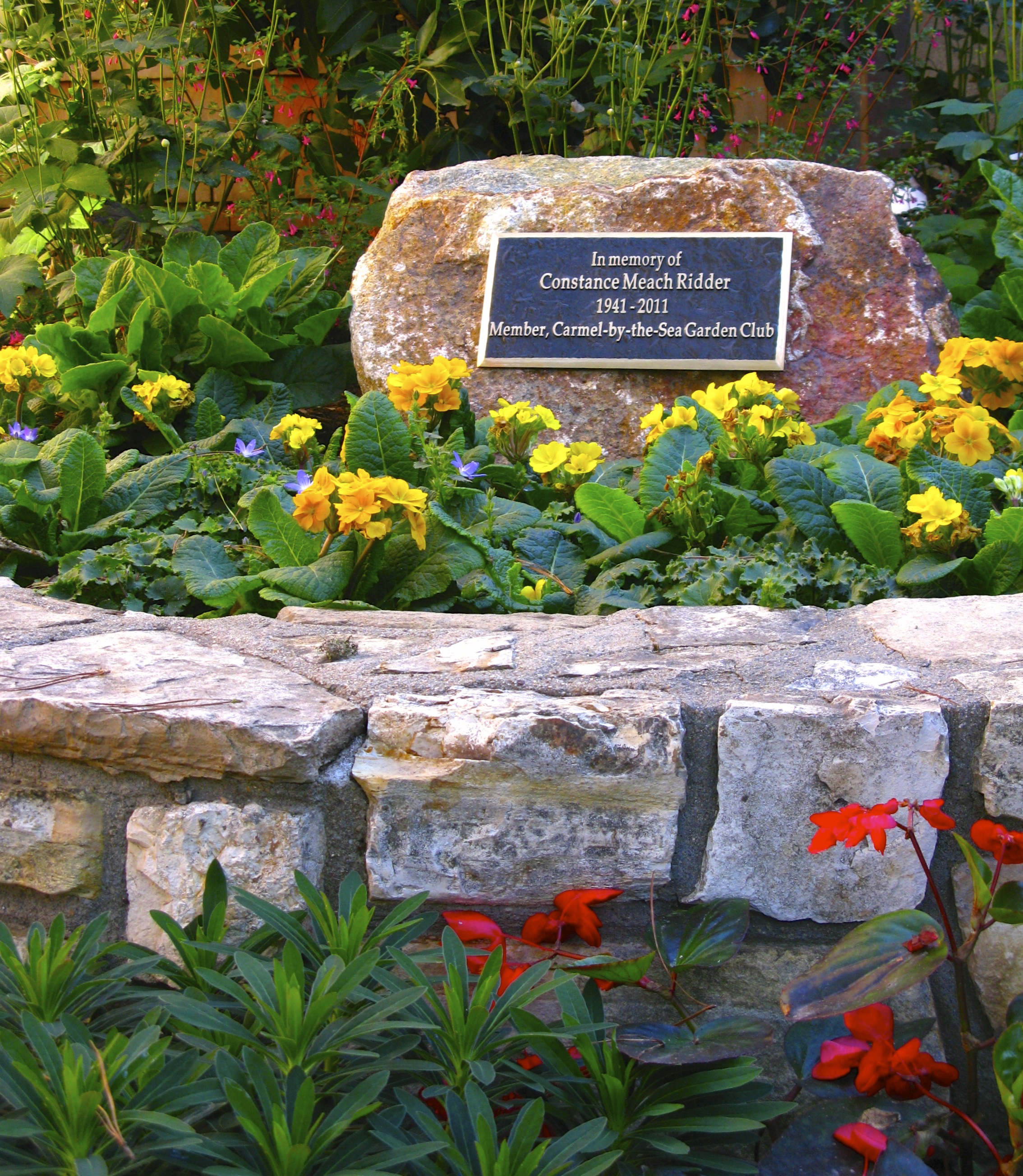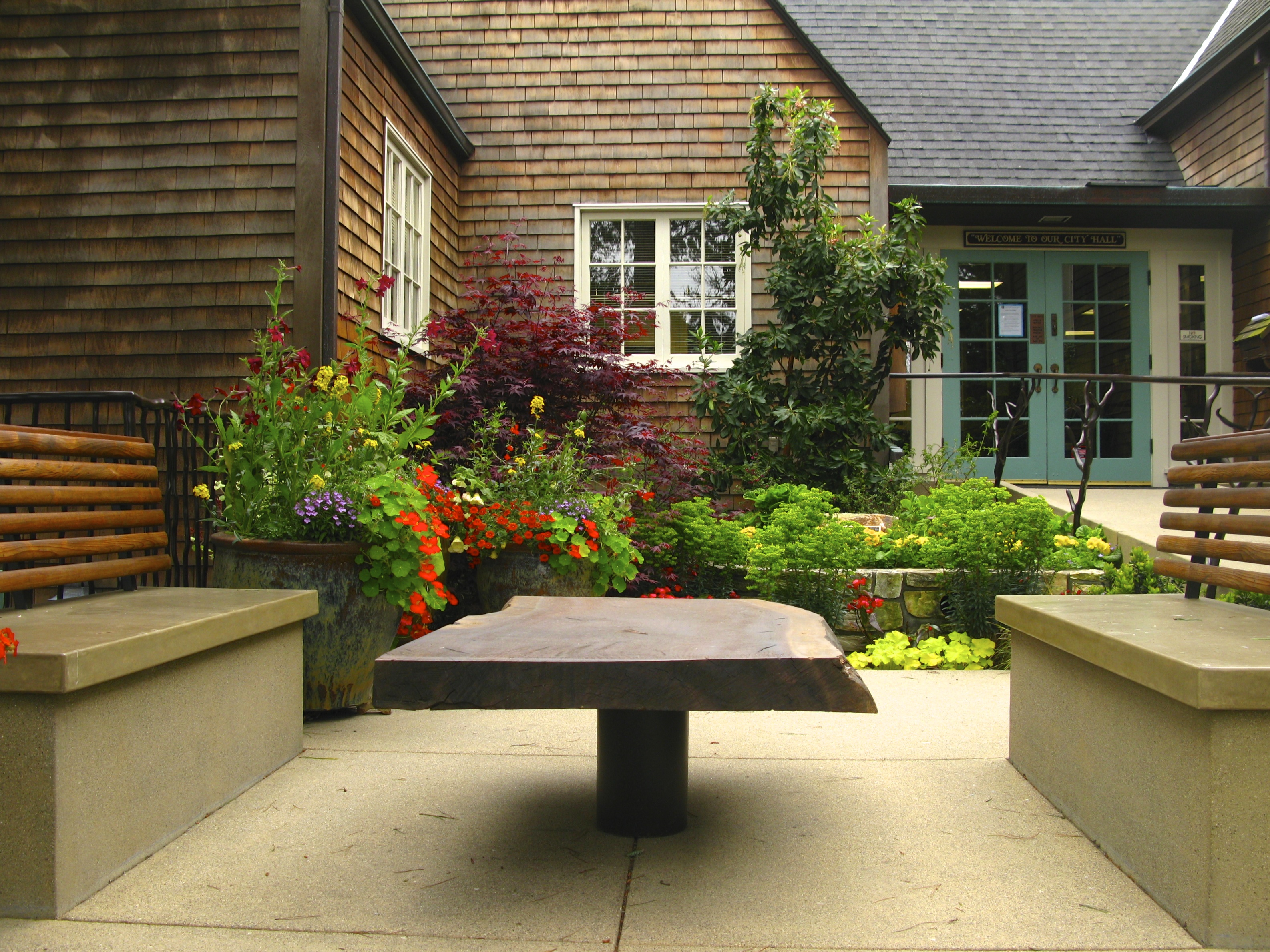 I take time to enjoy the new landscaping funded by a grant made by Constance Meach Ridder.