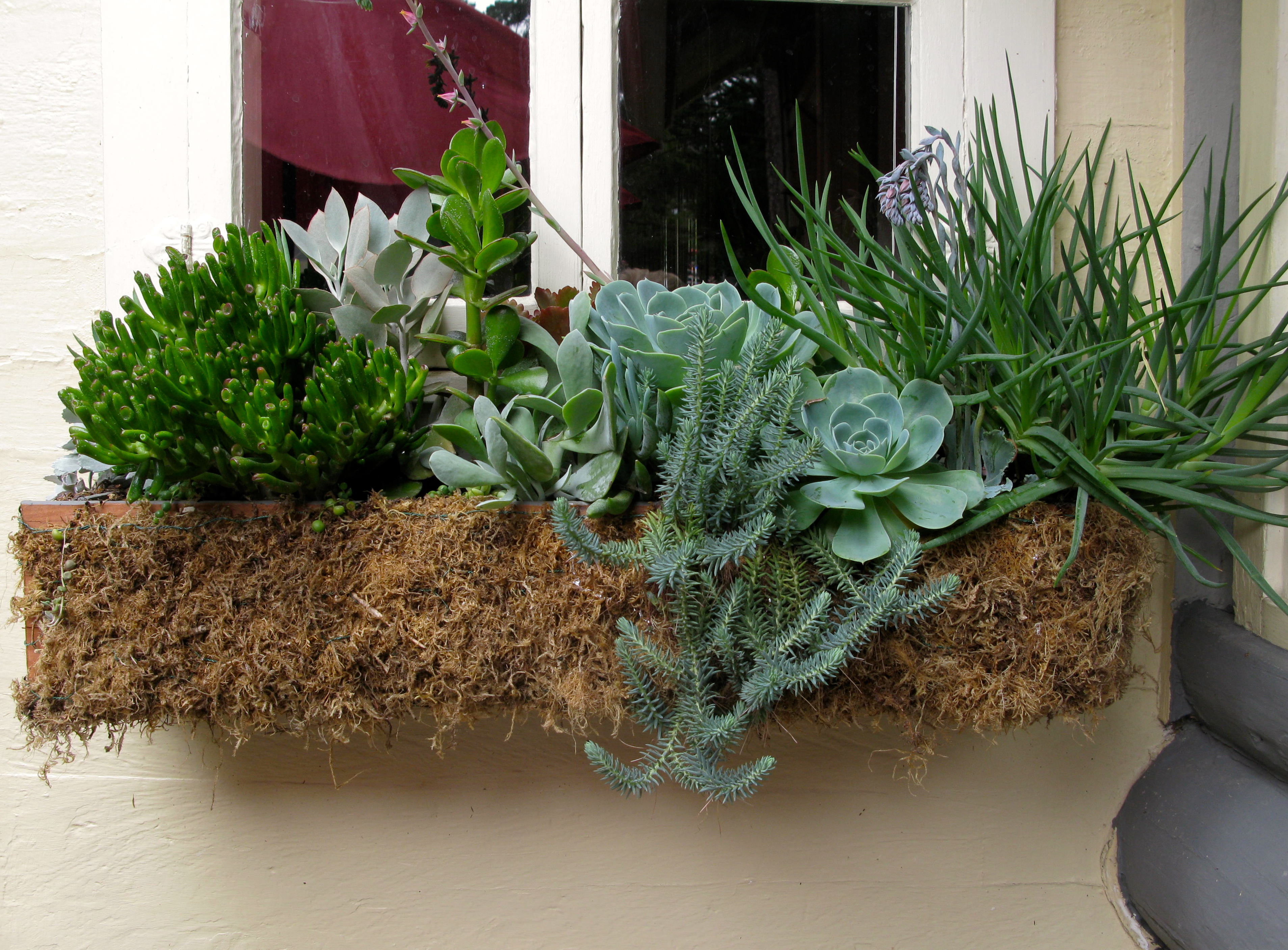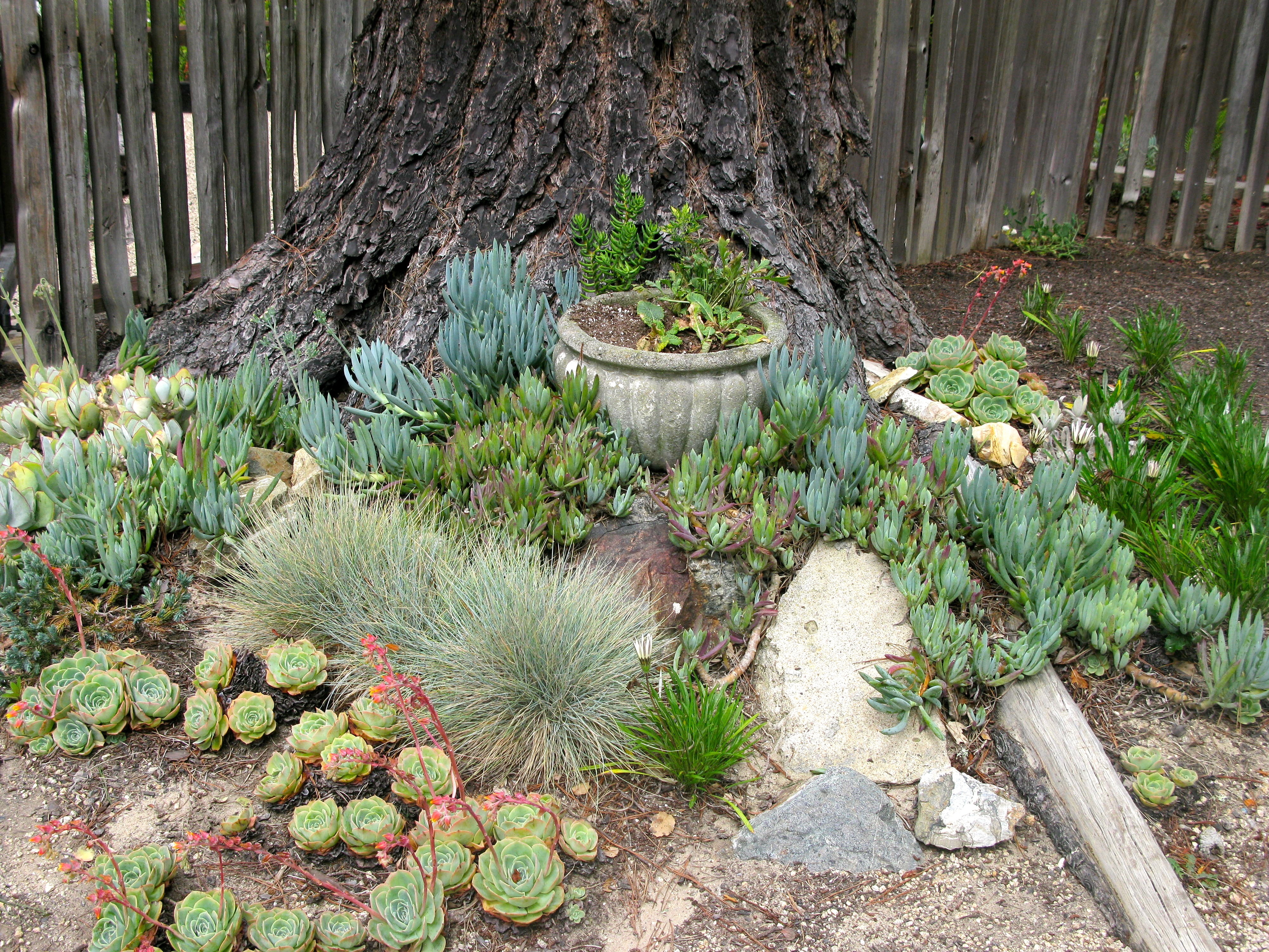 I meander over to admire her succulent plantings at the base of a huge pine.