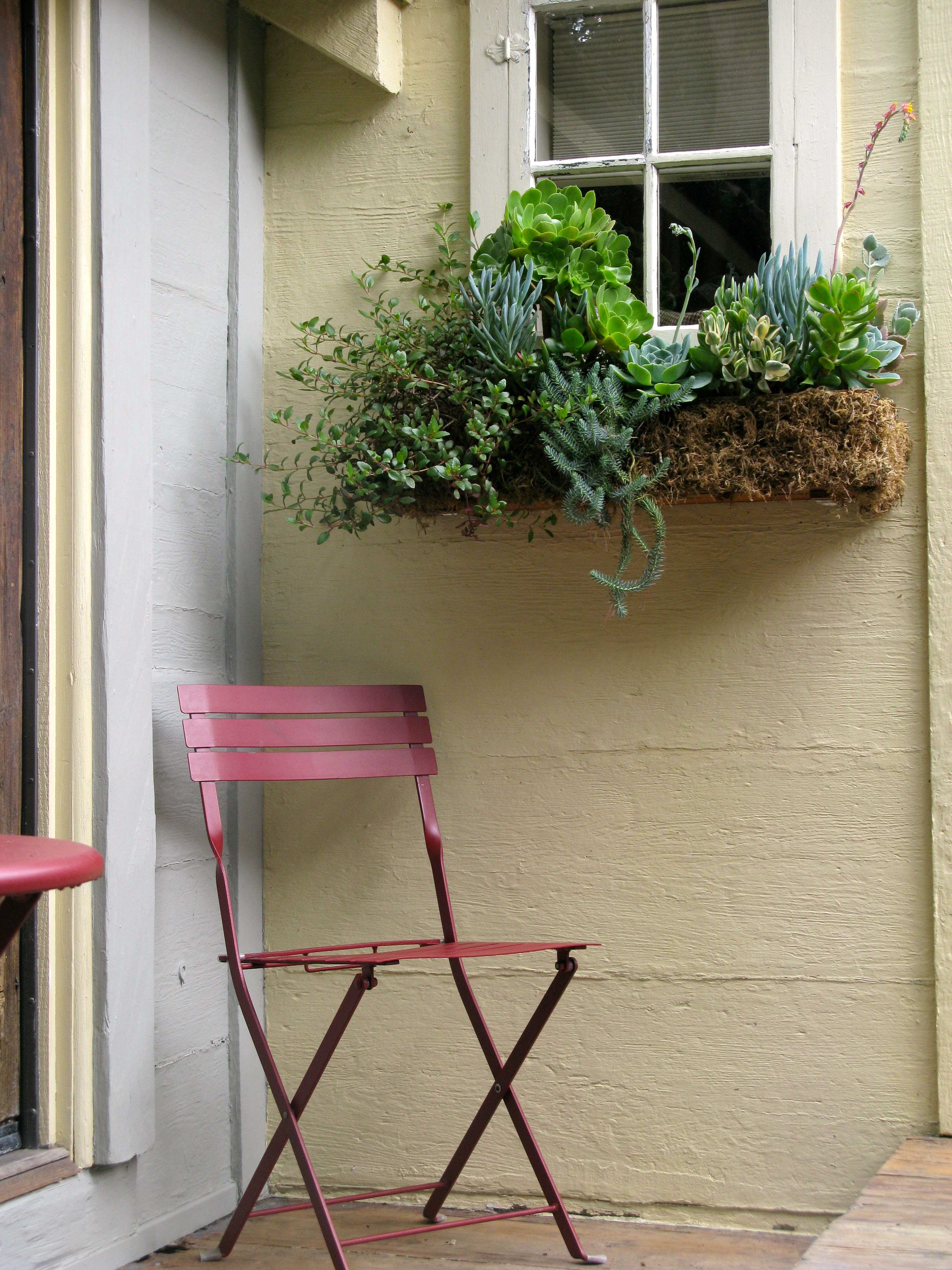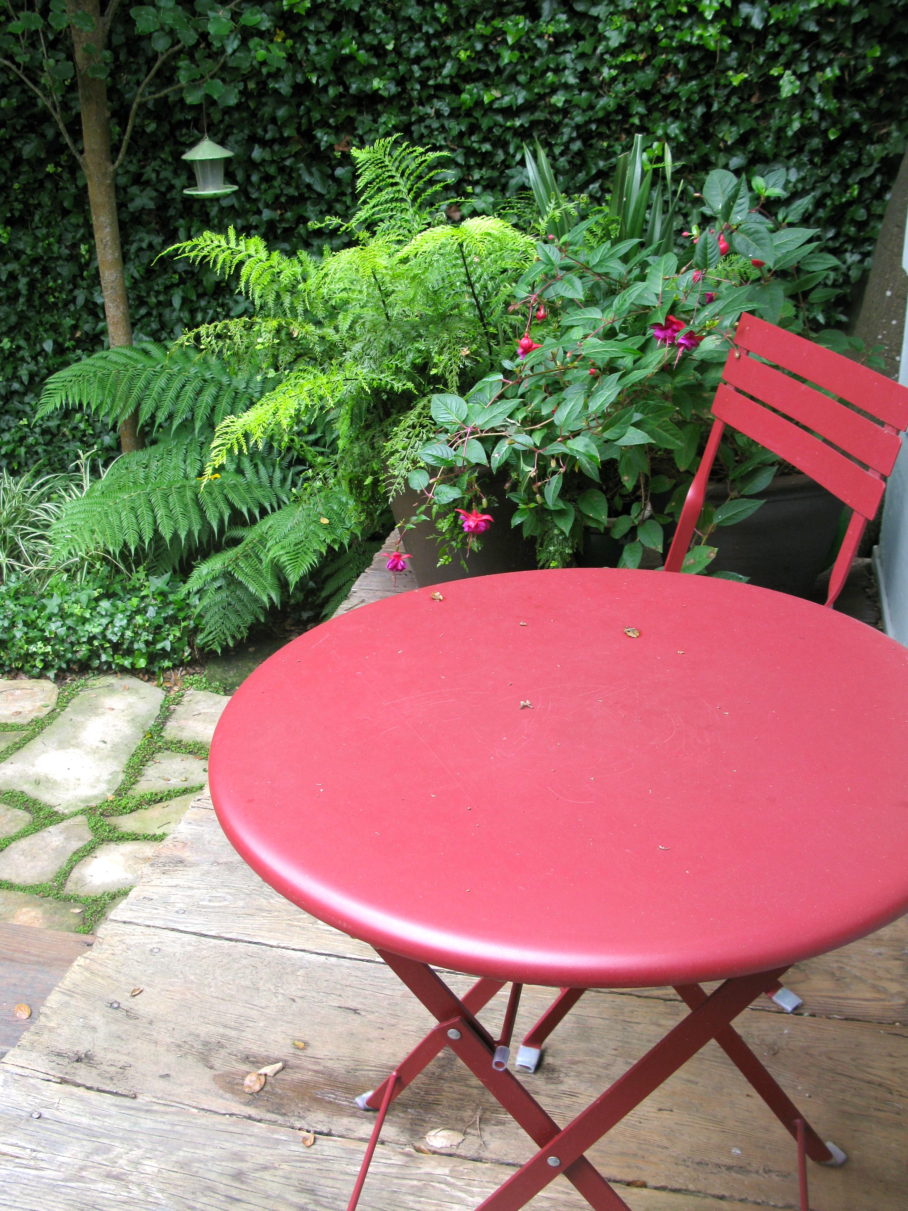 I love the red umbrella, table and chair. They add just the right touch of color.