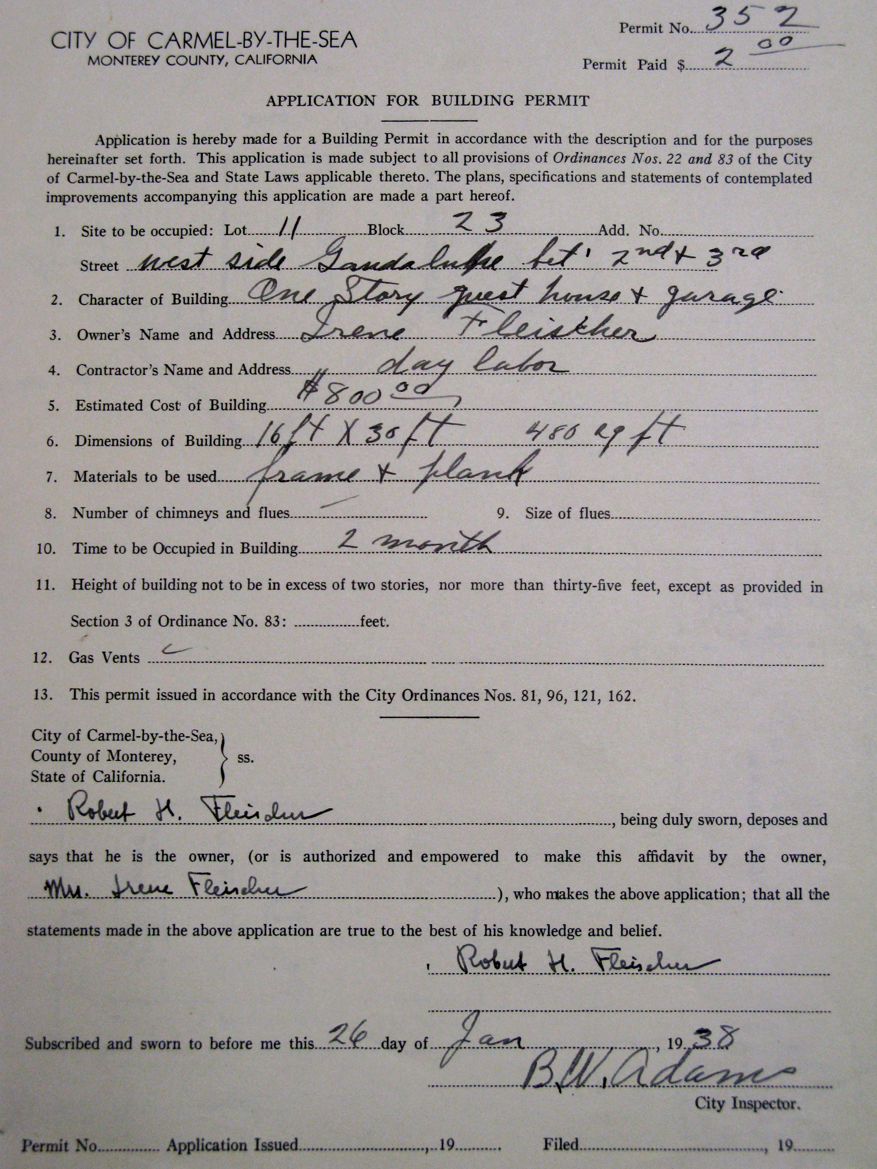 In 1938. Mrs Fleisher obtains a building permit to build a one story guest house and garage using day laborers.