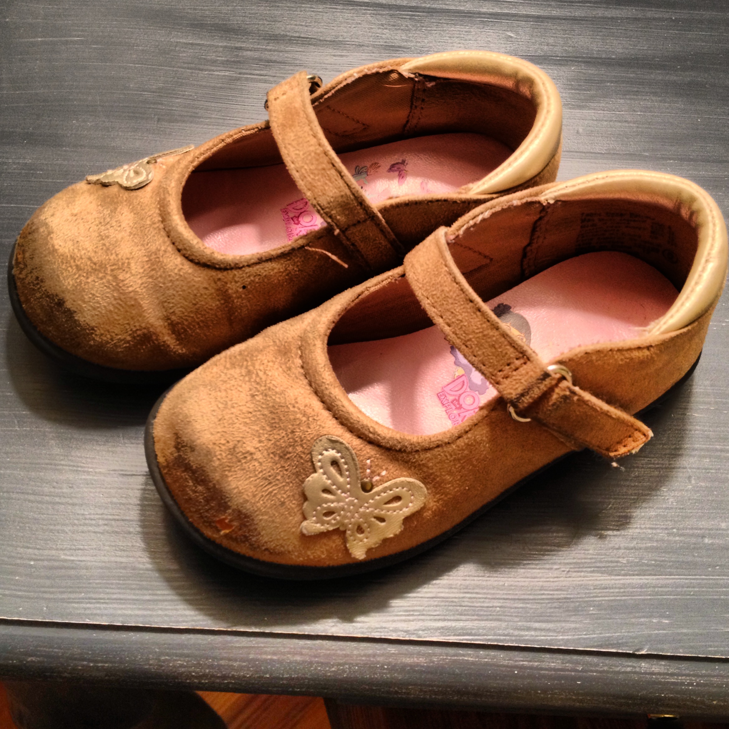 I have a guest author today, Danica’s Shoes, two small suede “Dora Mary Janes”.