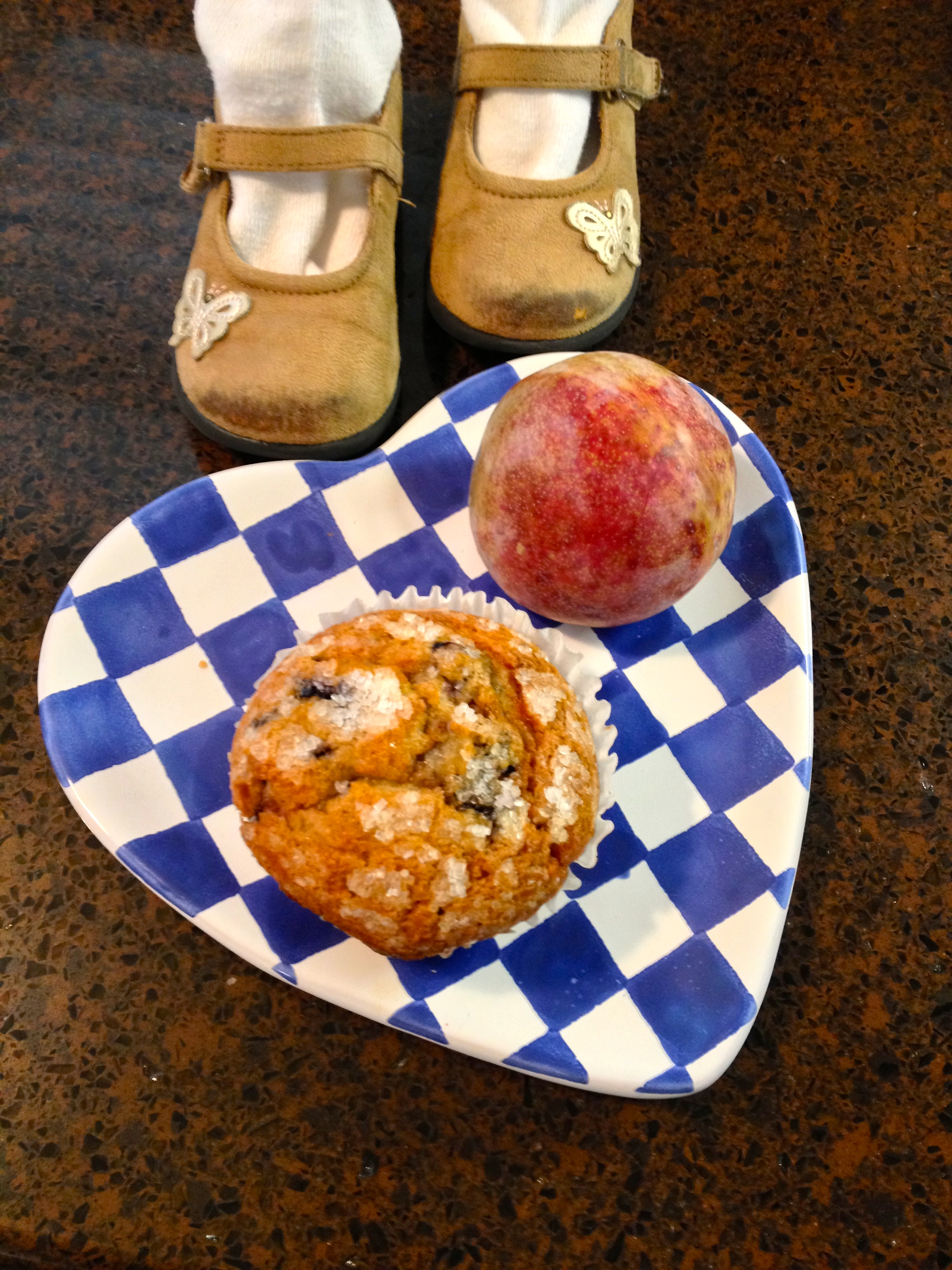 We get our plate and find a muffin and a pluot to eat for breakfast.