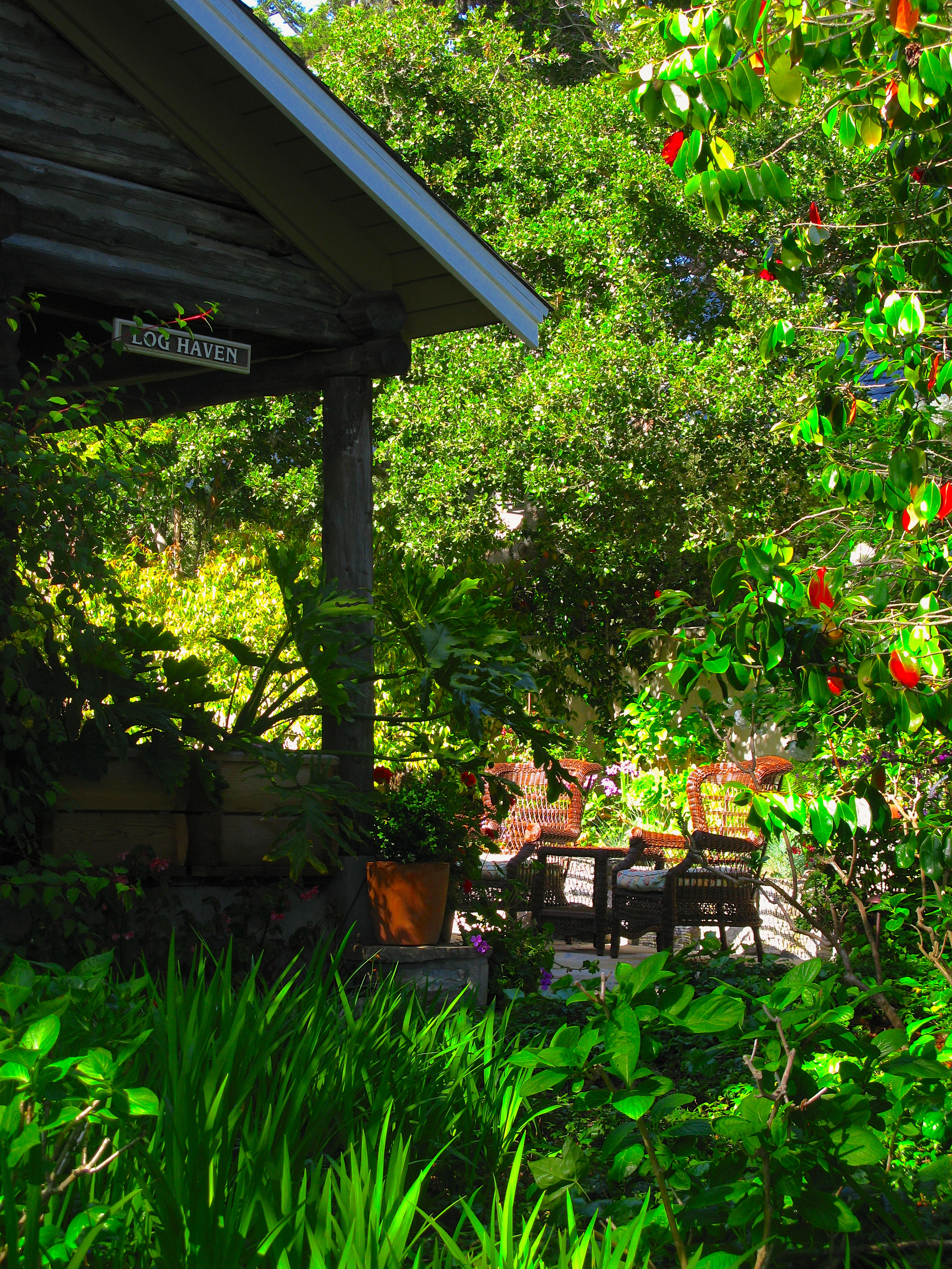 Log Haven sits back from 8th Ave. Behind a grape-stake fence . Its setting is informal and heavily planted. Mature shrubs and trees surround it.