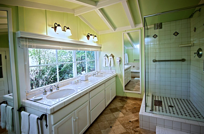 And full bath. It is so well done with the pedestal sink and the cute little marble-topped dressing table.