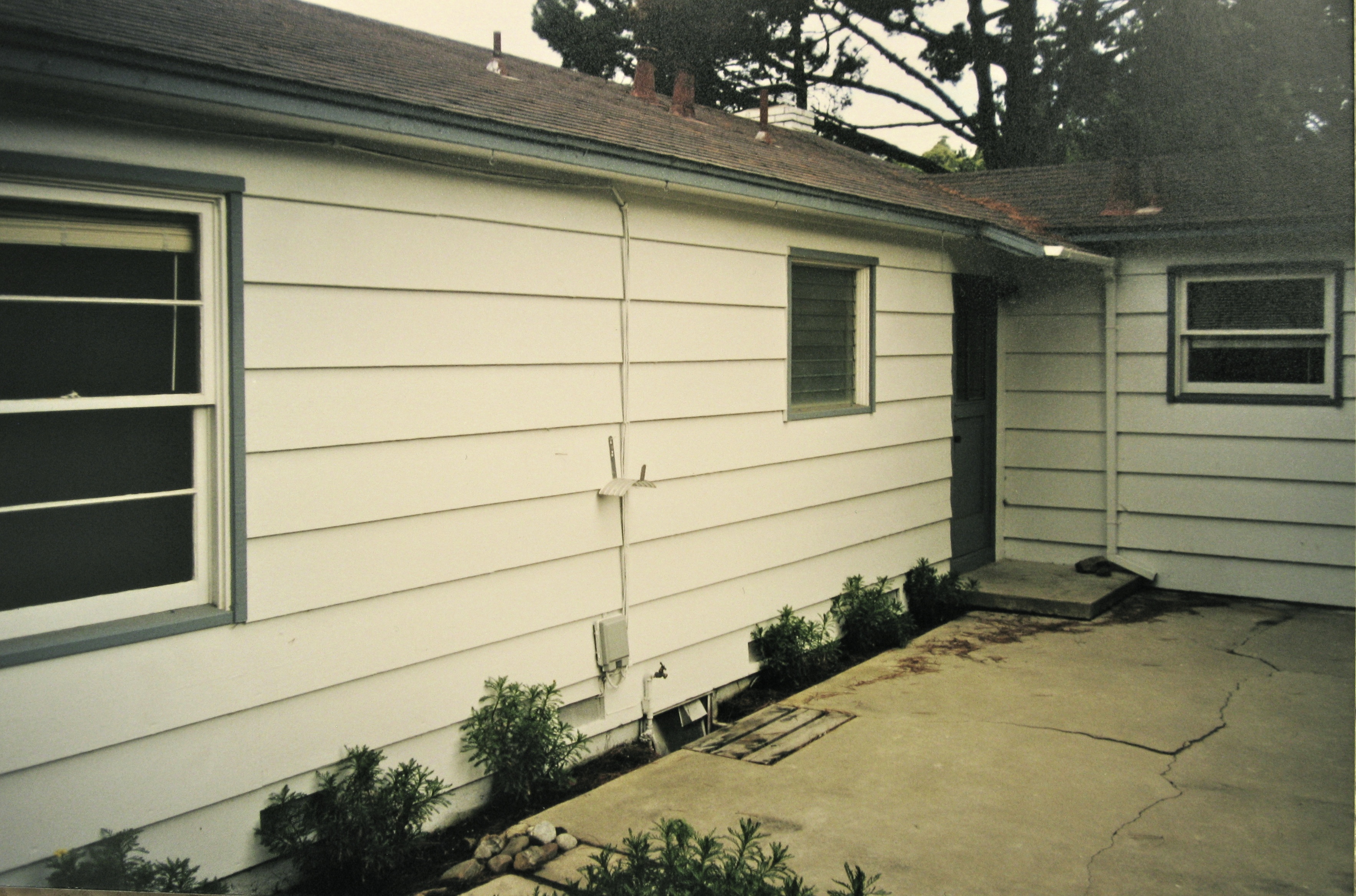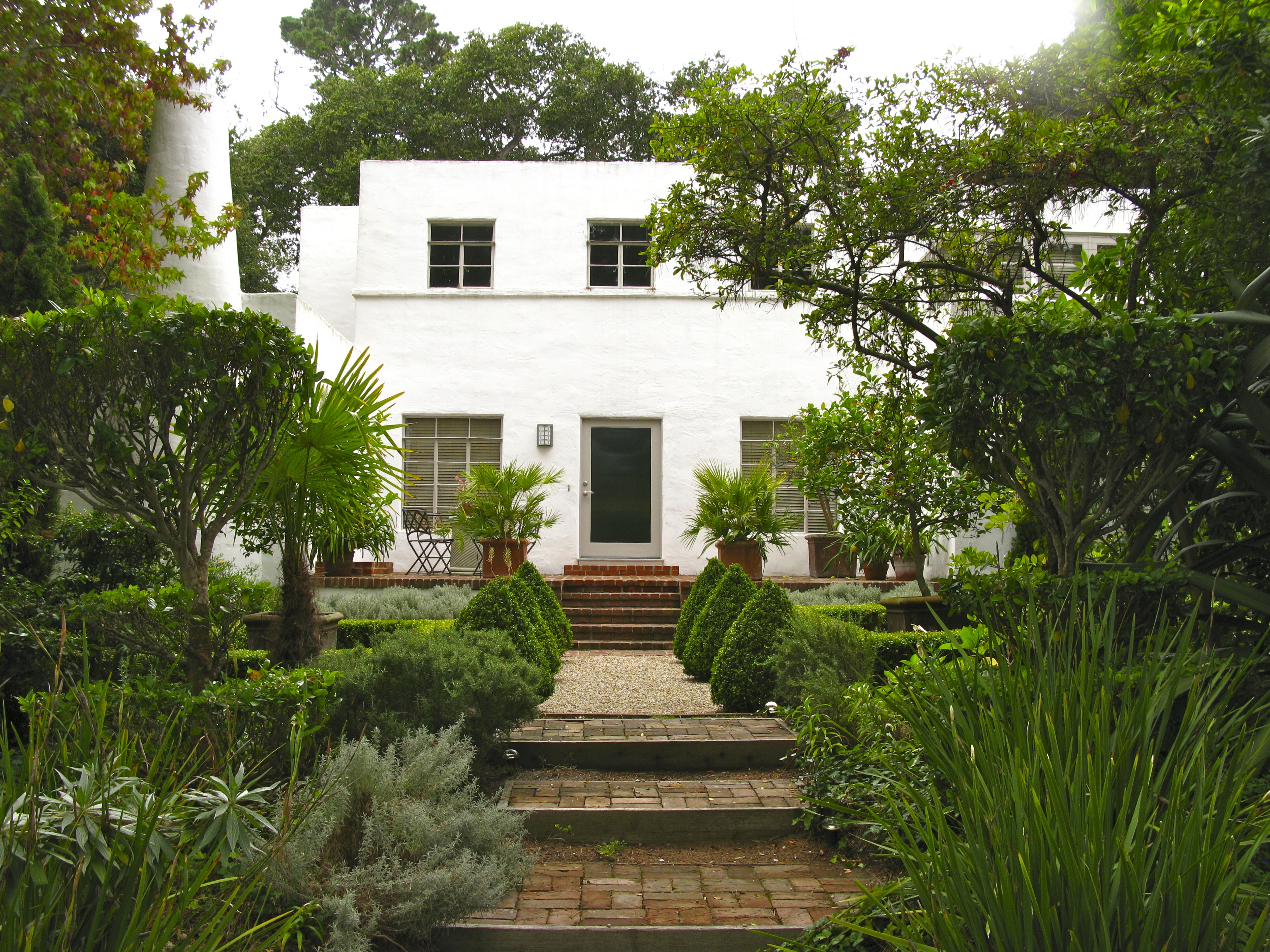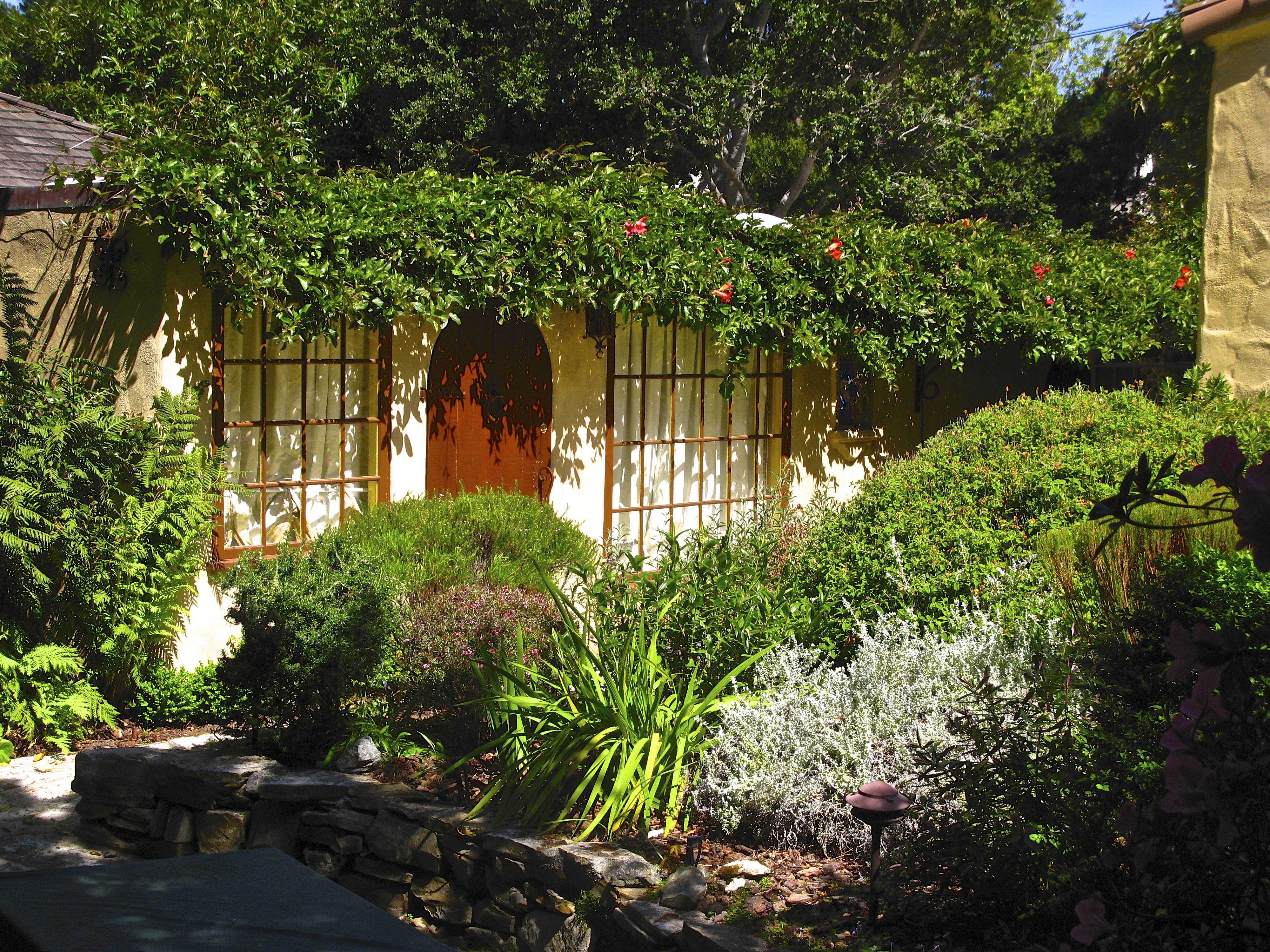 A guest house sits to the west of the main house, its roof covered with trumpet vine.