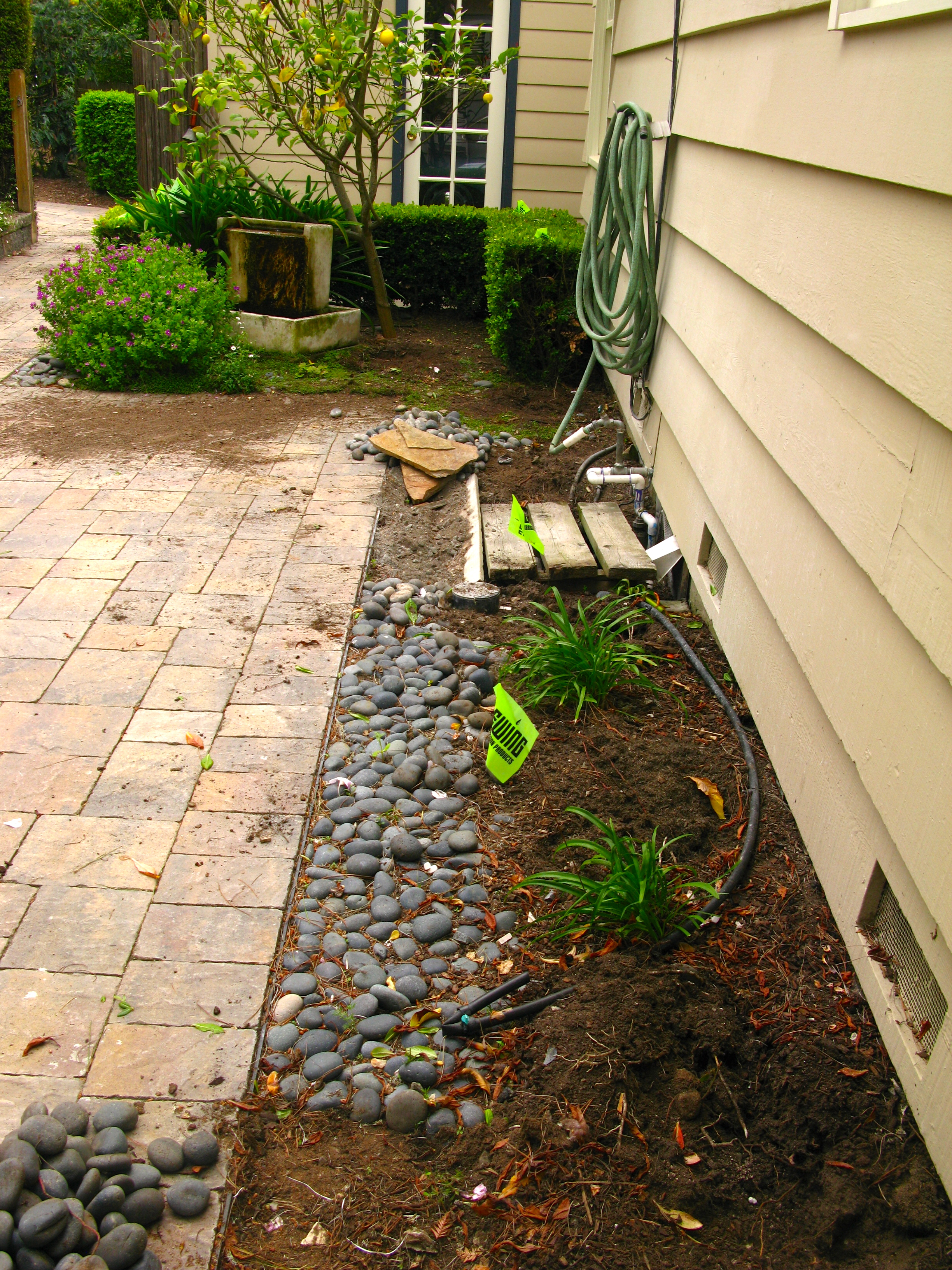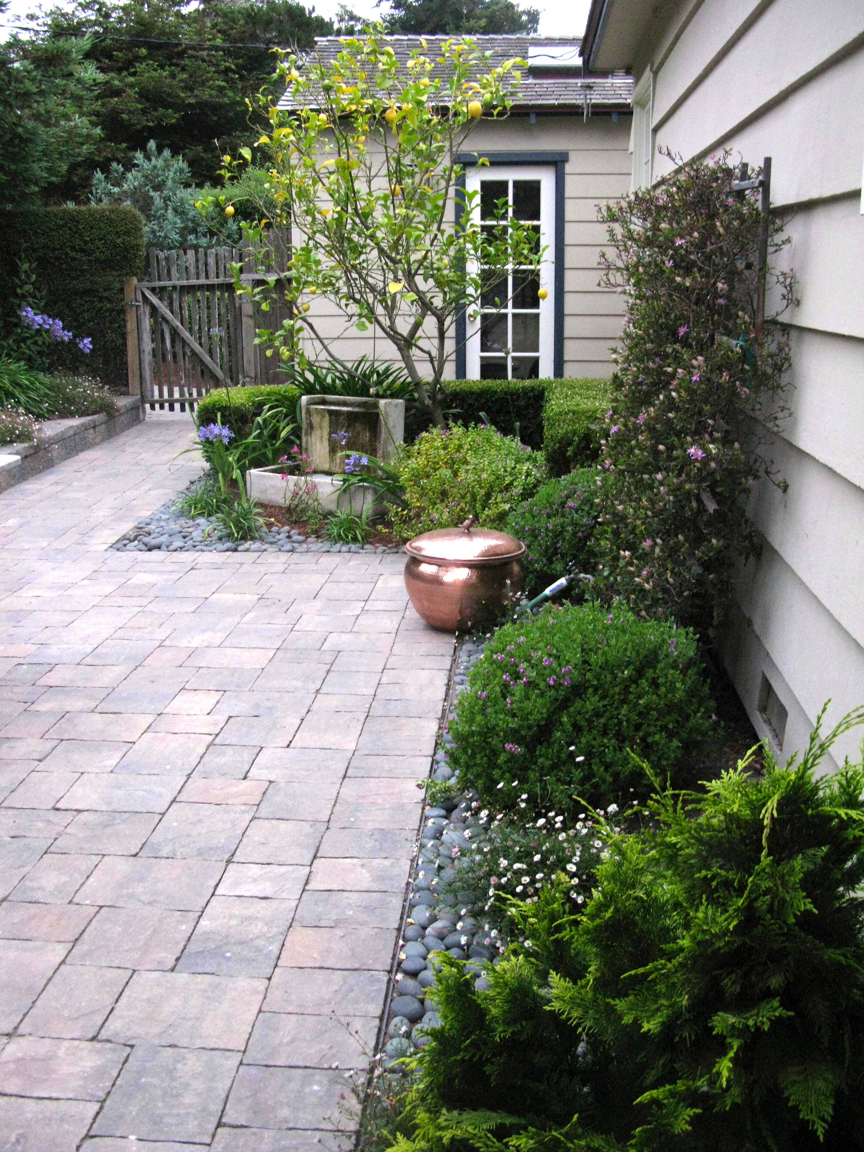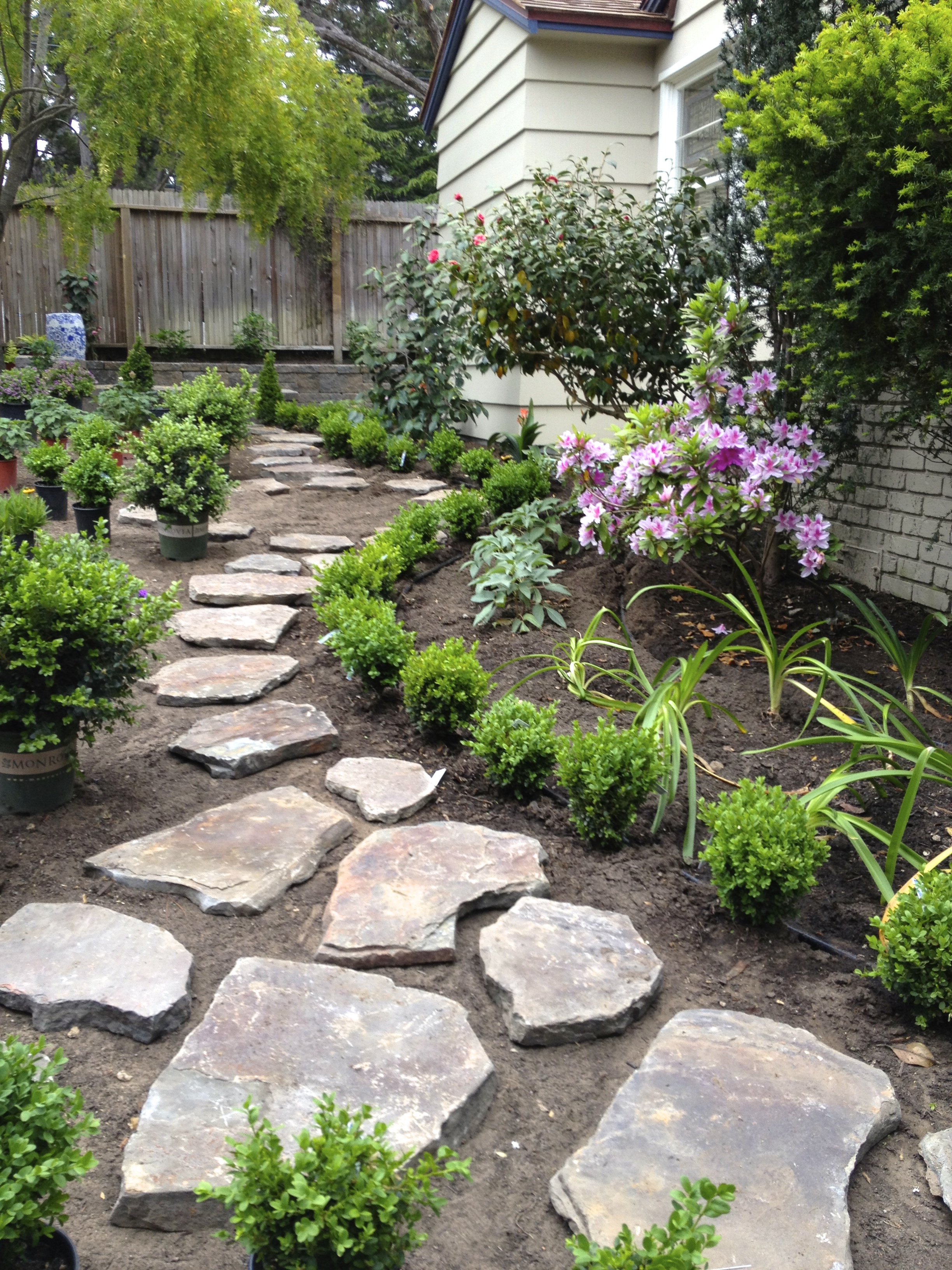 Now the path curves around a planting bed and is made of boxwood lined stones.