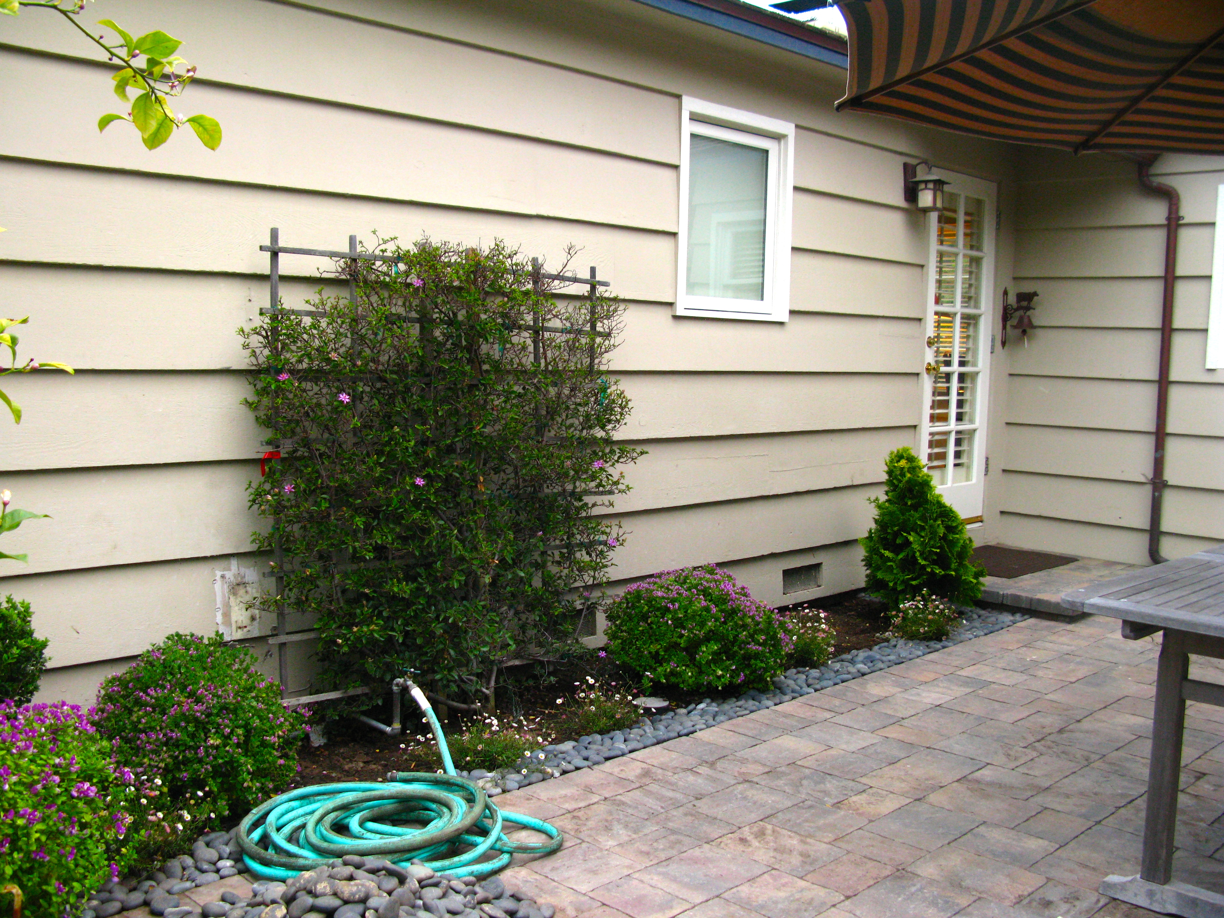 My privacy problem solved by lowering a patio and adding a raised planter. From here I survey both front and side gardens.