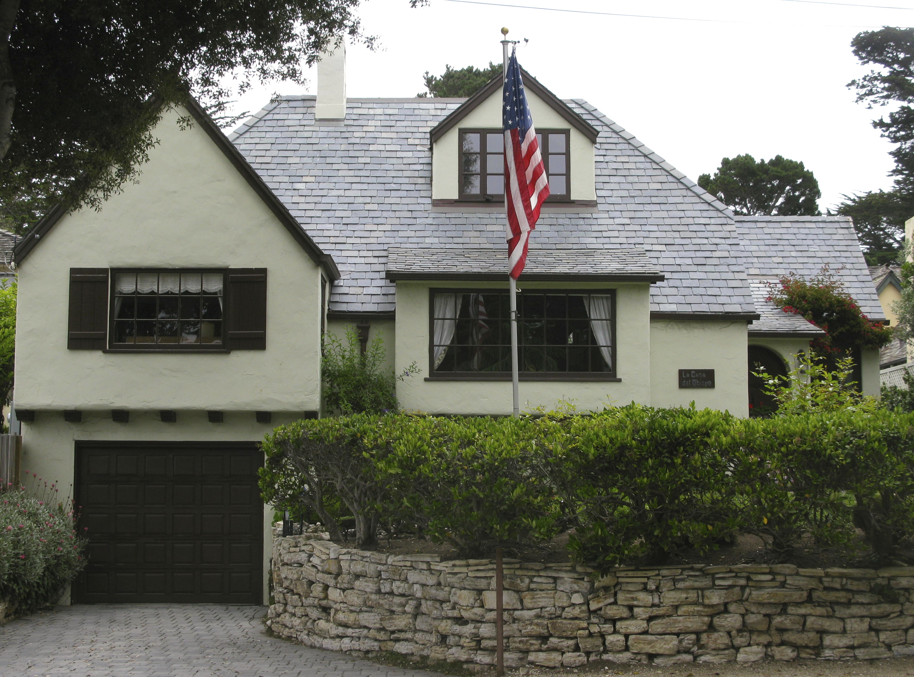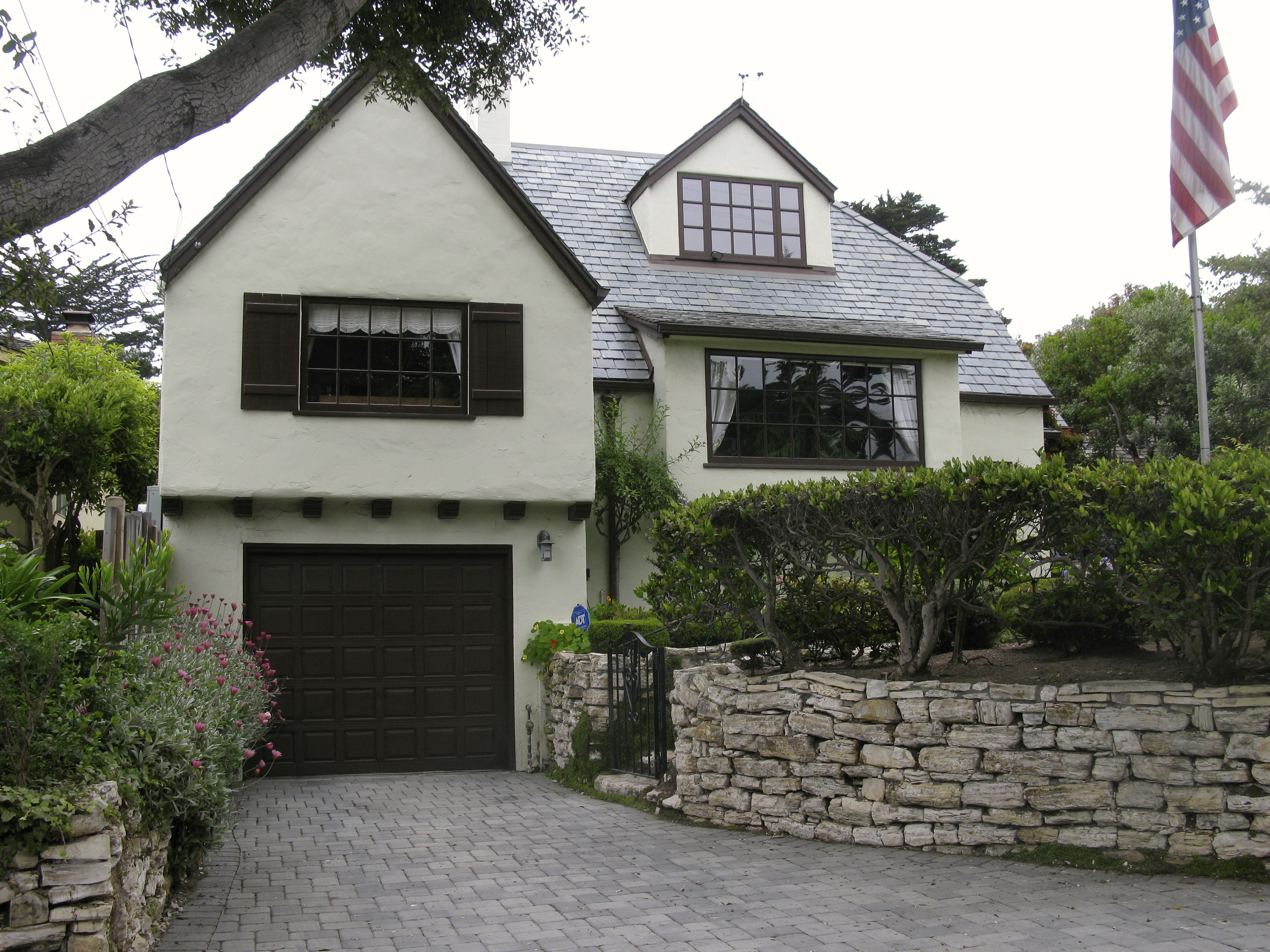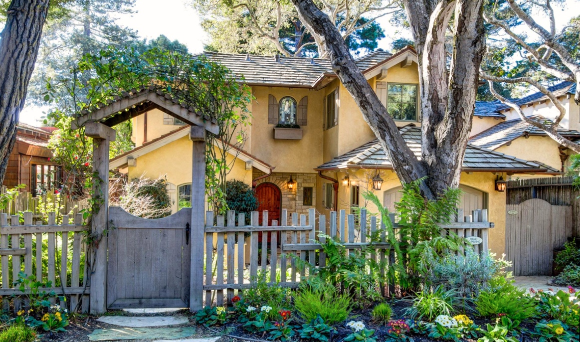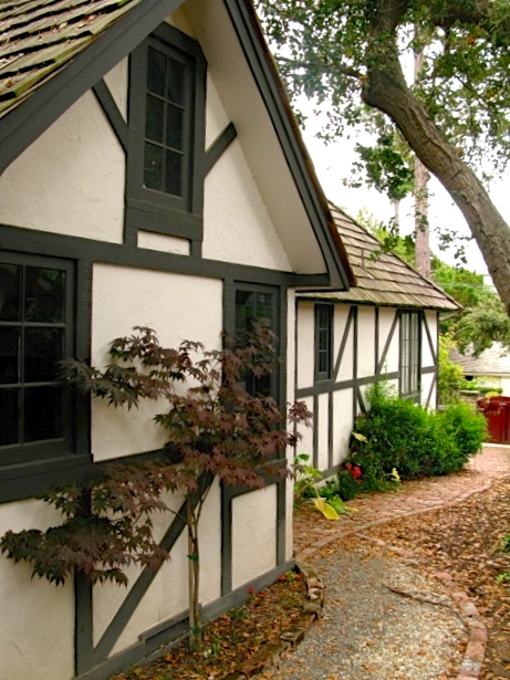 The first name honors the woman who designs the house. She buys the land in 1926 and models the design after her 12 -bedroom Tudor home on the 12th green at Pebble Beach. She scales it down to 4 bedrooms and makes it a rental property .