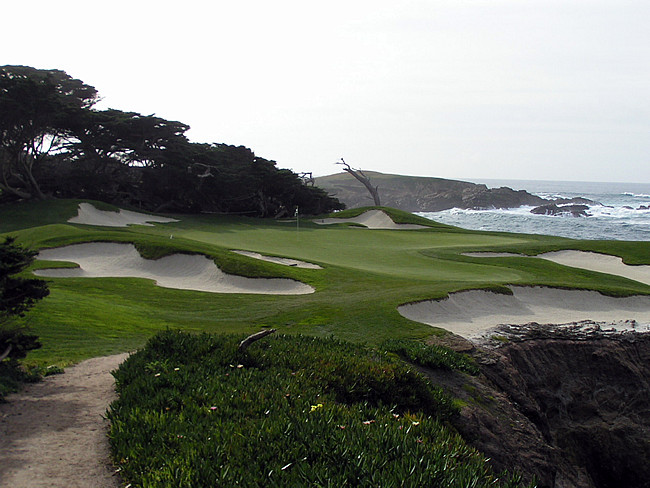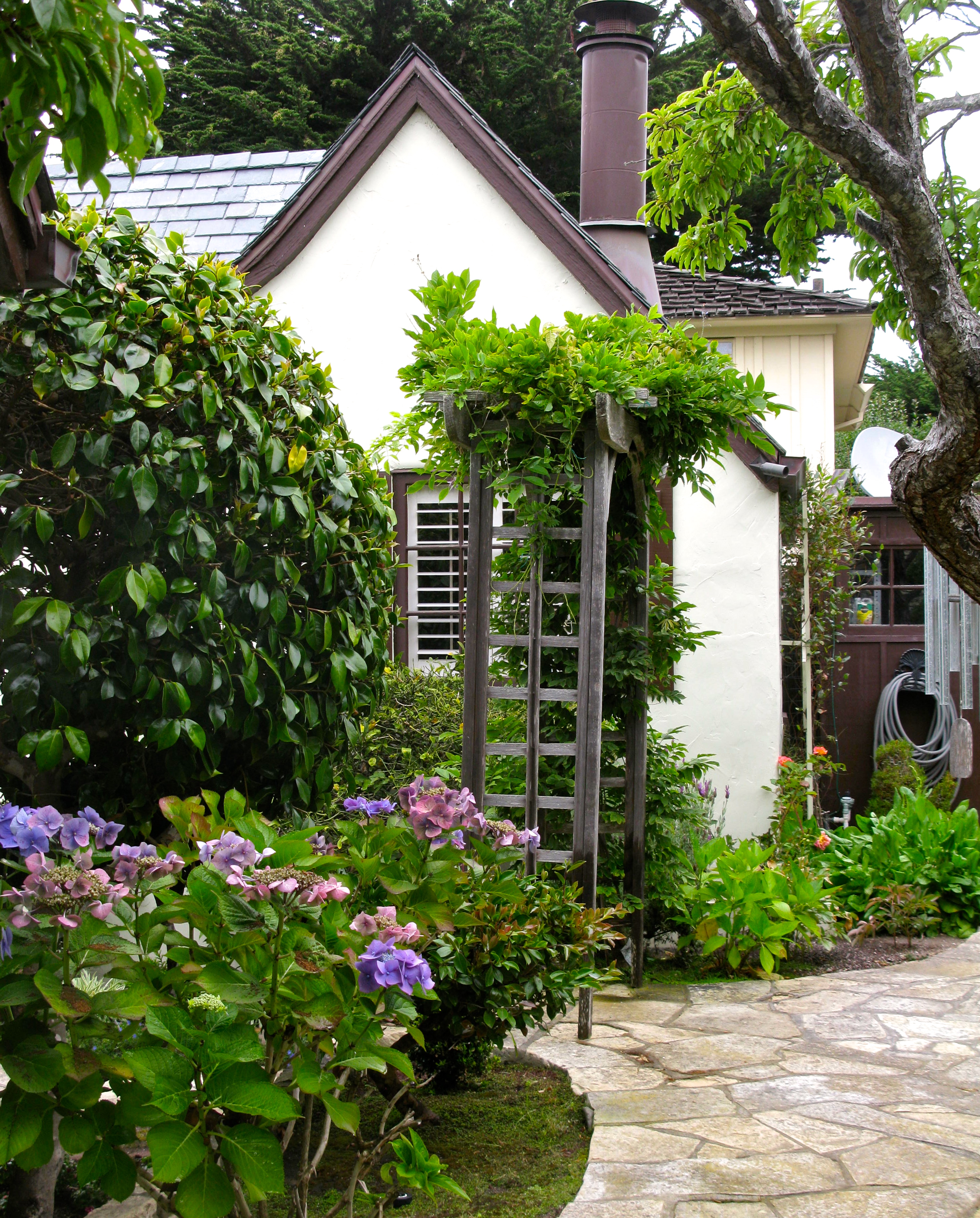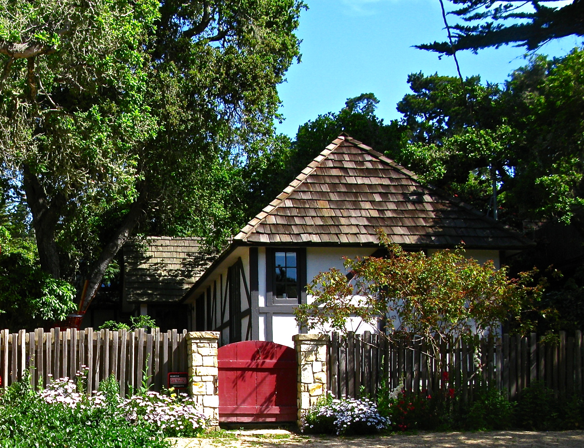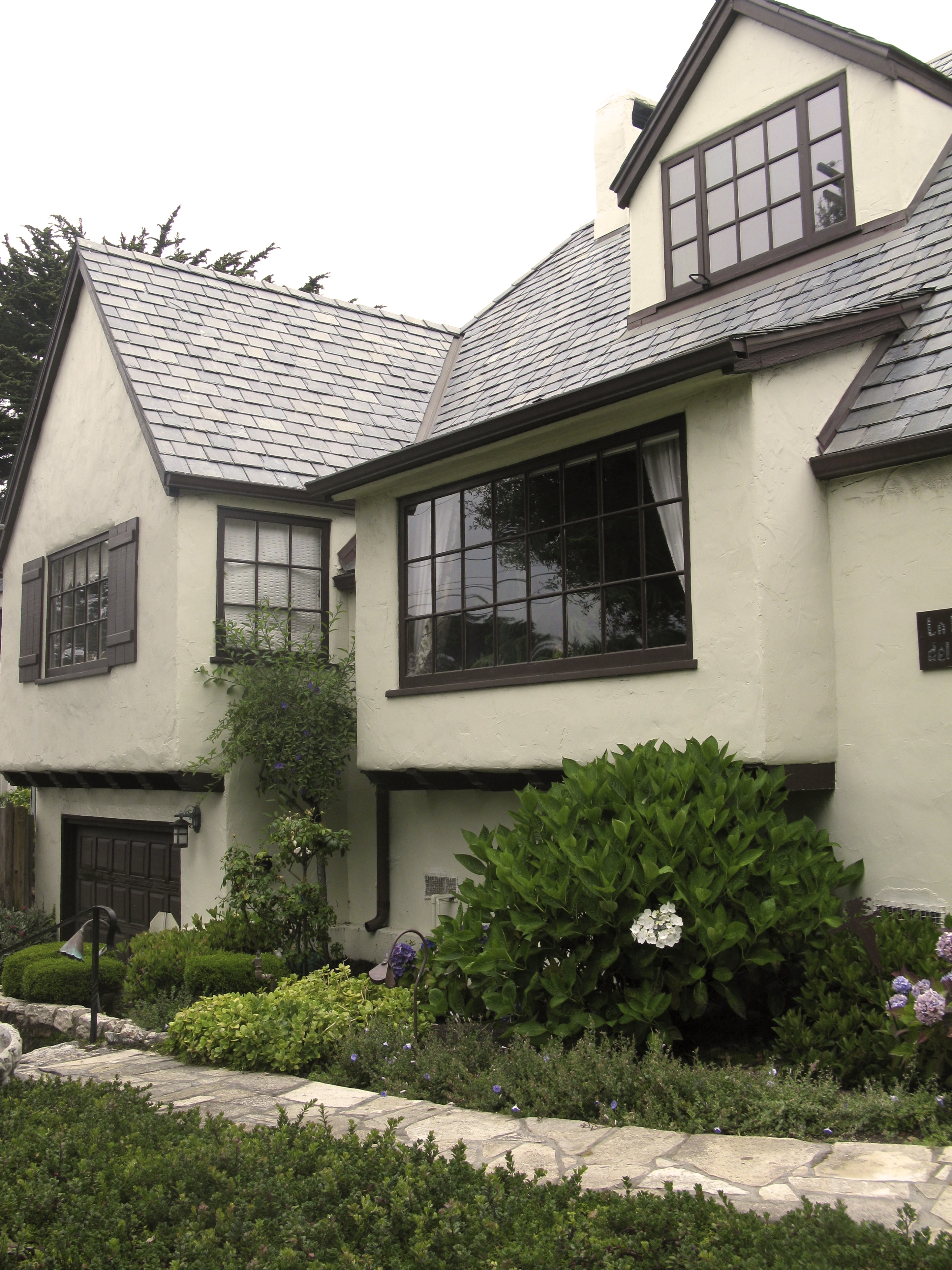 The first name honors the woman who designs the house. She buys the land in 1926 and models the design after her 12 -bedroom Tudor home on the 12th green at Pebble Beach. She scales it down to 4 bedrooms and makes it a rental property .