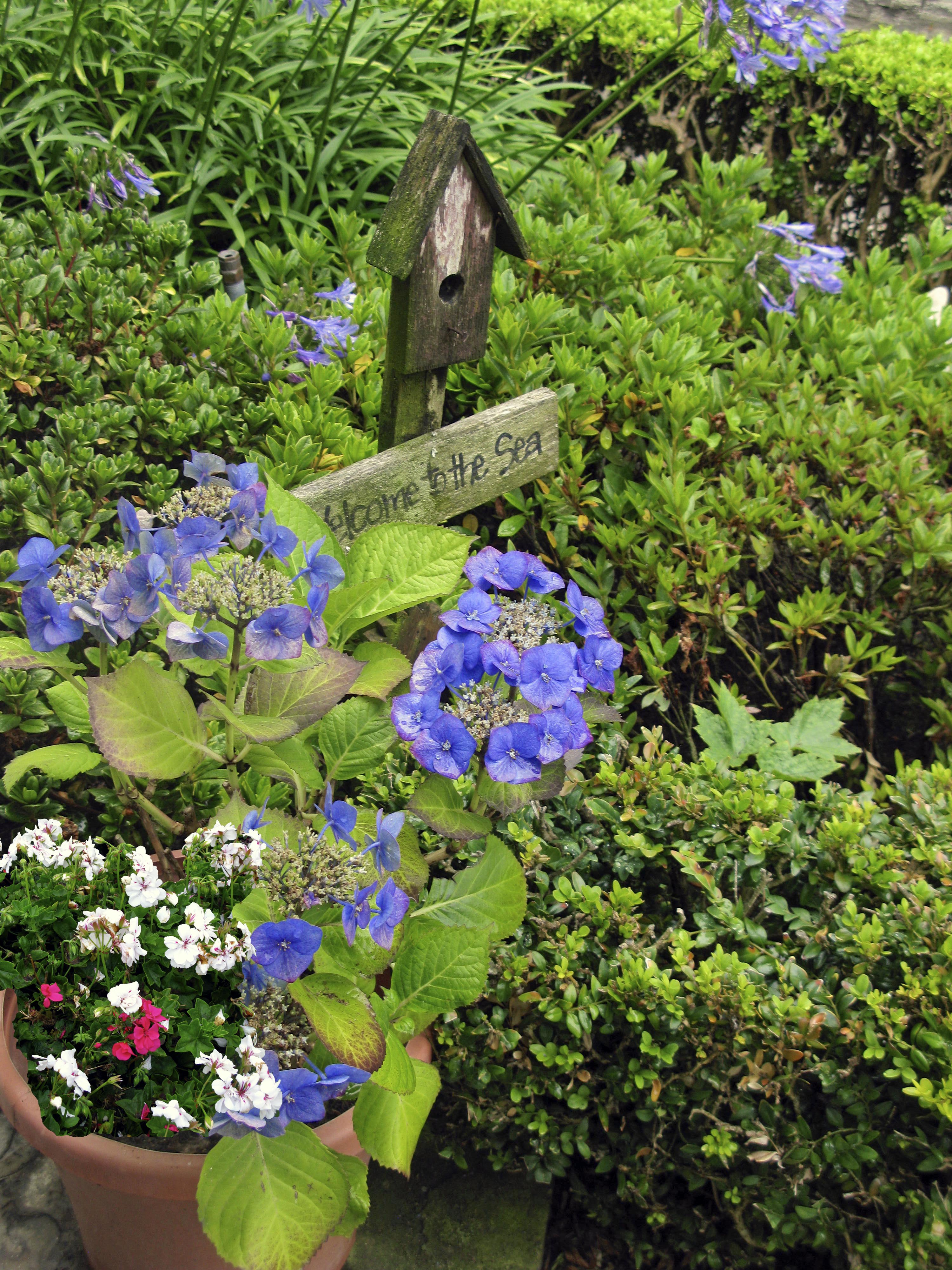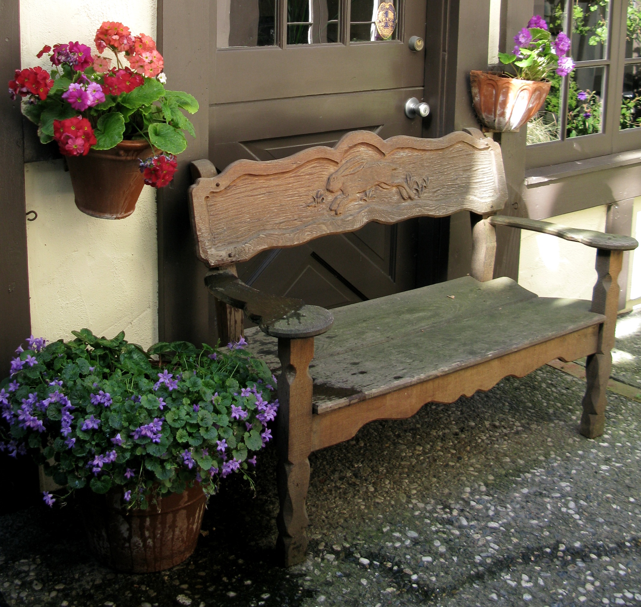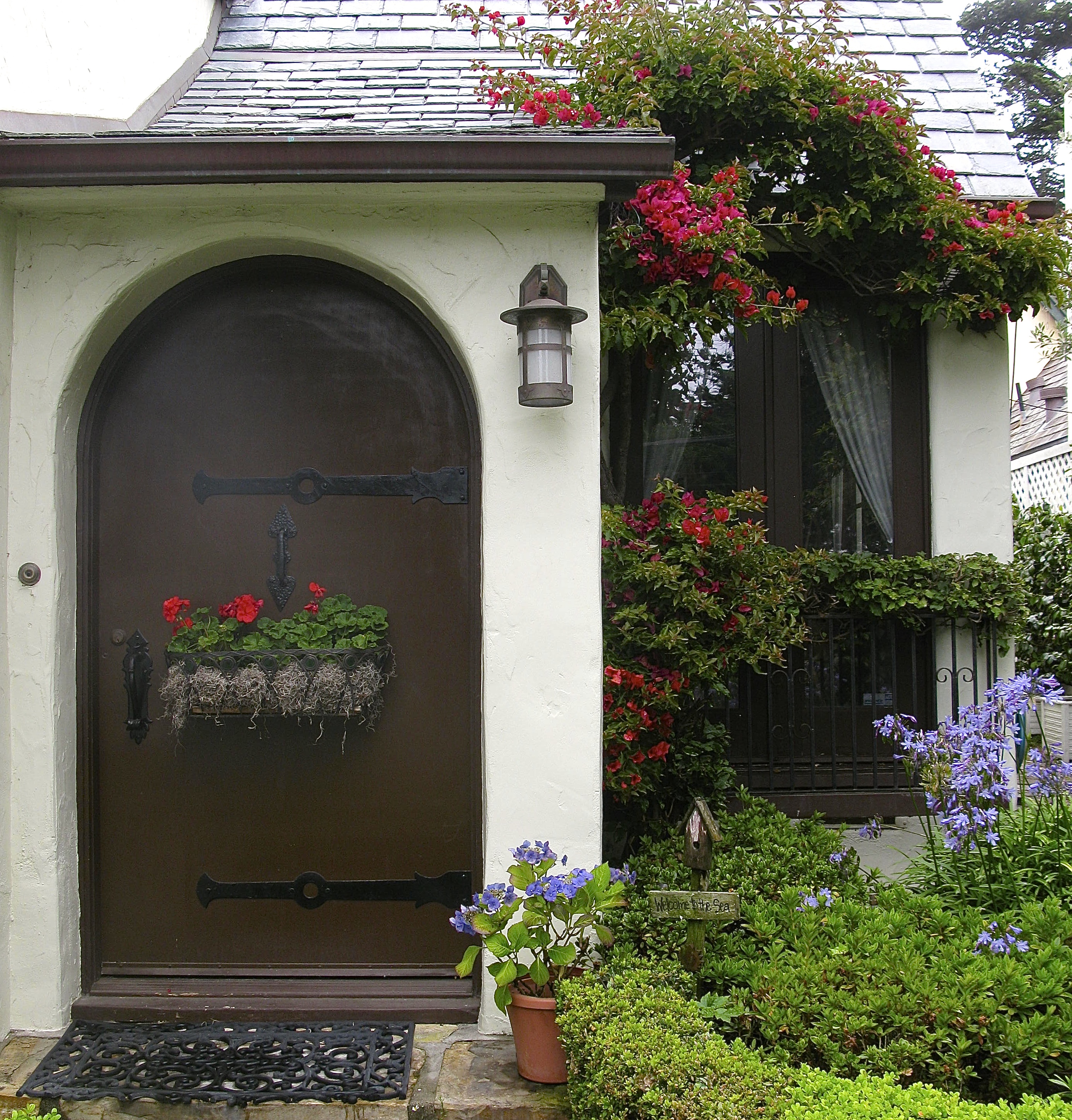 But now all I know is I love the front door with its cheerful basket of geraniums. I knock on the door and then tuck my card in the basket and make my way around the house.