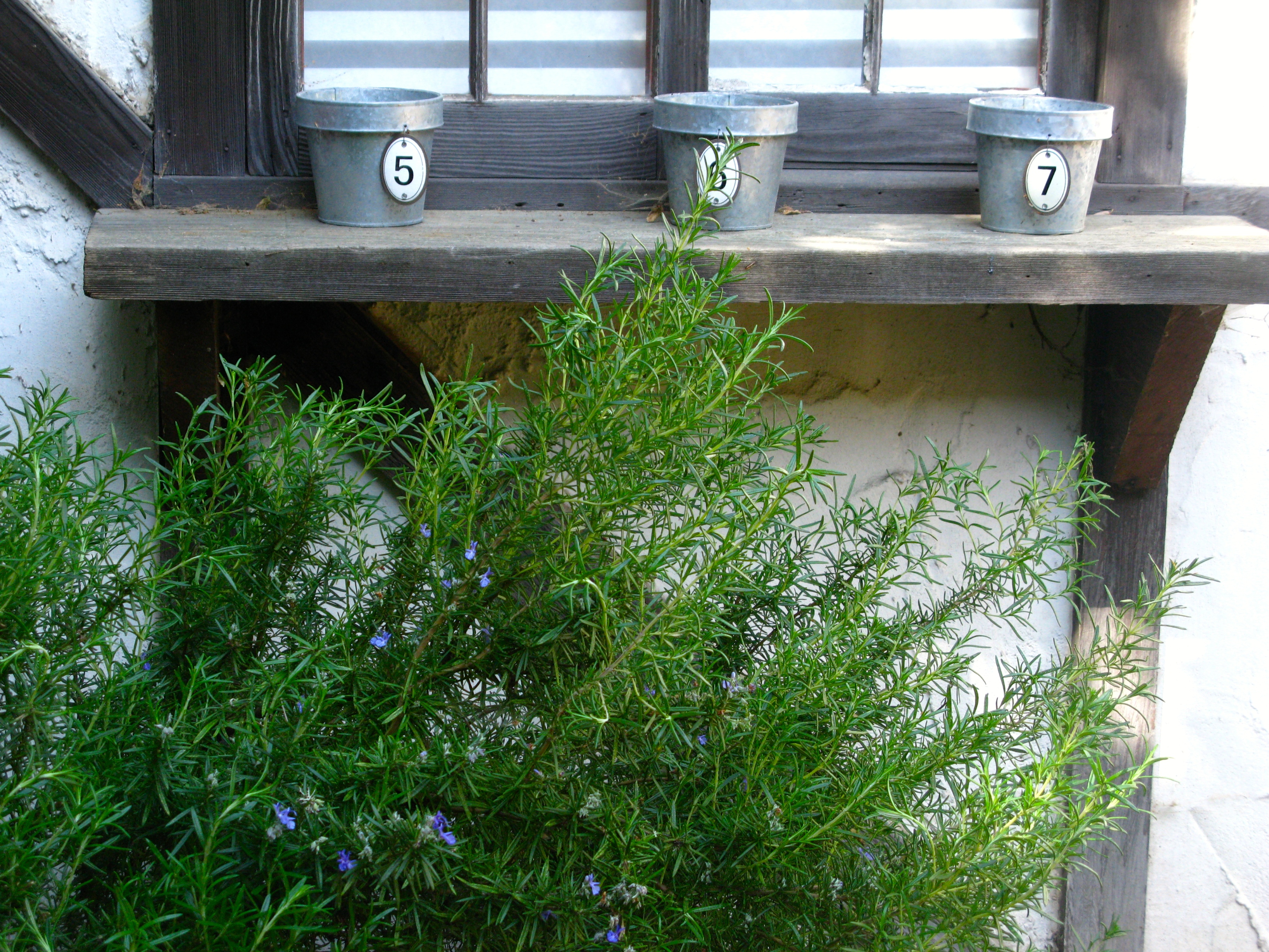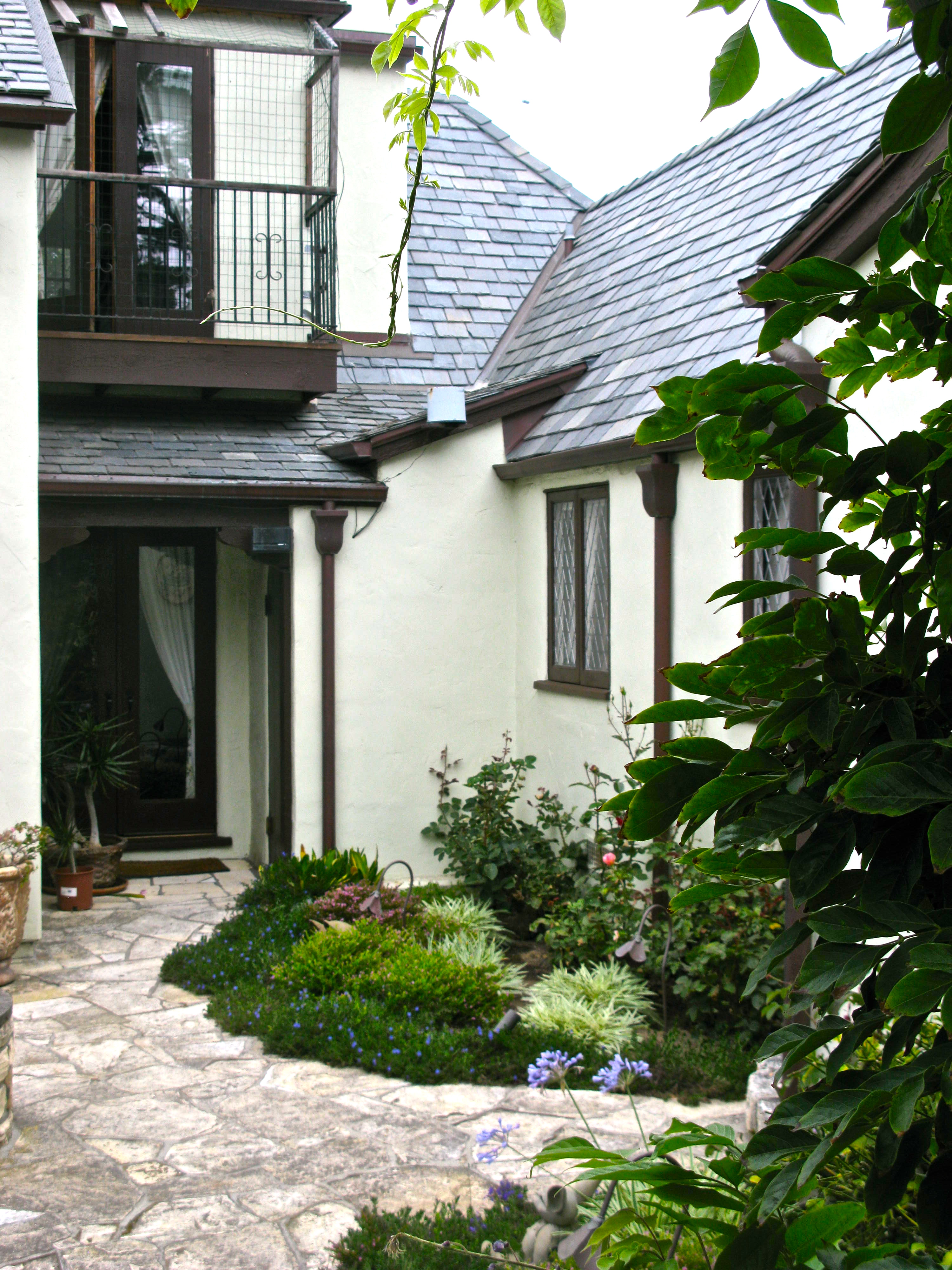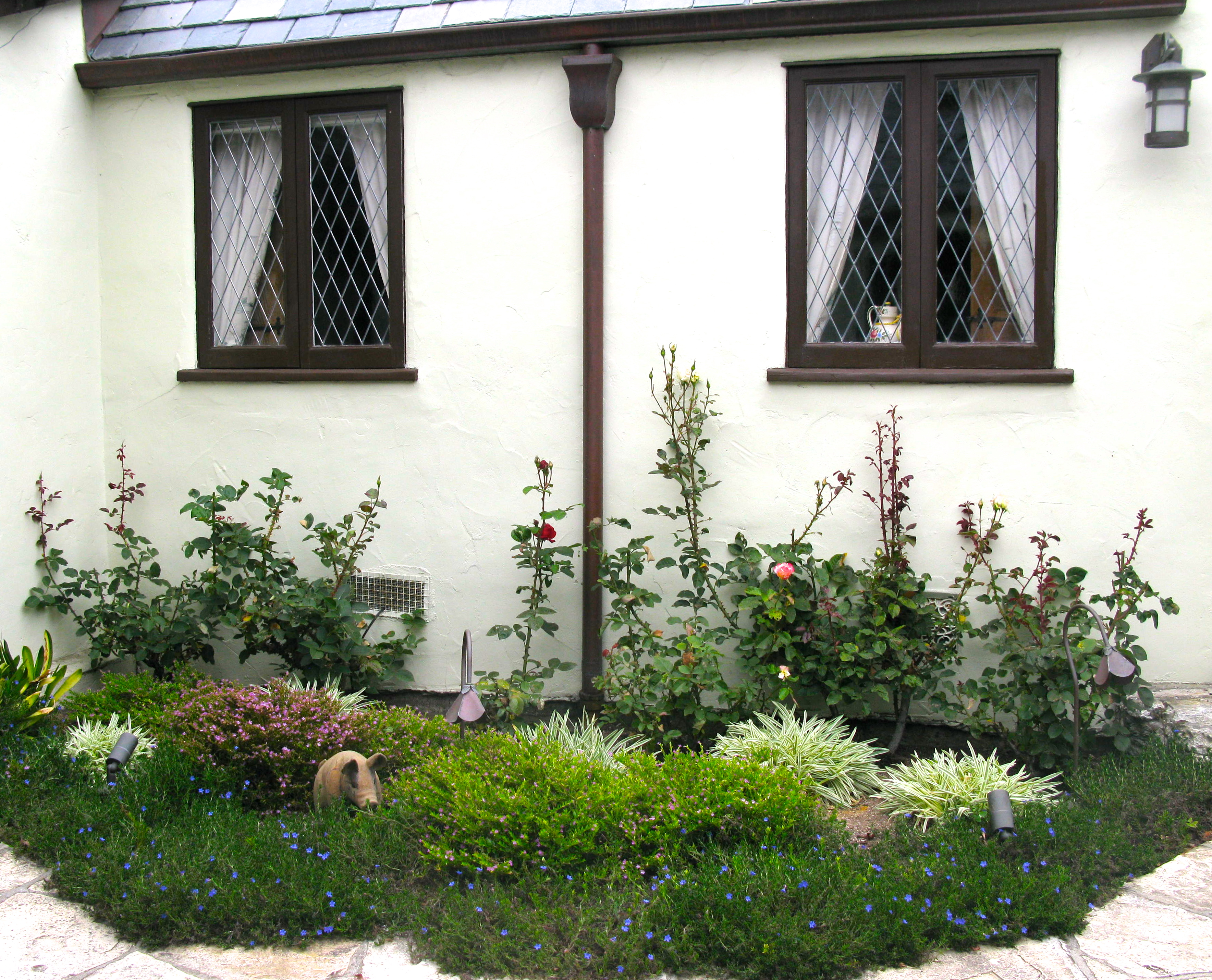 A tiny garden sits under the leaded glass windows
