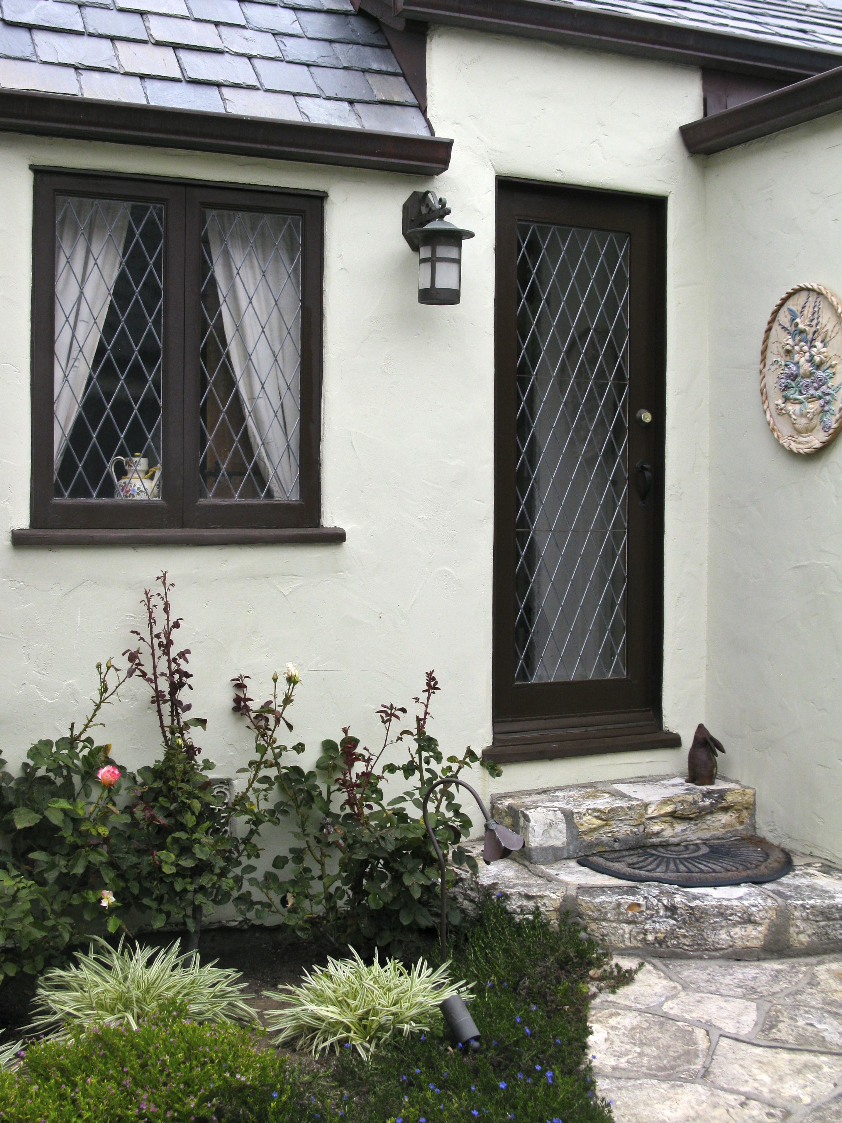 The leaded glass back door is flanked by