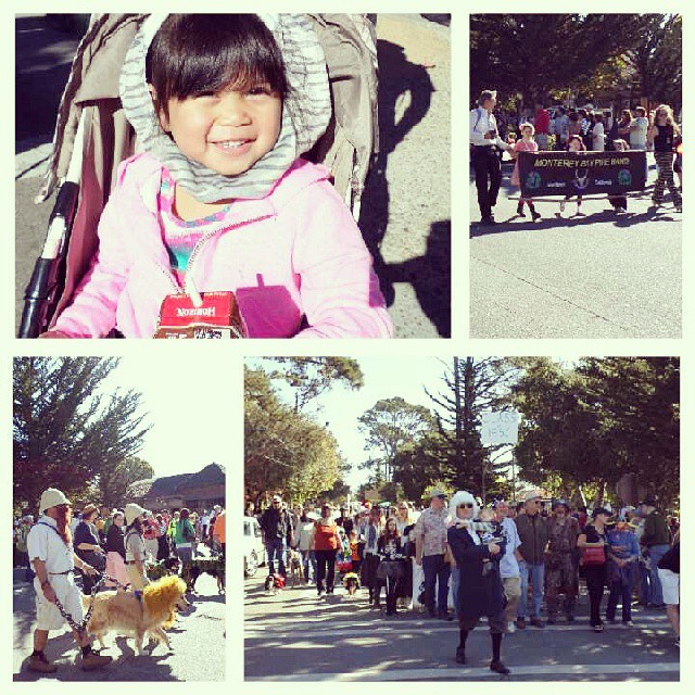 Our little granddaughter parades in her kitty costume in the Halloween Parade and afterward enjoys hot dogs at the Sunset Theater.