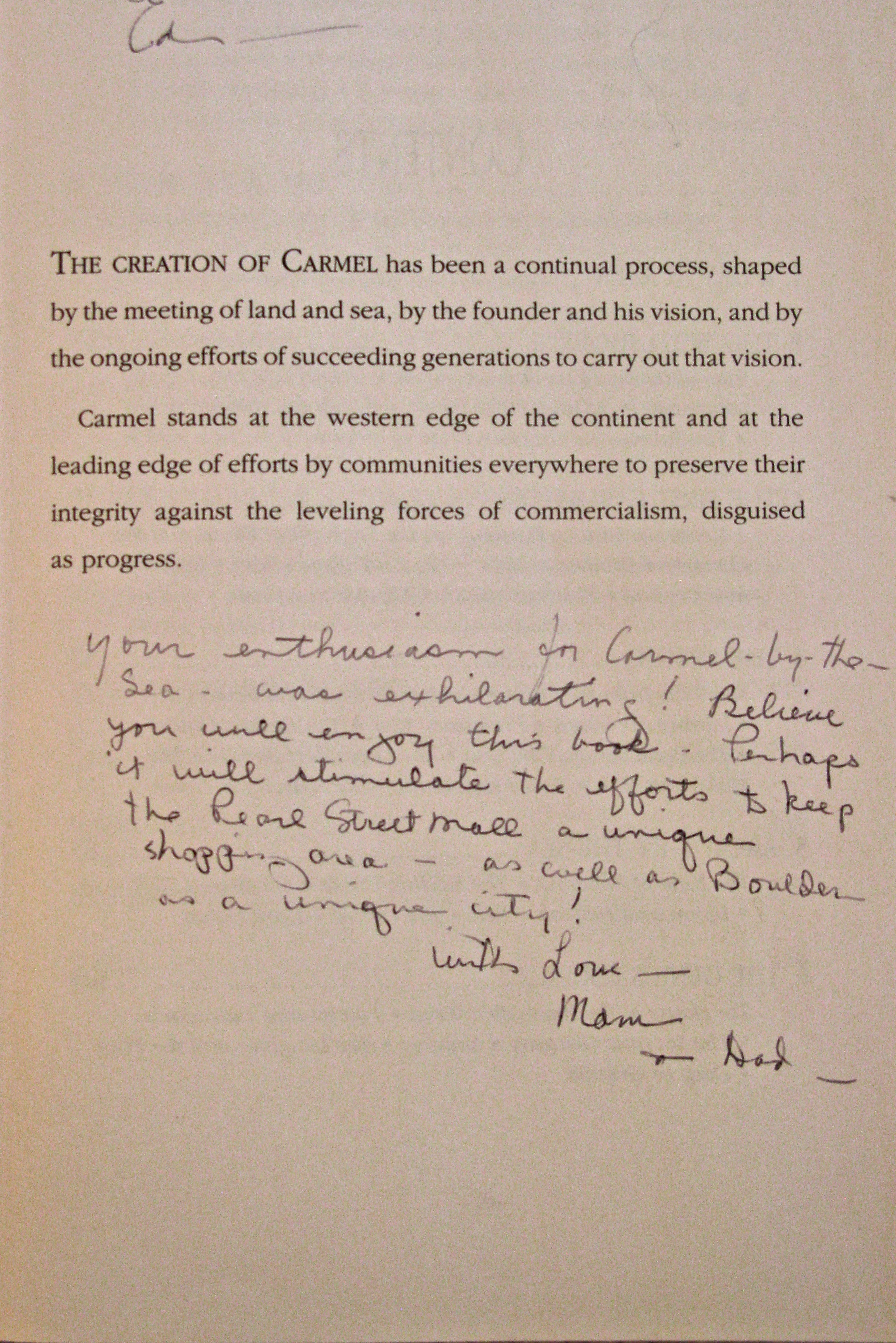 He also lived in Carmel for a time and his daughter Ciji grew up here. She remembers this quote from one of her Dad’s books.