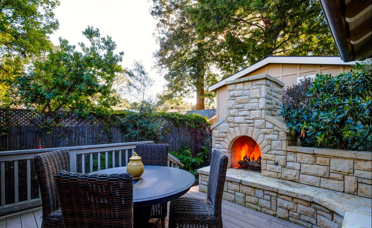 The fireplace is welcoming. Carmel’s temperate climate encourages the use of patios and decks every day.